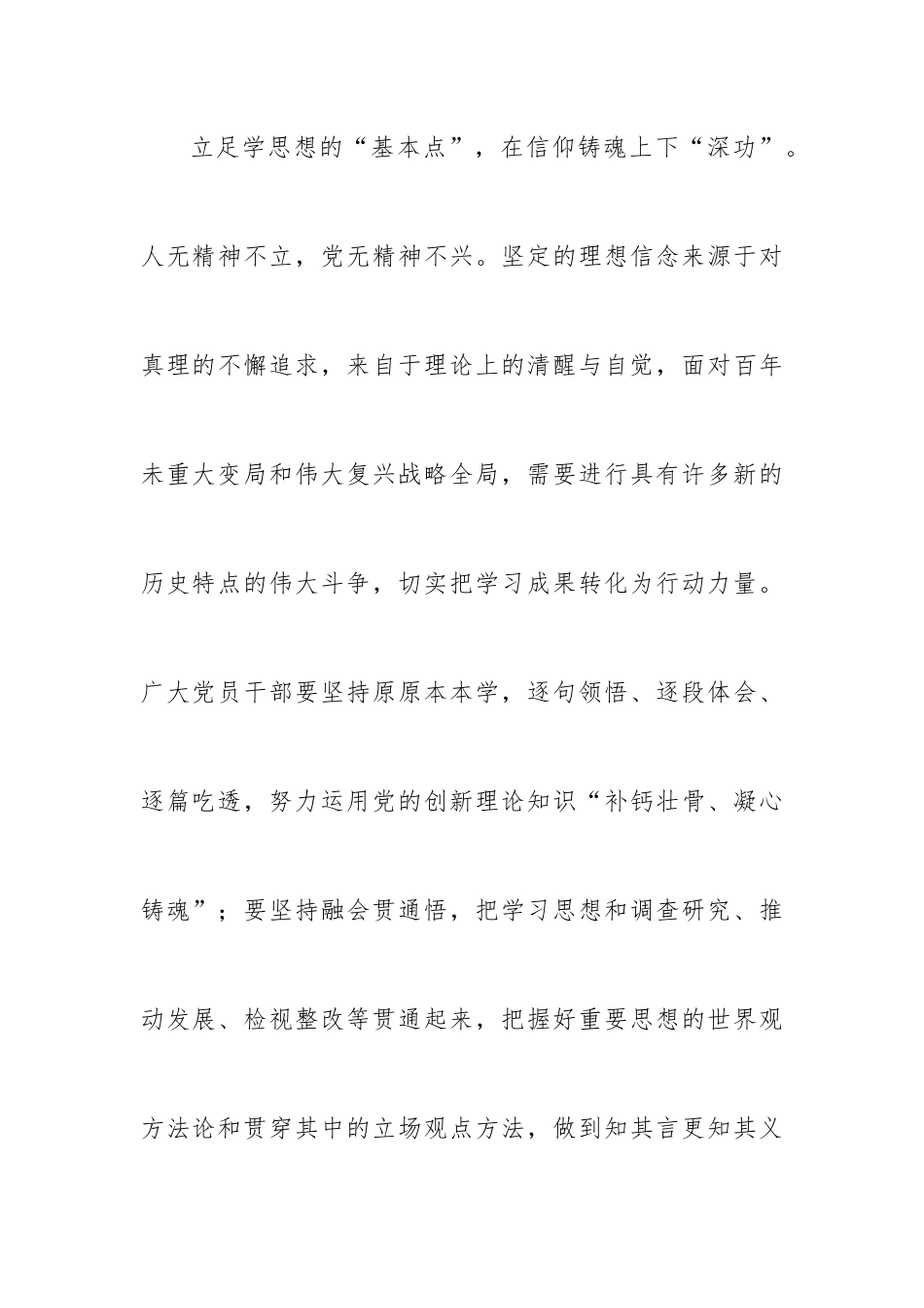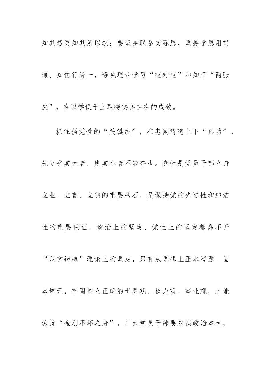 主题教育党课:以学铸魂,要在“点线面”上下功夫同志们:按照主题教育工作安排,今天由我为大家作一堂党课报告,与同志们共同交流。本次党课的主题是以学铸魂,要在“点线面”上下功夫。对党忠诚,是以学铸魂的基本要求,习近平总书记就“以学铸魂”提出明确要求,切实用党的创新理论统一思想、统一意志、统一行动,从思想上正本清源、固本培元为广大党员、干部落实以学铸魂要求指明了方向、提供了遵循。立足学思想的“基本点”,在信仰铸魂上下“深功”。人无精神不立,党无精神不兴。坚定的理想信念来源于对真理的不懈追求,来自于理论上的清醒与自觉,面对百年未重大变局和伟大复兴战略全局,需要进行具有许多新的历史特点的伟大斗争,切实把学习成果转化为行动力量。广大党员干部要坚持原原本本学,逐句领悟、逐段体会、逐篇吃透,努力运用党的创新理论知识“补钙壮骨、凝心铸魂”;要坚持融会贯通悟,把学习思想和调查研究、推动发展、检视整改等贯通起来,把握好重要思想的世界观方法论和贯穿其中的立场观点方法,做到知其言更知其义知其然更知其所以然;要坚持联系实际思,坚持学思用贯通、知信行统一,避免理论学习“空对空”和知行“两张皮”,在以学促干上取得实实在在的成效。抓住强党性的“关键线”,在忠诚铸魂上下“真功”。先立乎其大者,则其小者不能夺也。党性是党员干部立身立业、立言、立德的重要基石,是保持党的先进性和纯洁性的重要保证,政治上的坚定、党性上的坚定都离不开“以学铸魂”理论上的坚定,只有从思想上正本清源、固本培元,牢固树立正确的世界观、权力观、事业观,才能炼就“金刚不坏之身”。广大党员干部要永葆政治本色,通过学习党的历史,弘扬党的优良传统和作风,深入思考其内在规律和有效路径,筑牢对党忠诚的思想之基;要提高政治能力,着力提升保持政治定力、驾驭政治局面、防范政治风险的能力,在大是大非面前始终保持清醒头脑;要锤炼政治担当,敢于向顽疾开刀、向沉疴积弊亮剑,坚决破除利益固化的藩篱,切实做到善始善终、善作善成。强化重实践的“发力面”,在本领铸魂上下“实功”。为学之实,固在践履。实践是检验真理的唯一标准,只有到基层、到实践、到人民中去,才能把主题教育成果转化为服务社会的作用发挥,在一线经风雨长才干,锤炼过硬政治本领、干事本领、服务本领,在各种复杂严峻的斗争中做“行动派”“实干家”。广大党员干部要敢为天下先“想干事”,在思想上同心同向、在行动上高度自觉,“干”字当头做出组织满意、群众认可的事情和业绩;要重任敢担当“能干事”,不断锤炼自己不畏艰险、不惧苦难的意志,主动改进应变克服本领恐慌,在干事创业“硬担子”面前真正扛得起来、顶得过去;要事事有着落“干成事”,在机遇面前主动出击,不犹豫、不观望,在困难面前迎难而上,不推诿、不逃避,脚踏实地干成人民满意的事。艰难方显勇毅,磨砺始得玉成。面对战略机遇和风险挑战并存的复杂严峻时期,广大党员干部要牢记国之大者尽“关键小事”之践行,怀"国之大者”之深远,为国分忧、为国解难、为国尽责;要发扬斗争精神,砥砺敢于斗争的风骨和气节、淬炼无惧无畏的胆魄和意志,承载起民族的重托和人民的期盼;要敢于自我革命,以人为镜、以事为鉴,破除“思维定式”“思想桎梏”,努力向着新时代新征程大步迈进,赓续社会主义现代化国家建设的华丽篇章。