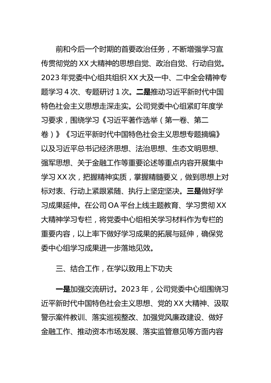 国企公司党委中心组2023年度学习情况报告2023年,XX党委中心组坚持以习近平新时代中国特色社会主义思想为指导,认真推动学习贯彻习近平新时代中国特色社会主义思想主题教育,深入学习宣传贯彻党的XX大精神,全面落实上级党组织有关要求,紧跟公司改革转型发展形势,为推动公司高质量发展提供强大思想保证。现将学习情况报告如下。一、把牢方向,在强化学习上下功夫一是明确学习重点。制定中心组《2023年专题学习重点内容安排》,确定十个方面重点学习内容,在保障专题全覆盖的基础上着力提高学习效果。二是坚定政治站位。制定公司党委《贯彻落实意识形态工作责任制实施细则》,对完善、落实党委中心组学习制度做出了进一步要求,不断提高政治判断力、政治领悟力、政治执行力。三是推动主题教育走深走实。开展学习贯彻习近平新时代中国特色社会主义思想主题教育,党委中心组先学一步、学深一层;组织召开专题民主生活会,党委班子成员严肃对照查摆问题;组织召开总结大会,总结部署相关工作。二、紧跟形势,在突出重点上下功夫一是深入学习宣传贯彻党的XX大及一中、二中全会精神。公司党委中心组将学习宣传贯彻党的XX大精神作为当前和今后一个时期的首要政治任务,不断增强学习宣传贯彻党的XX大精神的思想自觉、政治自觉、行动自觉。2023年党委中心组共组织XX大及一中、二中全会精神专题学习4次、专题研讨1次。二是推动习近平新时代中国特色社会主义思想走深走实。公司党委中心组紧盯年度学习要求,围绕学习《习近平著作选举(第一卷、第二卷)》《习近平新时代中国特色社会主义思想专题摘编》以及习近平总书记经济思想、法治思想、生态文明思想、强军思想、关于金融工作等重要论述等重点内容开展集中学习XX次,把握精神实质,掌握精髓要义,做到思想上对标对表、行动上紧跟紧随、执行上坚定坚决。三是做好学习成果延伸。在公司OA平台上线主题教育、学习贯彻XX大精神学习专栏,将党委中心组相关学习材料作为专栏的重要内容,以上率下做好学习成果的拓展与延伸,确保党委中心组学习成果进一步落地见效。三、结合工作,在学以致用上下功夫一是加强交流研讨。2023年,公司党委中心组围绕习近平新时代中国特色社会主义思想、党的XX大精神、汲取警示案件教训、落实巡视整改、加强党风廉政建设、做好金融工作、推动资本市场发展、落实监管意见等方面内容开展交流研讨XX次,党委委员分别在一定范围内讲授党课1次,党委书记主持召开青年员工交流座谈会XX次,进一步凝聚高质量发展的奋进力量。二是推动巡视问题整改。公司党委坚持对标对表、同题共答,开展加强理论学习与政治建设、整治形式主义官僚主义和不担当、不作为专项行动,以思想铸魂、政治引领为先导,从严从实推动XX项问题对账销号。截至2023年12月底,理论学习已完成“补课”和“加码”,XX巡视反馈的“XX”有关问题完成整改,公司整改完成率达到XX%。三是以知促行推动改革发展。党委中心组成员结合分管工作,从党的建设和业务发展两个方面入手,深入基层开展调研,撰写调研报告,提出解决实际问题的措施。2024年,公司党委将进一步提高政治站位,坚持把党委中心组学习作为重要工作摆在突出位置,谋划好、制定好年度学习计划,认真研究思考新形势下加强理论武装的特点规律和思路招法,以走在前、作表率的鲜明态度和坚定决心,不断把理论学习中心组学习引向深入,把学习成果切实转化为捍卫“两个确立”、增强“四个意识”、坚定“四个自信”、做到“两个维护”的实际行动,转化为推动公司改革转型发展的实际成效!免责声明:文稿来源网络整理,版权归原作者所有。若侵犯了您的合法权益,请作者持权属证明与本站联系,我们将及时更正、删除!谢谢!