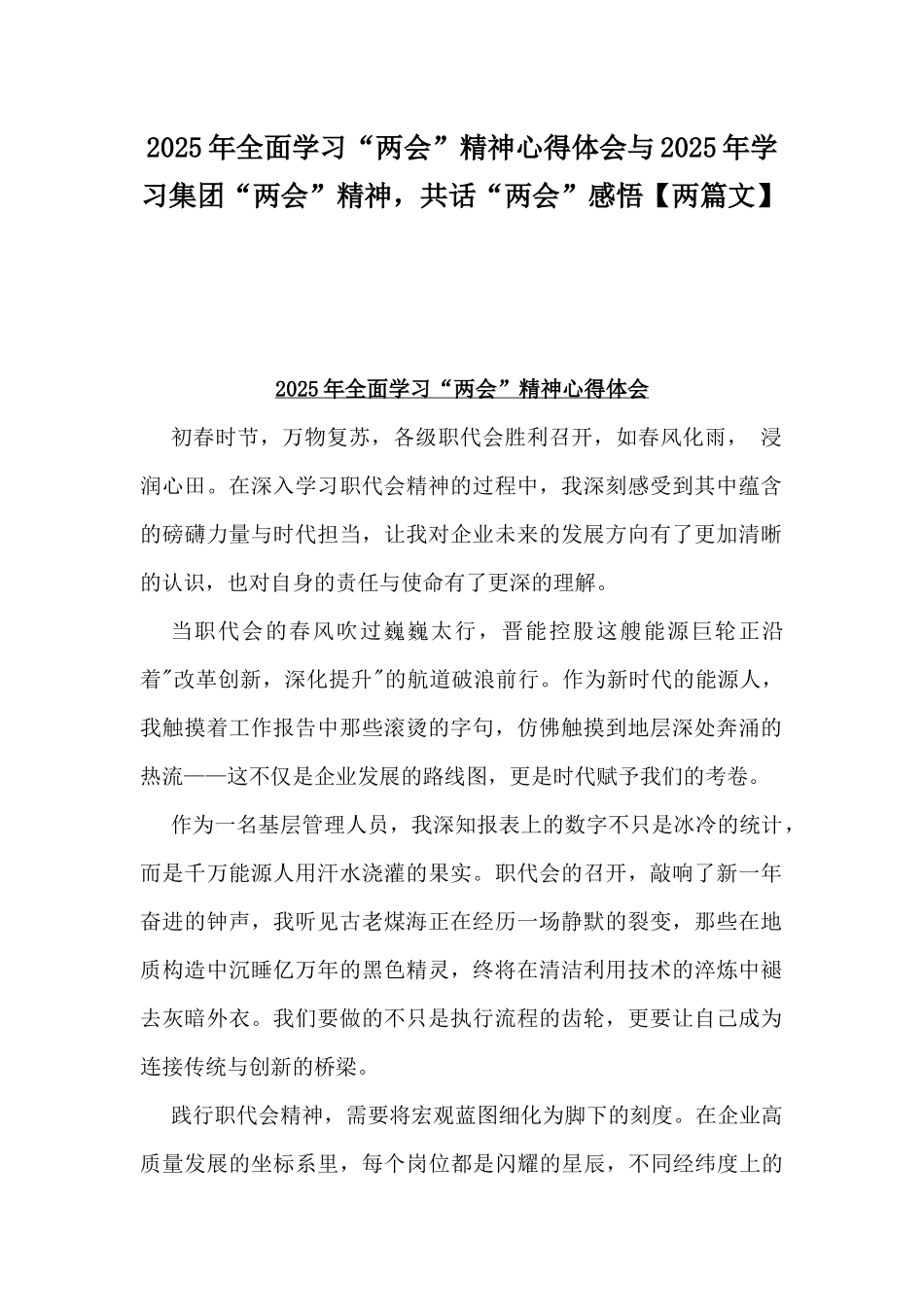 2025年全面学习“两会”精神心得体会与2025年学习集团“两会”精神,共话“两会”感悟【两篇文】2025年全面学习“两会”精神心得体会初春时节,万物复苏,各级职代会胜利召开,如春风化雨,浸润心田。在深入学习职代会精神的过程中,我深刻感受到其中蕴含的磅礴力量与时代担当,让我对企业未来的发展方向有了更加清晰的认识,也对自身的责任与使命有了更深的理解。当职代会的春风吹过巍巍太行,晋能控股这艘能源巨轮正沿着"改革创新,深化提升"的航道破浪前行。作为新时代的能源人,我触摸着工作报告中那些滚烫的字句,仿佛触摸到地层深处奔涌的热流——这不仅是企业发展的路线图,更是时代赋予我们的考卷。作为一名基层管理人员,我深知报表上的数字不只是冰冷的统计,而是千万能源人用汗水浇灌的果实。职代会的召开,敲响了新一年奋进的钟声,我听见古老煤海正在经历一场静默的裂变,那些在地质构造中沉睡亿万年的黑色精灵,终将在清洁利用技术的淬炼中褪去灰暗外衣。我们要做的不只是执行流程的齿轮,更要让自己成为连接传统与创新的桥梁。践行职代会精神,需要将宏观蓝图细化为脚下的刻度。在企业高质量发展的坐标系里,每个岗位都是闪耀的星辰,不同经纬度上的奋斗者,都将用各自的方式在时光锦缎上绣出使命的纹样,这里没有惊天动地的传奇,只有千万双手共同托举的微光成炬。回望父辈们用矿灯照亮的岁月长河,今天的我们正站在历史与未来的交汇点。从百米井巷到云端机房,从轰鸣车间到静谧实验室,新时代的能源人正在用不同的方式诠释同一个答案。当焊枪亲吻钢铁的瞬间,当代码唤醒沉睡的矩阵,当经验与青春碰撞出火花的刹那,职代会精神便有了千姿百态的生动注脚。当职代会的精神化作矿井中永不停歇的机器轰鸣,迸射的汗水正在浩瀚煤海中抽穗扬花,我愿做那束穿透地层的光,温暖每一个奋斗者心中的希望。在这片生长着黑色太阳的土地上,我们终将以管理创新为犁,耕耘出高质量发展的春天。这是属于奋斗者的叙事诗,每个平凡的岗位都是不凡的舞台,每滴辛勤的汗水都在浇筑企业长青的基业。在这幅壮阔的时代画卷上,我们既是执笔人,亦是画中景,共同编织着”建设世界一流企业"的锦绣长卷。2025年学习集团“两会”精神,共话“两会”感悟1090字例文公司“两会”成果丰硕,两个报告实事求是地总结回顾了过去一年所取得的成绩,深入剖析了当下面临的内外部形势,精准指出了集团在可持续发展道路上仍需克服的困难与挑战,同时对2025年的重点工作进行了系统全面的规划与布局,为公司接下来的发展明确了方向、提供了路径,令人备受鼓舞、斗志昂扬。作为党委书记、董事长,我将带头深入学习领会集团公司“两会”精神,把思想统一到贯彻落实会议精神上来,并严格按照集团公司“两会”提出的战略规划和发展方向,深入践行“干部要干、思路要清、律己要严”工作要求,在“六个持续用力”上多下功夫,创新路、想实招、破难题,以决战决胜的状态、冲锋冲刺的决心,全面完成全年生产目标任务,推动公司不断向新提速、向质转型、向绿前行、向高攀登,为集团公司高质量发展贡献力量。一是坚持以习近平新时代中国特色社会主义思想、习近平关于党的建设和国企改革重要论述为指导,充分利用分公司各类宣传阵地,继续深入学习宣传党的二十大及二十届历次全会精神,学习贯彻省委十四届历次全会精神,贯彻落实集团“两会”精神,引导全体职工深刻领悟“两个确立”的决定性意义,增强“四个意识”、坚定“四个自信”、做到“两个维护”。二是持续推进党支部标准化规范化建设,以强化党组织阵地建设为突破口,全力完成新成立的多龙滩发电分公司党支部和玉龙滩发电分公司党支部党员活动阵地建设。三是进一步巩固党纪学习教育成果,持续深化纠治“四风”,强化监督执纪问责,营造风清气正的政治生态。四是积极主动掌握大通河上游来水、电网限电等情况,加强与上下游电站联系沟通,科学合理调度水资源,全力以赴抢发多发,并继续做好石头峡水电站大坝安全首次定检、雪浩线部分资产移交及改造进度等工作。五是继续加强全面预算管理,做好事前控制、事中监督和事后评价工作,坚决压降一切非必要、非生产性...