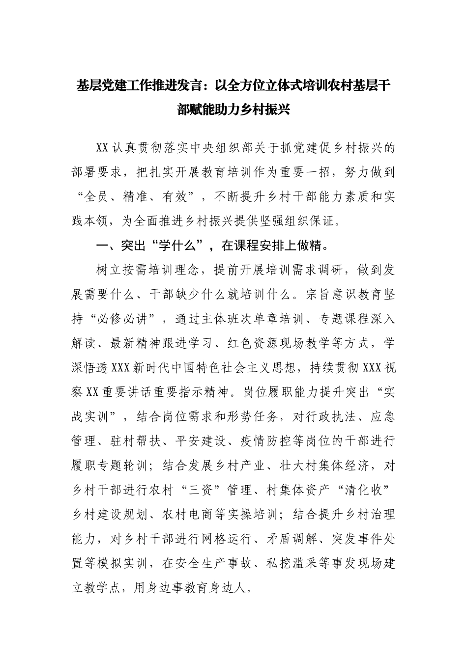 基层党建工作推进发言:以全方位立体式培训农村基层干部赋能助力乡村振兴XX认真贯彻落实中央组织部关于抓党建促乡村振兴的部署要求,把扎实开展教育培训作为重要一招,努力做到“全员、精准、有效”,不断提升乡村干部能力素质和实践本领,为全面推进乡村振兴提供坚强组织保证。一、突出“学什么”,在课程安排上做精。树立按需培训理念,提前开展培训需求调研,做到发展需要什么、干部缺少什么就培训什么。宗旨意识教育坚持“必修必讲”,通过主体班次单章培训、专题课程深入解读、最新精神跟进学习、红色资源现场教学等方式,学深悟透XXX新时代中国特色社会主义思想,持续贯彻XXX视察XX重要讲话重要指示精神。岗位履职能力提升突出“实战实训”,结合岗位需求和形势任务,对行政执法、应急管理、驻村帮扶、平安建设、疫情防控等岗位的干部进行履职专题轮训;结合发展乡村产业、壮大村集体经济,对乡村干部进行农村“三资”管理、村集体资产“清化收”乡村建设规划、农村电商等实操培训;结合提升乡村治理能力,对乡村干部进行网格运行、矛盾调解、突发事件处置等模拟实训,在安全生产事故、私挖滥采等事发现场建立教学点,用身边事教育身边人。二、立足“谁来讲”,在师资力量上选优。聘请全国高端师资。从中央部委培训班次师资库中,邀请有关领导专家讲政策理论,从外省先行、先进地区邀请优秀基层干部讲工作方法。去年以来,邀请XX名全国高端师资授课。省级建立XXX余人的农村基层干部培训师资库。推动市、县委书记上讲台。省委主要负责同志为换届后县级党政正职讲授开班第一课,示范带动全省XX名市委书记和XXX名县级党委书记全部上讲台,分别为乡、村党组织书记授课。一线干部现身说法。从招商引资、产业发展、基层治理、信访维稳一线邀请1326名实践经验丰富的先进典型授课,广泛运用“导师帮带、手把手教”培训方法。三、围绕“如何教”,在方式方法上创新。四、确保“做得好”,在组织领导上加强。压实各方责任,省委组织部把基层干部培训工作纳入基层党建述职评议考核,每年制定培训工作方案,明确对象、时间、师资、管理等要求,坚持省市县乡四级联动,各级组织部门牵头抓总、职能部门齐抓共管,形成大抓培训、抓实培训的工作格局。保障阵地经费,加强市县乡党校建设,省级建立XX个党员教育示范基地、X个农村干部培训基地,统筹大专院校等培训资源,形成“党校+干部学院+高校基地+网络平台”的培训矩阵;省管党费连续10年列支专项经费培训农村“领头雁”,近两年每年XXX万元。坚持跟踪问效,采取随堂测试、电话抽查等方式,跟进了解学员学习效果、工作举措、落实成效。省委组织部主要负责同志多次电话抽查乡村干部培训效果。在大力开展培训的同时,持续用力做好抓基层、强基础、固基本的各项工作。在高质量完成乡村换届基础上,招聘XXX余名大学毕业生、选派XXX名县乡机关事业单位干部到村任职,乡村两级班子整体功能优化;健全县乡党委抓乡促村责任制,持续整顿软弱涣散党组织,化解各类矛盾问题,农村基层党建弱项得到加强;持续加大对农村基层基础建设投入,全面推进乡镇“五小”建设、提高村级组织运转经费,基础保障水平不断提升,持续夯实全面推进乡村振兴战斗堡垒。