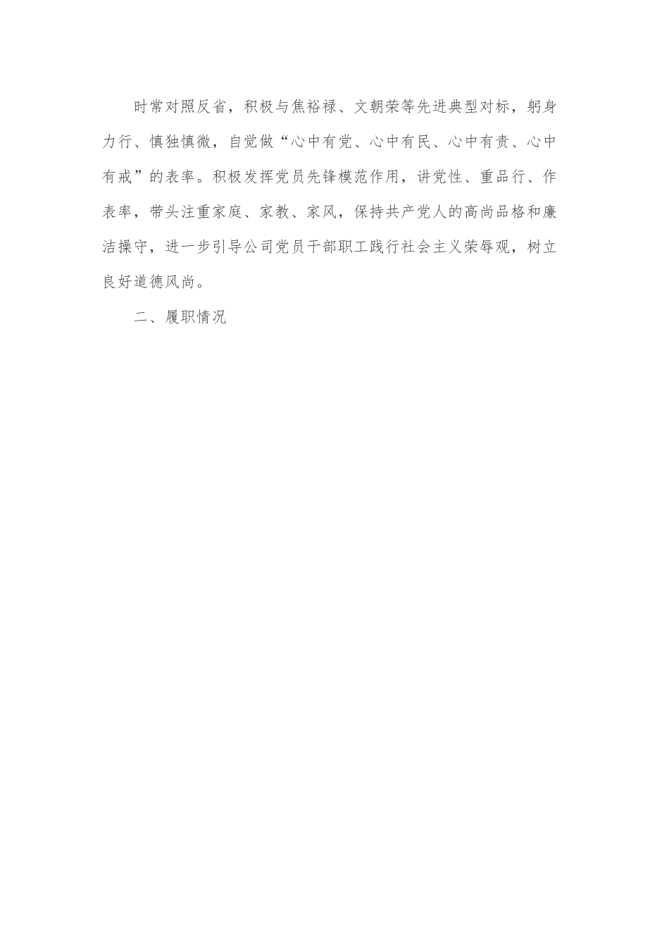 2021年度述德述职述廉总结(2022年6月24日)xx公司董事长xx根据区委组织部《关于开展2021年度区管领导班子和区管干部考核工作的通知》要求,现就述德述职述廉报告如下:一、思想政治建设情况(一)强化理论学习,筑牢思想根基。我始终把提高思想政治素质和党性修养作为首要职责,认真学习中央、省、市、区关于党风廉政相关会议精神,坚定维护以习近平同志为核心的党中央权威,始终把维护习近平总书记这个核心作为最大的政治,牢固树立“四个意识”,坚定“四个自信”,做到“两个维护”,用习近平新时代中国特色社会主义思想武装头脑、指导实践、推动工作,切实按照党员干部的标准严格要求自己,着力增强自我净化、自我完善、自我革新、自我提高的能力。(二)学用结合,知行合一。坚持把理论学习与践行道德结合起来,把做人与做事、立言与立行统一起来,注重在实践中陶冶道德情操,加强党性修养,追求高尚情操,自觉远离低级趣味,坚决抵制没落思想观念的侵蚀,培养健康的生活情趣。坚定“四个自信”,在思想和行动上自觉按照党性原则办事,带头践行社会主义核心价值观。(三)以身作则,忠诚担当。时刻注意自己言行,带头践行政治品德、社会公德、家庭美德,养成良好的道德习惯。严守从政之德,时常对照反省,积极与焦裕禄、文朝荣等先进典型对标,躬身力行、慎独慎微,自觉做“心中有党、心中有民、心中有责、心中有戒”的表率。积极发挥党员先锋模范作用,讲党性、重品行、作表率,带头注重家庭、家教、家风,保持共产党人的高尚品格和廉洁操守,进一步引导公司党员干部职工践行社会主义荣辱观,树立良好道德风尚。二、履职情况(一)抓工作,强落实。2021年,在区委、区政府的坚强领导下,在高新区管委会的支持下,紧紧围绕区委、区政府安排部署的重点工作目标任务,以国企改革为契机,围绕“四新”抓“四化”,立足新发展阶段、贯彻新发展理念、融入新发展格局,奋力推进公司高质量实体化转型发展。一是强化政治站位。第一时间传达学习贯彻中央、省、市、区相关会议精神,做到学深悟透、学以致用,树牢“四个意识”,坚定“四个自信”,做到“两个维护”,拥护“两个确立”,在政治上、思想上、行动上与区委、区政府保持高度一致,坚决完成全年各项目标任务;二是深化国企改革。全力推进xx公司组建、人员划转、主体信用“AA”评级等工作,推进公司实体化运营能力;三是加大债务化解力度。按照“一债一策”、“三个精准”的原则,重点围绕“五个通道”(银行融资、债券融资、信托融资、租赁融资、基金融资)方式,打好防范化解重大风险攻坚战。2021年我公司到期债务共计xx亿元,融资到位资金xx亿元,已化解债务xx亿元;四是加强项目谋划布局。围绕国家大政方针、xx“五区一中心”、银行资金投向、行业规划和市场前景,结合公司“服务园区、经营园区”发展定位,大力谋划有收益、落地性强的项目x个,助推新区扩容;五是加大园区建设力度。立足当前项目建设,抓好防控稳控工作,着力化解历史遗留问题,盘活现有资产,为新老主体平稳过渡助力,尽力实现新老主体“双轮驱动”发展。2021年重点实施x个项目,其中续建项目x个,新开工项目x个;六是已按要求落实意识形态工作责任制、党政主要负责人履行推进法治建设第一责任人职责;七是已按要求做好党中央、国务院、省委省政府、市委市政府和区委区政府重点工作;八是按要求履行基层党建工作责任制。(二)抓队伍,强组织。一是认真履行《党委(党组)落实全面从严治党主体责任规定》,健全了“一把手负总责,班子成员齐抓共管”的领导机制和工作机制,将全面从严治党与领导班子成员的分管工作相结合,严格按照“一岗双责”要求,细化全面从严治党各项任务;二是定期开展集中约谈、分级约谈、廉政谈话。2021年共计约谈x次,已进行集体约谈xx人次,同时对严禁办升学宴、谢师宴进行廉政提醒谈话,2021年公司没有出现违纪违规的行为;三是严格执行和落实干部选拔任用条例。2021年11月开展新旧主体之间人员划转工作,通过竞聘方式,择优选派5人充实调配到新主体公司担任部门科长及以上干部。(三)抓学习,提能力。一是以党史学习教育活...