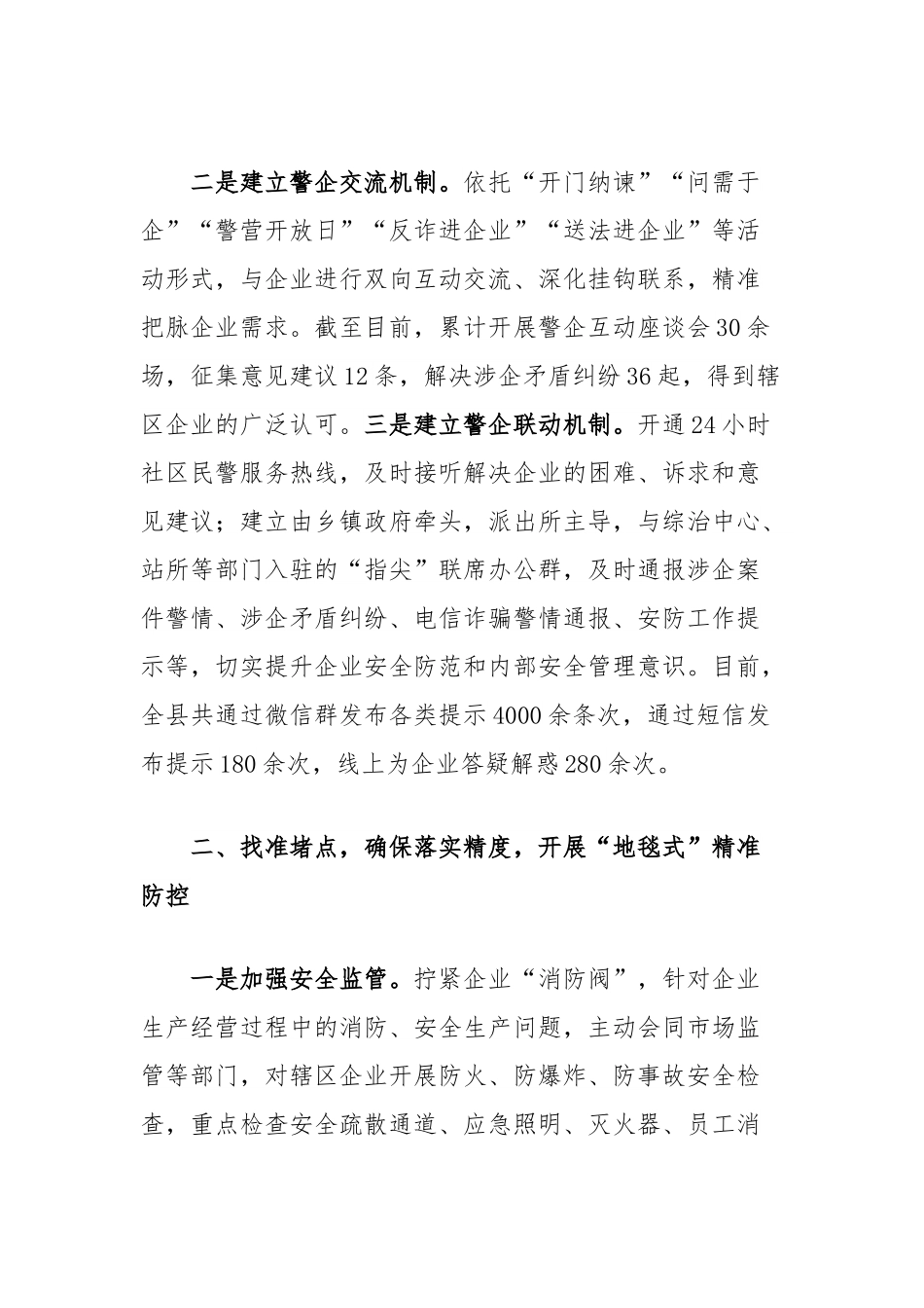 县公安局在2024年全县优化营商环境大会上的典型发言尊敬的各位领导,同志们:近年来,县公安局全面贯彻习近平总书记视察**重要讲话精神,以落实黄河重大国家战略为指引,围绕企业发展过程中的难点堵点痛点,创新提高部署精度、确保落实精度、完善服务精度“三精准”举措,激发各类市场主体活力,持续推动安企护企“精准警务”服务能力,深化警企协作,努力营造“护企、安企、爱企”营商环境品牌效应。该做法先后被人民网、“**公安”头条号、**晚报•**壹点、海报新闻、**大众网等报道刊发。现将有关工作进展情况汇报如下:一、把握重点,提高部署精度,打造“联动式”精准服务一是建立警企联系机制。持续深化完善“枫桥经验”式护企安商模式,建立常态化联系服务企业工作机制,健全“项目警长”机制,每名项目警长确定1名民辅警为联络员做好日常服务工作,进一步增进沟通和交流,24小时受理企业投诉、举报和法律咨询,为企业排忧解难。目前“项目警长”已累计帮助企业解决车辆通行、户籍管理、出入境管理等方面的问题30余个,提供上门送证服务50余次。二是建立警企交流机制。依托“开门纳谏”“问需于企”“警营开放日”“反诈进企业”“送法进企业”等活动形式,与企业进行双向互动交流、深化挂钩联系,精准把脉企业需求。截至目前,累计开展警企互动座谈会30余场,征集意见建议12条,解决涉企矛盾纠纷36起,得到辖区企业的广泛认可。三是建立警企联动机制。开通24小时社区民警服务热线,及时接听解决企业的困难、诉求和意见建议;建立由乡镇政府牵头,派出所主导,与综治中心、站所等部门入驻的“指尖”联席办公群,及时通报涉企案件警情、涉企矛盾纠纷、电信诈骗警情通报、安防工作提示等,切实提升企业安全防范和内部安全管理意识。目前,全县共通过微信群发布各类提示4000余条次,通过短信发布提示180余次,线上为企业答疑解惑280余次。二、找准堵点,确保落实精度,开展“地毯式”精准防控一是加强安全监管。拧紧企业“消防阀”,针对企业生产经营过程中的消防、安全生产问题,主动会同市场监管等部门,对辖区企业开展防火、防爆炸、防事故安全检查,重点检查安全疏散通道、应急照明、灭火器、员工消防常识掌握、疏散预案制定等方面,责令整改检查发现的安全防范漏洞及消防风险隐患。截至目前,已对企业进行安全检查80余家次,督促整改安全隐患11处。二是强化风险预警。不定期对辖区企业保安开展安全防卫技能培训,梳理企业周边案件高发区域、时段的规律特点,及时调整巡逻方式、巡逻路线和巡逻时间,明确必巡点与重点路段,逐步完善立体化全天候的防控网,有效降警情、控发案、除隐患。三是打击涉企犯罪。对侵害企业合法权益的各类违法犯罪保持高压态势,强化重点行业、重点区域违法犯罪链条线索研判工作,整合所内优势警力,一旦发现涉企经济犯罪,提前组织会商、明确侦查方向、制定详细计划,全力做到快侦快破,维护企业合法权益。今年以来,共受理涉企案件4起,立案5起,涉案价值870万元。三、夯实支点,完善服务精度,搭建“扁平式”精准勤务一是打好员工“免疫针”。定期组织警力深入辖区企业开展各类法治宣传教育活动,向企业发放宣传资料,从懂法的重要性、违法的危害性、用法律维护自身权益等方面入手,将殴打他人、损坏财物、寻衅滋事等违法行为进行通俗易懂的讲解,通过以案释法切实提高企业职工的法律意识和法律观念。二是念好反诈“紧箍咒”。通过入户走访、村社联动等形式对企业财会人员、企业负责人进行反诈防宣。通报企业近期电诈发案情况,详细分析讲解“冒充领导”“冒充公检法”等典型案例受害者心理以及诈骗手段,指导员工下载安装“国家反诈中心”APP,进一步筑牢企业员工防诈骗意识和能力。今年以来,开展宣讲活动27次,受宣人数达千余人。三是优化服务“直通车”。以深化“放管服”改革为切入口,不断精简审批事项,简化办事程序,推出电话预约、入企办证、现场办公等贴心举措,有效提高服务质效,降低企业办事成本。今年以来,主动为企业提供上门指导60余次。汇报完毕,谢谢大家!
