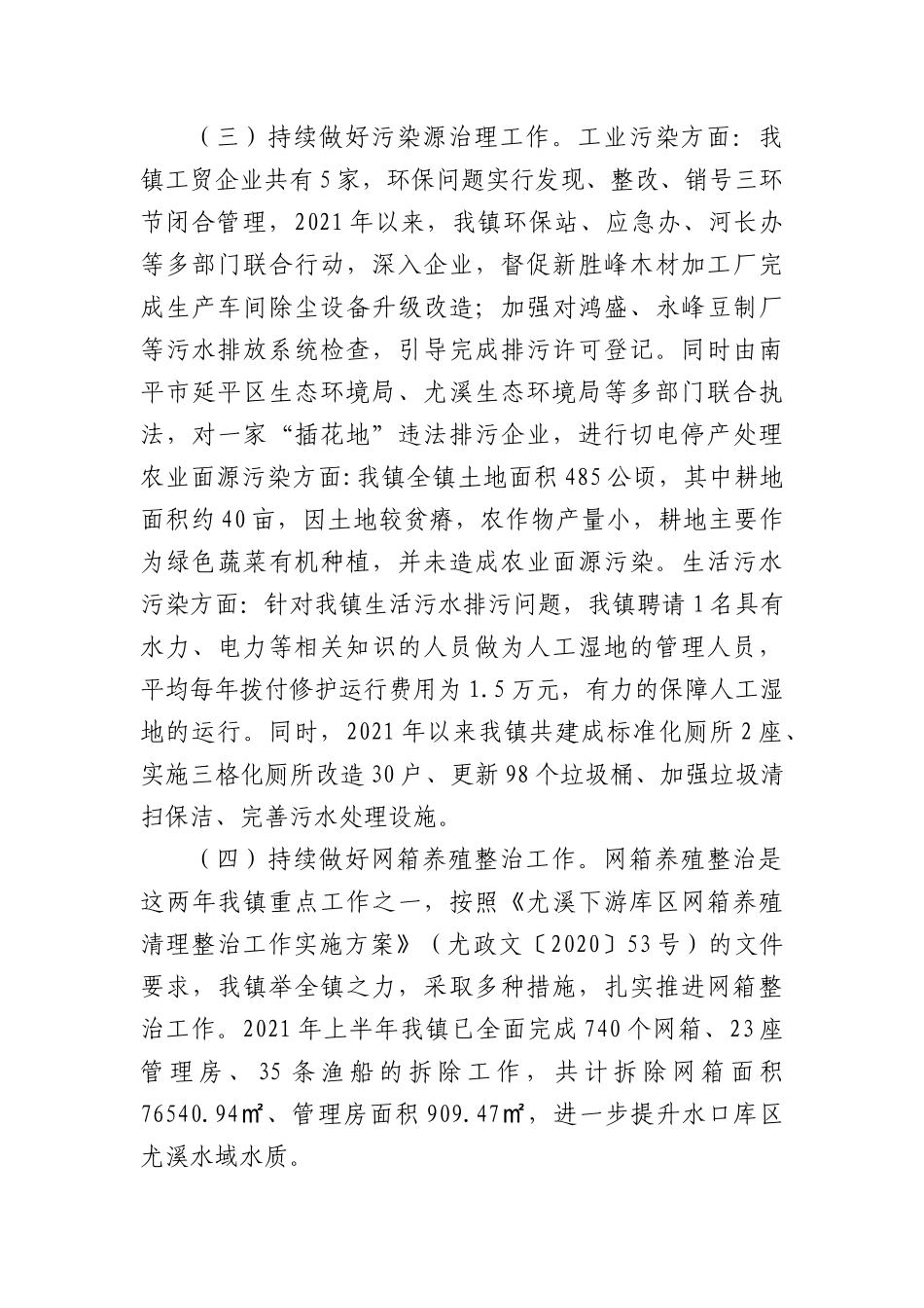 XX镇人民政府关于深化落实河长制工作年度的述职报告县河长办:全面推行河长制是党中央、国务院的重大决策部署,是落实绿色发展理念、推进生态文明建设的重要制度安排一年来,我镇始终认真贯彻习近平生态文明思想,牢固树立“绿水青山就是金山银山”的发展理念,在县委、县政府、县河长办的正确领导下,认真落实推进河长制各项工作并取得了较好的成效,结合我镇实际,现将具体情况汇报如下:一、河道基本情况我镇所辖河道为尤溪河XX段,是尤溪河末端也是注入闽江的交汇处,从XX镇木材检查站至闽江支流,全长5公里,右岸沿河分别是西滨镇过溪村、经营林场、延平区樟湖镇龙池村管辖,左岸XX镇管辖(竹峡段1公里有延平区太平镇南溪村插花地),上游流经坂面、城关、梅仙、西滨等4个乡镇。今年以来,我镇共投入近5万元落实好河长制工作,效果明显。二、主要措施及工作成效(一)组织机构建立情况。一是严明职责。按照县委县政府的统一部署,制定《XX镇“河长制”实施方案》,《XX镇河道专管员管理考核办法》,明确了河长、河段长、河道专管员的职责;镇对村签订工作责任书,把河流、河段的管理责任落实到人。二是强化领导。及时调整充实河长制领导小组成员名单,明晰责任、细化任务,指导本辖区内“河长制”具体工作。三是建立档案。把河道的相关情况进行全面调查摸底,登记造册,以文字、表格、图片等形式建立档案;针对河道各水段情况不同的特点,制定具体的管理措施,实行“一河一策”,建立“一河一档”,因地制宜,着力打造“河畅、水清、岸绿、景美”的XX水生态环境。(二)落实河道巡察保洁工作。我镇严格执行“河长制”日常巡查制度,落实常态化的工作机制,积极发挥河道专管员的作用,做到主动制止河道乱堆、乱放等现象,并将情况及时上报镇河长办或当场及时处置。同时结合网箱整治后期防控工作,镇河长办利用无人机每周进行一次水面巡察,每月由镇河长办牵头,组织环保站、水利站、畜牧水产站、企业站等相关部门,对河道沿岸进行全覆盖巡察,进一步加强河道环境的日常清洁。2021年以来,清理沿岸、库面垃圾约6吨,责令企业清理建筑垃圾1处。(三)持续做好污染源治理工作。工业污染方面:我镇工贸企业共有5家,环保问题实行发现、整改、销号三环节闭合管理,2021年以来,我镇环保站、应急办、河长办等多部门联合行动,深入企业,督促新胜峰木材加工厂完成生产车间除尘设备升级改造;加强对鸿盛、永峰豆制厂等污水排放系统检查,引导完成排污许可登记。同时由南平市延平区生态环境局、尤溪生态环境局等多部门联合执法,对一家“插花地”违法排污企业,进行切电停产处理农业面源污染方面:我镇全镇土地面积485公顷,其中耕地面积约40亩,因土地较贫瘠,农作物产量小,耕地主要作为绿色蔬菜有机种植,并未造成农业面源污染。生活污水污染方面:针对我镇生活污水排污问题,我镇聘请1名具有水力、电力等相关知识的人员做为人工湿地的管理人员,平均每年拨付修护运行费用为1.5万元,有力的保障人工湿地的运行。同时,2021年以来我镇共建成标准化厕所2座、实施三格化厕所改造30户、更新98个垃圾桶、加强垃圾清扫保洁、完善污水处理设施。(四)持续做好网箱养殖整治工作。网箱养殖整治是这两年我镇重点工作之一,按照《尤溪下游库区网箱养殖清理整治工作实施方案》(尤政文〔2020〕53号)的文件要求,我镇举全镇之力,采取多种措施,扎实推进网箱整治工作。2021年上半年我镇已全面完成740个网箱、23座管理房、35条渔船的拆除工作,共计拆除网箱面积76540.94、管理房面积㎡909.47,进一步提升水口库区㎡尤溪水域水质。三、存在问题一是“插花地”管理难度大。在我镇辖区河道沿岸办企业,地类属尤溪,南平插花地企业大多数为南平地区注册的企业,在“插花地”上的企业环保监管存在难度。二是网箱养殖存在“一河两治”现象。我镇辖区河段南平与我县政策执行不同步,开展网箱整治政策不一致,导致养殖户不理解,给网箱整治和后续管理带来一定难度。三是水葫芦问题难根治。河面垃圾、水葫芦水口库区闽江不定时回流,给河道管理造成一定难度。四是环保意识不强。全镇整治水环境的氛围还未形...