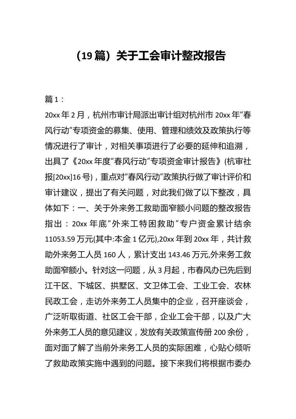 (19篇)关于工会审计整改报告篇1:20xx年2月,杭州市审计局派出审计组对杭州市20xx年“春风行动”专项资金的募集、使用、管理和绩效及政策执行等情况进行了审计,对相关事项进行了必要的延伸和追溯,出具了《20xx年度“春风行动”专项资金审计报告》(杭审社报[20xx]16号),重点对“春风行动”政策执行做了审计评价和审计建议,提出了有关问题,对此我们做了以下整改,具体如下:一、关于外来务工救助面窄额小问题的整改报告指出:20xx年底“外来工特困救助”专户资金累计结余11053.59万元(其中:本金1亿元),20xx年到20xx年,共计救助外来务工人员160人,累计支出143.46万元,外来务工救助面窄额小。针对这一问题,从3月起,市春风办已先后到江干区、下城区、拱墅区、文卫体工会、工业工会、农林民政工会,走访外来务工人员集中的企业,召开座谈会,广泛听取街道、社区工会干部,企业工会干部,以及广大外来务工人员的意见建议,发放有关政策宣传册200余份,面对面了解了当前外来务工人员的实际困难,心贴心倾听了救助政策实施中遇到的问题。接下来我们将根据市委办发[20xx]1号文件《关于深入开展杭州市20xx年“春风行动”的通知》精神,对《杭州市外来务工人员特殊困难救助办法》(市委办发[20xx]108号)提出完善和修订意见,进一步扩大救助面,切实帮助外来务工人员解决因重大疾病、急难险情等导致的经济困难,提高“外来工特困救助”专项资金的绩效。二、关于“春风助医”未能有效开展问题的整改报告指出:阿里巴巴专项救助资金每年500万元,20xx年实施1年来,实际支出74.7万元,救助效果不够理想。今年,我们与阿里巴巴重新签订了《项目捐赠协议书》,并将救助对象从老城区符合救助条件的城乡居民扩大到三区、四县(市)符合救助条件的困难家庭。同时,我们将请专业公司对老城区因病致贫的家庭进行调研和数据测算,进一步修改完善和宣传阿里巴巴?春风助医政策,提高该专项资金的绩效。三、关于家庭收入证明不规范问题的整改报告指出:对20xx年阿里巴巴?春风助医申报材料中家庭收入证明缺乏较为明确的标准和内容。目前,我们根据人社、民政等部门规范要求,制定了《申请杭州市“阿里巴巴?春风助医”家庭收入证明规范要求》(详细见附件),统一了申请杭州市“阿里巴巴?春风助医”的家庭收入证明的标准。四、关于进一步加强审核监管问题的整改报告指出:针对目前相关申报资料难以准确核实的情况市“春风办”应加强与有关部门的沟通协调,采取切实有效的措施,严把审核监管关。为此,我们对与有关职能部门联合开展的慰问救助项目进行专项核查,从对精神障碍患者困难家庭慰问项目核查情况来看,在市精卫办上报的2091人中查出有272人材料不全,市春风办要求补齐材料后,再发救助款。篇2:工会审计整改报告一、五年来经费收支情况的审查意见经费审查委员会对本级财务工作报告进行了认真的审议。认为,五年来工会财务工作适应工会组织改革与发展的需要,不断加强财务管理工作,针对各类新情况、新问题,采取了多方面的有效措施。在工会经费的收缴、管理和使用等方面贯彻“增收节支、量入为出、统筹兼顾、保证重点”的工作原则,使工会经费做到了收支平衡,尚有结余。经审定,20xx年至20xx年,乡总工会经费收支情况如下:总收入为元。包括:县总工会拨入活动经费元,乡财政补助经费元,会员会费收入元,其他收入元。五年总支出为元。其中:上解县总工会经费元,职工活动费元,其它支出元。截至20xx年底,经费结余为13131.89元。经审议,五年来乡工会财务工作严格执行各项财政法规,遵守财经纪律,不断加强内部财务制度建设,规范财务工作管理,并能积极组织经费收入将各项支出严格控制在预算范围内。在收好、管好、用好工会经费方面做了大量工作,有效地减少了漏拨和欠拨经费的现象,使拨交经费数额逐年稳步增长,保证了各项工作的开展。同时注意合理调配经费,节约不必要的开支,储备了一定的经费,为工会更好地开展工作奠定了基础。进一步加强核算,建立了三级帐目管理,做到了帐证、帐表、帐帐相符,经费收支帐务清楚、真实,财务核算工作符合规定。为了更好实现今后五年工会工作目标,在已经...
