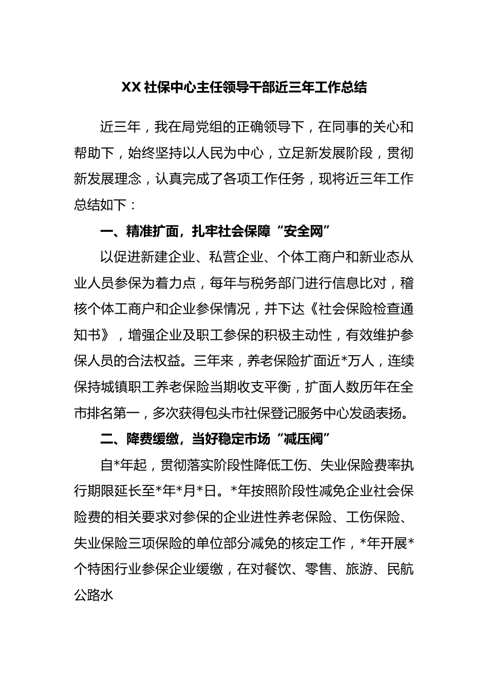 XX社保中心主任领导干部近三年工作总结近三年,我在局党组的正确领导下,在同事的关心和帮助下,始终坚持以人民为中心,立足新发展阶段,贯彻新发展理念,认真完成了各项工作任务,现将近三年工作总结如下:一、精准扩面,扎牢社会保障“安全网”以促进新建企业、私营企业、个体工商户和新业态从业人员参保为着力点,每年与税务部门进行信息比对,稽核个体工商户和企业参保情况,并下达《社会保险检查通知书》,增强企业及职工参保的积极主动性,有效维护参保人员的合法权益。三年来,养老保险扩面近*万人,连续保持城镇职工养老保险当期收支平衡,扩面人数历年在全市排名第一,多次获得包头市社保登记服务中心发函表扬。二、降费缓缴,当好稳定市场“减压阀”自*年起,贯彻落实阶段性降低工伤、失业保险费率执行期限延长至*年*月*日。*年按照阶段性减免企业社会保险费的相关要求对参保的企业进性养老保险、工伤保险、失业保险三项保险的单位部分减免的核定工作,*年开展*个特困行业参保企业缓缴,在对餐饮、零售、旅游、民航公路水路铁路运输等特困行业实施缓缴三项社会保险费的基础上,以产业链供应链受疫情影响较大、生产经营困难的制造业企业为重点,将阶段性缓缴社会保险费政策扩大到*个困难行业,为企业发展减压力添动力,有效减轻企业负担。三、服务升级,打好社保服务“组合拳”*年,创建企业服务钉钉群,将企业新开户、企业职工投停保、开具参保证明等业务的业务流程和所需资料制作成一个个二维码,有效提高企业业务办理速度。*年,在认真梳理社保业务流程的基础上,全面推行综合柜员制服务模式,实现经办业务事项前台统一收件、后台分类审批、综合窗口出件的“线下一窗办”服务模式,截至目前,综窗受理业务*件,办理完结*件,办结率*%,全市排名第一。*年,疫情期间,推出社保“不见面”业务经办服务,针对网厅无法登录的企业或由于疫情隔离居家办公,暂时无法提供证明材料或者无法在材料上加盖公章的企业,推行“容缺办理”工作机制,帮助企业渡过难关;针对灵活就业人员手机核定缴费不成功业务,推出AAA上传后台核定作为补充,满足群众参保缴费需求,实现了窗口办事“不停歇”、人社服务“不断档”。四、开拓创新,搭建政策宣传“直通车”*年,创新开设首家政策咨询直播平台,具备政策讲解、热点问答、咨询互动等功能。截至目前,粉丝数达到*万余人,发布原创视频*条,累计观看人数突破*万余人;开展线上直播*次,累计观看*万余人次,单场直播突破*万人观看,线上解答*万余问。同时,开创“户外专场直播”结合线下宣传模式,实现人社新政策新做法“零距离”“云共享”,进一步提升社会保险政策知晓率,切实解决好群众身边“微实事”。三年来,我的工作在领导的支持下,在同事的协作下,个人取得了一些成绩。在总结成绩的同时,我也清醒地认识到自己还存在一些不足,在思想上,与新时期党员的标准之间还存在一定的差距,还需要进一步加强思想政治学习,深入体会,并坚持作到身体力行,以更加饱满的的学习热情,以更加积极的精神面貌,开展工作学习。在工作方面,工作能力还可以进一步的提高。通过参加各种学习多实践、多和先进工作者交流学习,我想会有明显改善。同时我还要增加自己的群众基础,更广泛的投身到工作中坚定为人民服务的决心。在今后的工作中,我将再接再厉克服不足,认真履行好工作职责,积极完成各项工作任务为人社事业发展作出新的贡献。