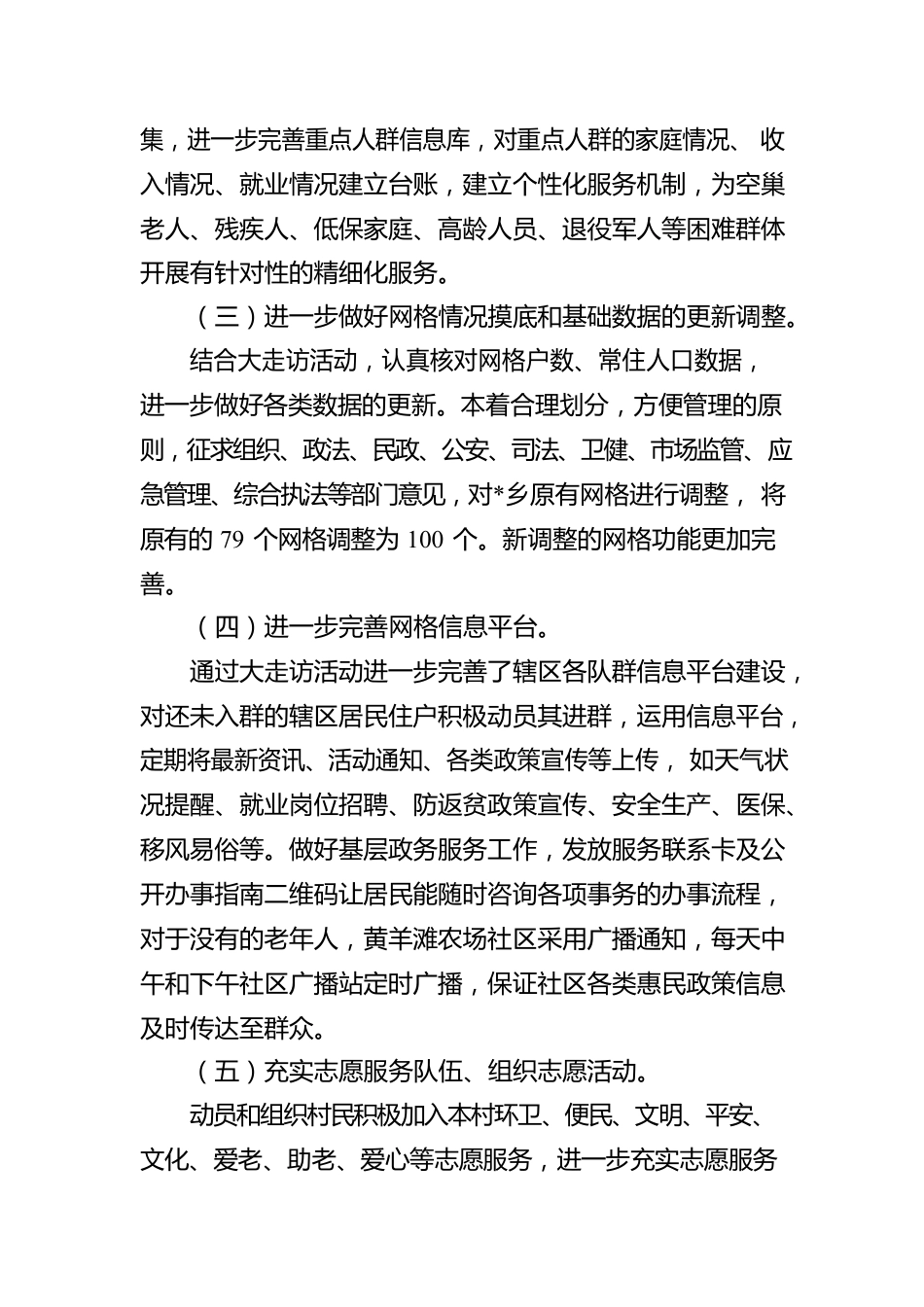 乡镇开展“网格员大走访活动月”情况总结为深入贯彻落实党的二十大精神,完善村社区网格化管理,进一步健全城乡社区治理体系,贯彻落实《深入推进城市基层党建引领基层治理的具体措施》及《城市社区规范化标准化建设三年行动方案(2023-2025年)》关于网格化管理相关要求,根据《关于开展*县2023年“网格员大走访活动月”活动的通知》文件相关要求,*乡认真部署,组织各村网格员、志愿者、村委会成员针对辖区内低保户、特困人员、残疾人、留守儿童、高龄老人、困难老党员、退役军人等困难特殊群体开展全面大走访活动。现将活动开展情况总结如下:一、开展的主要工作(一)开展困难群体走访工作,进一步掌握实际情况。各村(社区)网格员通过此次走访活动,更加充分熟悉服务对象,掌握辖区内居民的基本生活、生产情况。全乡共开展各类服务活动5次、共计走访城乡低保户332户、走访高龄老人142户、走访分散特困人员19户、走访困难群众及老党员120人、走访退役军人210人,困难群众1110户,发放政策宣传材料590余份。(二)做好重点人员管理实施网格精细服务。根据走访入户情况,对网格内特殊群体基本情况进行采集,进一步完善重点人群信息库,对重点人群的家庭情况、收入情况、就业情况建立台账,建立个性化服务机制,为空巢老人、残疾人、低保家庭、高龄人员、退役军人等困难群体开展有针对性的精细化服务。(三)进一步做好网格情况摸底和基础数据的更新调整。结合大走访活动,认真核对网格户数、常住人口数据,进一步做好各类数据的更新。本着合理划分,方便管理的原则,征求组织、政法、民政、公安、司法、卫健、市场监管、应急管理、综合执法等部门意见,对*乡原有网格进行调整,将原有的79个网格调整为100个。新调整的网格功能更加完善。(四)进一步完善网格信息平台。通过大走访活动进一步完善了辖区各队群信息平台建设,对还未入群的辖区居民住户积极动员其进群,运用信息平台,定期将最新资讯、活动通知、各类政策宣传等上传,如天气状况提醒、就业岗位招聘、防返贫政策宣传、安全生产、医保、移风易俗等。做好基层政务服务工作,发放服务联系卡及公开办事指南二维码让居民能随时咨询各项事务的办事流程,对于没有的老年人,黄羊滩农场社区采用广播通知,每天中午和下午社区广播站定时广播,保证社区各类惠民政策信息及时传达至群众。(五)充实志愿服务队伍、组织志愿活动。动员和组织村民积极加入本村环卫、便民、文明、平安、文化、爱老、助老、爱心等志愿服务,进一步充实志愿服务队伍,每村(社区)都有一只志愿者组织,每个志愿者组织约60余人,在村级管理事务中充分发挥了“奉献、有爱、互助、进步”的志愿者精神。(六)建立信息台账制度。认真落实网格员工作台账制度,在走访过程中真实记录群众意见,认真收集归纳群众反映的问题,分类分批分期予以解决,确保件件有着落、事事有回应。共收集问题50件,已解决的36件,正在办理中的14件。主要涉及社会救助、环境卫生、道路维修、残疾人辅助器具、沟渠损坏的维修、适老化改造、矛盾纠纷等问题。对已办结的事项和已调处的矛盾纠纷全部进行回访,通过回访及时掌握新情况,确保问题不反弹;对于没有解决到位的问题也及时向群众作解释说明,后续通过打电话、走访入户等方式,跟进问题进度,积极寻找解决方法,争取早日解决群众“急难愁盼”的问题。(七)做好安全隐患排查整治。开展重点场所安全隐患大排查,对辖区的超市、餐饮、小作坊、小企业、小区进行安全生产检查,对消防设施、燃气等情况逐一排查。各村本着精准排摸、不落一户、不漏一房的原则,对居民自建房的基本情况、建设情况、安全情况等信息进行了详细了解;对房屋的建造年代、结构类型等情况进行了全面摸排;对有无违规加层、改建扩建、墙体有无裂缝等安全隐患问题进行了重点排查;对屋顶防漏水、用电、用火、用气安全方面进行了全面宣传。逐一登记并签字确认,做好台账管理,同时向居民讲解安全隐患排查的重要性及自建房安全常识,提醒居民要加强安全防范意识,防范各类不安全事故的发生。通过检查,进一步消除了各类安全隐患,提高了居民的安全意识。(八...