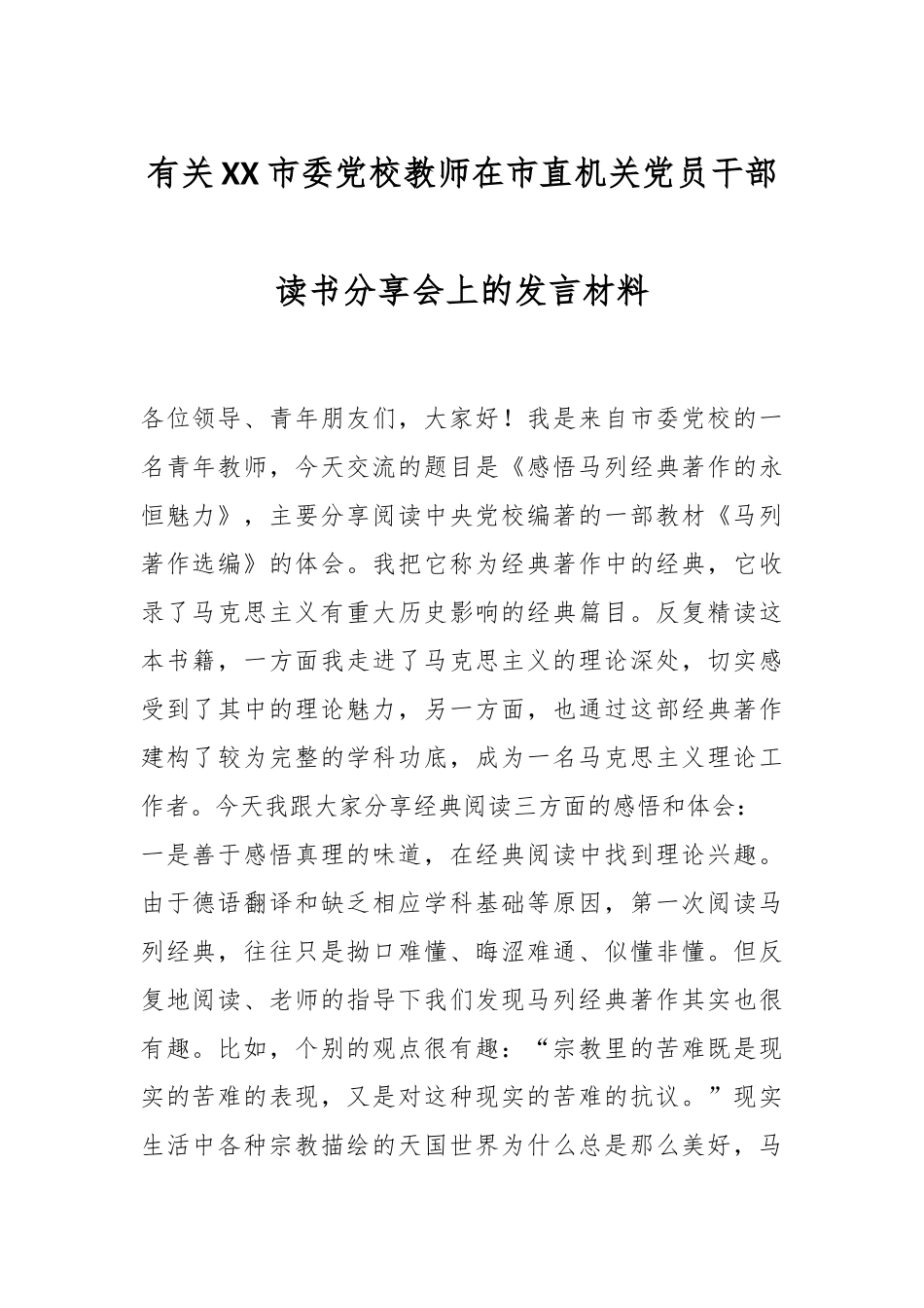 有关XX市委党校教师在市直机关党员干部读书分享会上的发言材料各位领导、青年朋友们,大家好!我是来自市委党校的一名青年教师,今天交流的题目是《感悟马列经典著作的永恒魅力》,主要分享阅读中央党校编著的一部教材《马列著作选编》的体会。我把它称为经典著作中的经典,它收录了马克思主义有重大历史影响的经典篇目。反复精读这本书籍,一方面我走进了马克思主义的理论深处,切实感受到了其中的理论魅力,另一方面,也通过这部经典著作建构了较为完整的学科功底,成为一名马克思主义理论工作者。今天我跟大家分享经典阅读三方面的感悟和体会:一是善于感悟真理的味道,在经典阅读中找到理论兴趣。由于德语翻译和缺乏相应学科基础等原因,第一次阅读马列经典,往往只是拗口难懂、晦涩难通、似懂非懂。但反复地阅读、老师的指导下我们发现马列经典著作其实也很有趣。比如,个别的观点很有趣:“宗教里的苦难既是现实的苦难的表现,又是对这种现实的苦难的抗议。”现实生活中各种宗教描绘的天国世界为什么总是那么美好,马克思在这里其实就给出了答案,无外乎是人们对现实困难的无声的抗议。再比如,最近我们国家推出了二胎、三胎政策,但2022年全国人口出生为956万人,死亡人口却是1041万人,为什么二胎政策没有达到预期效果呢?思考这个问题的时候,我想起了选编中的一篇文章《家庭、私有制和国家的起源》这篇文章开宗明义提出了一个问题,人类如何延续自己的历史呢?大家可以思考一下这个问题的答案。在这里,恩格斯提出了“两种生产”的理论。第一种生产,种的繁衍人类作为一个物种要延续历史,毫无疑问,首先就要实现自身的繁衍也就是当下“二胎”“三胎”政策。第二种生产则回答了当下政策何以失灵的问题,也就是为了解决这个问题××市推出了三胎配套政策,每月600元补贴等等。也就是恩格斯所说的“物质生活资料和物质生产资料的生产”,解决了物质生活等社会保障问题,二胎三胎政策才能更好实行。二是感悟经典的价值,在经典阅读中筑牢理论功底。理论功底很重要,理论功底深厚则我们看待问题、分析问题就很深刻,分析看待问题就会有独特的学术视角;理论功底若不扎实,我们看待问题与普通人看问题几无差别。我们的理论功底从何而来呢?应该来自经典著作,特别是马克思主义经典苦作,这为我们看问题分析问题提供了分析框架。比如,当面对大家对主流理论认同度不够、主流价值观传播力不足的时候,怎样看待这些问题。恩格斯在《卡尔.马克思的葬礼》这篇文章中总结马克思的成就的时候讲了一句话:“马克思发现了人类历史的发展规律,即历来为繁芜丛杂的意识形态所掩盖着的一个简单事实:人们首先必须吃、喝、住穿,然后才能从事政治、科学、艺术、宗教教等等。”读到这句话时候,延伸出了怎样让我们的国家意识形态被认同呢?恩格斯的观点基础是利益与生活,也就是意识形态建构的现实性基础问题。学术问题与现实问题的答案在原典。三是感悟经典的力量,在经典阅读中坚定理论自信。阅读经典,关键是把理论与现实相结合。马列经典不是空中楼阁,它有着强烈的现实关照性。在日常的工作生活中,我们越来越感受到经典的力量。比如,当你读到列宁在《谈谈辩证法问题》中指出:“形而上学的唯物主义的根本缺陷就是不能把辩证法应用于反映论,应用于认识的过程和发展。”比如,现实社会生活中,干部水平能力的高低究竟在哪里?其实阅读选编我们就明白,在于思维的差异,在于世界观方法论的不同。