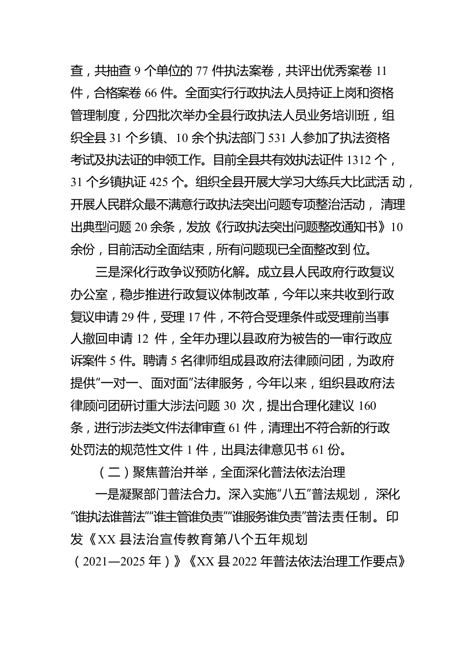 XX县司法局2022年法治政府建设工作报告2022年,在县委、县政府的坚强领导和市司法局的精心指导下,XX县司法局以习近平新时代中国特色社会主义思想为指导,全面贯彻落实党的二十大精神和习近平法治思想,坚决执行县委、县政府决策部署,围绕中心、服务大局,攻坚克难、勇争一流,以法治建设助推司法行政各项工作有力有序高效推进。现将有关工作报告如下。一、2022年法治政府建设主要工作举措和成效(一)聚焦依法行政,全面推进法治XX建设一是深化法治政府建设。召开全面推广应用全省“1+8”示范试点成果动员部署会,印发《全面推广“1+8”示范试点成果深入推进法治XX建设实施方案》《贯彻落实〈关于进一步加强市县法治建设的意见〉责任分工工作方案》,明确了全年及今后一个工作时期的重点工作任务。率先在县司法局、云峰镇推广“法治账图”,把权和责捆绑在一起,把法、岗、事、人粘连在一起,有效推动了党员干部尊法学法守法用法,形成了“学法律就是学业务、抓法治就是抓规范”的自觉。严格执行《党政主要负责人履行推进法治建设第一责任人职责规定》,严格落实法治政府建设“一岗双责”,全县115名党政“一把手”进行了法治工作述职述责。二是深化行政执法监督。组织全县开展行政执法案卷评查,共抽查9个单位的77件执法案卷,共评出优秀案卷11件,合格案卷66件。全面实行行政执法人员持证上岗和资格管理制度,分四批次举办全县行政执法人员业务培训班,组织全县31个乡镇、10余个执法部门531人参加了执法资格考试及执法证的申领工作。目前全县共有效执法证件1312个,31个乡镇执证425个。组织全县开展大学习大练兵大比武活动,开展人民群众最不满意行政执法突出问题专项整治活动,清理出典型问题20余条,发放《行政执法突出问题整改通知书》10余份,目前活动全面结束,所有问题现已全面整改到位。三是深化行政争议预防化解。成立县人民政府行政复议办公室,稳步推进行政复议体制改革,今年以来共收到行政复议申请29件,受理17件,不符合受理条件或受理前当事人撤回申请12件,全年办理以县政府为被告的一审行政应诉案件5件。聘请5名律师组成县政府法律顾问团,为政府提供“一对一、面对面”法律服务,今年以来,组织县政府法律顾问团研讨重大涉法问题30次,提出合理化建议160条,进行涉法类文件法律审查61件,清理出不符合新的行政处罚法的规范性文件1件,出具法律意见书61份。(二)聚焦普治并举,全面深化普法依法治理一是凝聚部门普法合力。深入实施“八五”普法规划,深化“谁执法谁普法”“谁主管谁负责”“谁服务谁负责”普法责任制。印发《XX县法治宣传教育第八个五年规划(2021—2025年)》《XX县2022年普法依法治理工作要点》《2022年XX县法治宣传教育“一月一主题”活动工作方案》,指导全县各单位围绕职能职责开展妇女权益保障、环境保护、安全生产、疫情防控等方面的法治宣传活动。持续创作如“法律七字歌”“新竹篮记”“唤马剪纸”法治挂历等一系列具有XX特色的法治文艺作品,全力打造出“XX法治文化”特色品牌。二是突出重点精准普法。组织开展民法典相关法治宣传活动,制定“美好生活·民法典相伴”主题宣传活动方案,组织全县开展主题宣传、文艺演出等活动。参加第三届川渝法治微视频微电影大赛,拍摄《账本》《离不了的婚》《宪法伴我成长》3部微电影。组织全县106个乡镇及部门的5140名在编干部参加四川省国家工作人员学法考法平台的学法考法工作,实现全县学法考法公职人员全覆盖。三是夯实基层法治建设基础。扎实开展第一批省级民主法治示范村(社区),按时完成评选推荐工作,并指导申报村(社区)对照创建标准开展示范创建工作。持续开展“法律明白人”培养工作,转发《四川省“法律明白人”培养工作实施方案(施行)》,为全县培养工作提供参考。通过与司法所对接,建立了村(社)“法律明白人”档案台账,举办业务培训40余场次,培养“法律明白人”1474余人。(三)聚焦风险防控,全面夯实平安维稳基础一是抓实人民调解。结合“三查三化三优”专项行动,统筹整合人民调解、律师、公证、司法鉴定、法律援助、法治宣传、基层法律服务等各类法律服务资源,切...