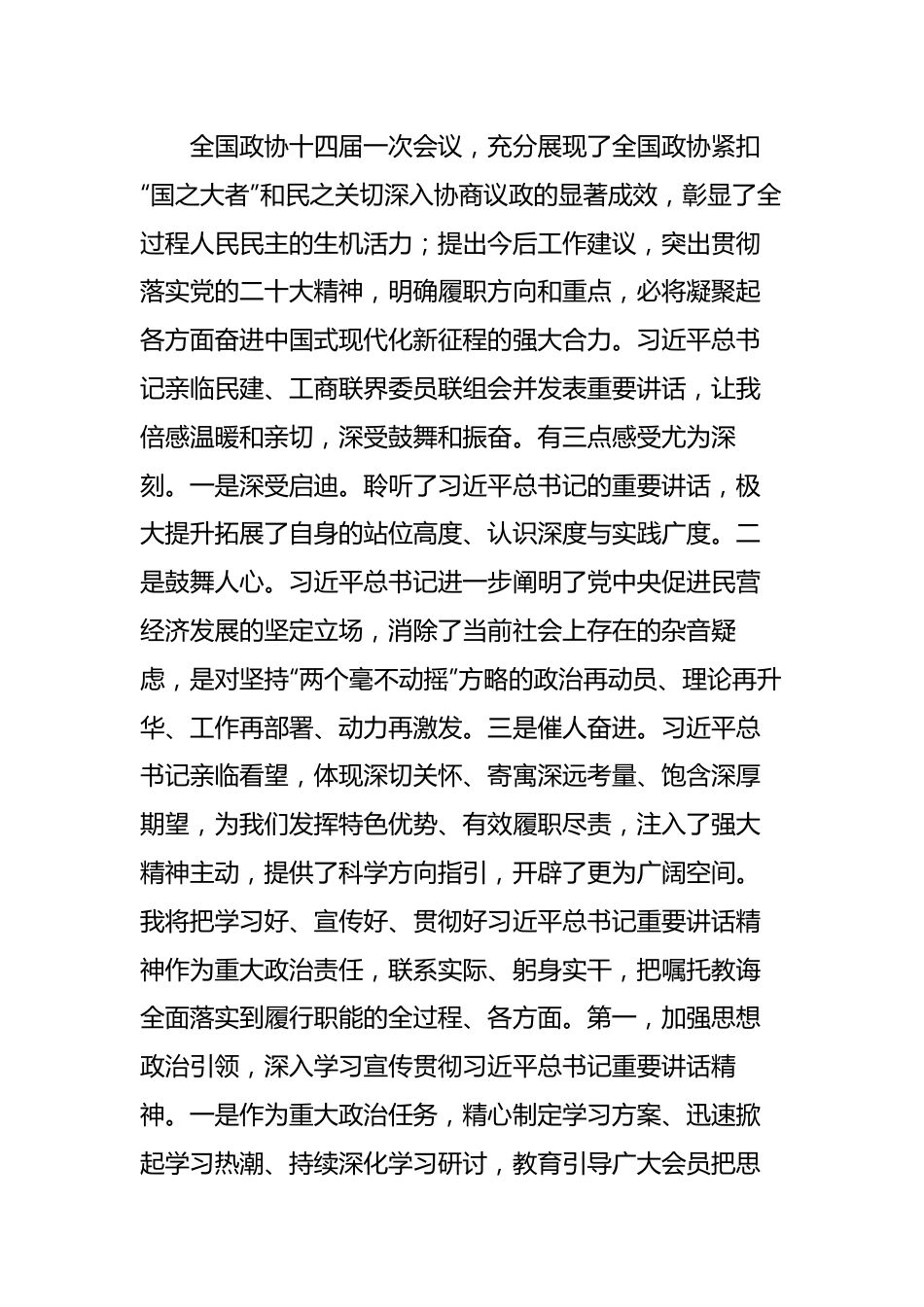 目录1.充分发挥密切联系经济界特色优势为推动民营经济健康高质量发展凝心聚力12.深入学习贯彻习近平总书记重要讲话精神助力我省民营经济健康高质量发展.............................................3.聚力高水平科技自立自强在科技强国建设中贡献甘肃力量.............................................................4.鼓足干劲再出发扬帆起航正当时................................5.以为国履职和为民尽责的新担当新作为践行全过程人民民主...........................................................充分发挥密切联系经济界特色优势为推动民营经济健康高质量发展凝心聚力全国政协十四届一次会议,充分展现了全国政协紧扣“国之大者”和民之关切深入协商议政的显著成效,彰显了全过程人民民主的生机活力;提出今后工作建议,突出贯彻落实党的二十大精神,明确履职方向和重点,必将凝聚起各方面奋进中国式现代化新征程的强大合力。习近平总书记亲临民建、工商联界委员联组会并发表重要讲话,让我倍感温暖和亲切,深受鼓舞和振奋。有三点感受尤为深刻。一是深受启迪。聆听了习近平总书记的重要讲话,极大提升拓展了自身的站位高度、认识深度与实践广度。二是鼓舞人心。习近平总书记进一步阐明了党中央促进民营经济发展的坚定立场,消除了当前社会上存在的杂音疑虑,是对坚持“两个毫不动摇”方略的政治再动员、理论再升华、工作再部署、动力再激发。三是催人奋进。习近平总书记亲临看望,体现深切关怀、寄寓深远考量、饱含深厚期望,为我们发挥特色优势、有效履职尽责,注入了强大精神主动,提供了科学方向指引,开辟了更为广阔空间。我将把学习好、宣传好、贯彻好习近平总书记重要讲话精神作为重大政治责任,联系实际、躬身实干,把嘱托教诲全面落实到履行职能的全过程、各方面。第一,加强思想政治引领,深入学习宣传贯彻习近平总书记重要讲话精神。一是作为重大政治任务,精心制定学习方案、迅速掀起学习热潮、持续深化学习研讨,教育引导广大会员把思想和行动统一到习近平总书记重要讲话精神上来。二是作为深化政治交接的重大契机,用老一辈工商业者的光荣传统砥砺初心,用民营经济从小到大、由弱变强的历史经验凝聚共识,用不可逆转的复兴进程坚定信心,团结动员各级组织、广大会员和界别群众坚定不移听党话、毫不动摇跟党走。三是作为开展“三抓三促”行动的重要内容,以自身建设为牵引,按照“四新”“三好”要求,锤炼提升“五种能力”,进一步深化省情认识、理清机遇利好、找准问题表现、明确攻坚措施,严督实导、一抓到底,把学习宣传贯彻工作推向深入。第二,扎实履职尽责,充分发挥密切联系经济界特色优势。一是聚焦实施扩大内需战略、发展现代产业体系等重大课题,在优势领域加强调查研究、建言献策。二是发挥好会内专家学者作用,高质量完成党委交办的研究任务课题。用好民建中央直通车渠道和特色品牌活动,争取更多政策利好和重大项目支持。三是创造条件、铺平道路,丰富会内委员为国履职、为民尽责的平台载体。引导会内优秀人才把发展所需和研究领域、岗位职责结合起来,多出成果、出好成果。四是把民企所需所盼作为民建所思所为,搭建沟通联系平台,助力构建亲清政商关系,推动鼓励、支持民营经济发展的政策落实落细。第三,广泛凝聚共识,把党的主张转化为经济界人士的自觉行动。一是在解疑释惑上下功夫,按照不同领域、规模的民营企业,强化针对性、分众化阐释解读,引导民企增强信心、轻装上阵、大胆发展。二是在政策宣讲上下功夫,开展大走访、大调研活动,引导民营企业更加重视技术研发和人力资本投入,转方式、调结构、增动力,自觉走高质量发展路子。三是在弘扬企业家精神上下功夫,以会员企业家为重点,引领带动更多经济界人士树牢家国情怀,履行社会责任,做到富而有责、富而有义、富而有爱。深入学习贯彻习近平总书记重要讲话精神助力我省民营经济健康高质量发展作为一名新任全国政协委员,参加了全国政协十四届一次全会,积极建言献策、参政议政、履职尽责,圆满完成了使命。会议期间,现场聆听了习近平总书记在看望参加全国政协十四届一次会议...