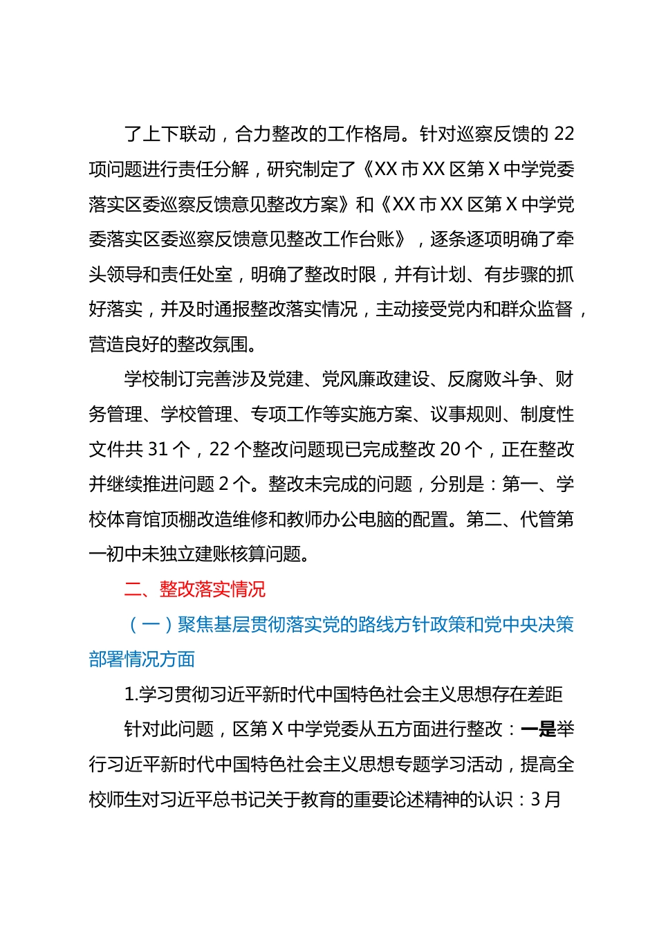 区第X中学党委落实巡察整改集中整改进展情况的报告按照区委统一部署,2022年XX月28日至2023年X月6日,三届XX区委第X巡察组对XX市XX区第X中学进行了常规巡察。2023年X月21日,区委第五巡察组向区第X中学党委反馈了巡察意见。按照党务公开原则和巡察工作有关要求,现将巡察整改进展情况报告如下。一、基本情况区第X中学党委对巡察反馈意见高度重视,把整改工作列入学校工作重要议事日程。党委于2023年3月中旬召开巡察整改民主生活会,专题学习研究反馈意见中所列的存在问题,成立整改工作领导小组,党委书记XXX同志任组长,全面领导学校整改工作;班子其他成员任副组长,学校各处室负责人为成员,根据“谁主管、谁负责”的原则牵头抓好各项具体任务的落实。整改领导小组下设办公室,学校党委副书记、纪委书记XXX同志兼任办公室主任。整改工作开展以来,区第X中学党委书记XXX同志勇于担当,认真履行整改第一责任人职责,5次主持召开整改工作专题会议,亲力亲为抓部署、抓推动、抓落实,并严格要求党政班子成员各负其责,牵头抓好分管领域的整改工作,推动形成了上下联动,合力整改的工作格局。针对巡察反馈的22项问题进行责任分解,研究制定了《XX市XX区第X中学党委落实区委巡察反馈意见整改方案》和《XX市XX区第X中学党委落实区委巡察反馈意见整改工作台账》,逐条逐项明确了牵头领导和责任处室,明确了整改时限,并有计划、有步骤的抓好落实,并及时通报整改落实情况,主动接受党内和群众监督,营造良好的整改氛围。学校制订完善涉及党建、党风廉政建设、反腐败斗争、财务管理、学校管理、专项工作等实施方案、议事规则、制度性文件共31个,22个整改问题现已完成整改20个,正在整改并继续推进问题2个。整改未完成的问题,分别是:第一、学校体育馆顶棚改造维修和教师办公电脑的配置。第二、代管第一初中未独立建账核算问题。二、整改落实情况(一)聚焦基层贯彻落实党的路线方针政策和党中央决策部署情况方面1.学习贯彻习近平新时代中国特色社会主义思想存在差距针对此问题,区第X中学党委从五方面进行整改:一是举行习近平新时代中国特色社会主义思想专题学习活动,提高全校师生对习近平总书记关于教育的重要论述精神的认识:3月22日和4月27日分别召开专题学习会,加强全校教职员工的思想政治教育,提高了师生对习近平总书记关于教育重要论述精神的理解和领会,实现政治自觉、思想自觉和行动自觉,为学校教育教学工作提供了坚实的思想保证。二是落实立德树人根本任务:学校完善教育理念,将立德树人作为根本任务,提高学生的文化素养、道德水平和实践能力,培养全面发展的社会主义建设者和接班人,为国家的未来发展储备了人才。三是加强党建引领,强化爱国主义教育:学校加强爱国主义教育,积极开展系列主题教育活动,如2月20日举行新学期党委书记上第一堂思政课主题活动、4月份开展“革命传统教育周”主题活动、5月4日进行新团员入团宣誓暨老团员重温入党誓词主题活动,切实提高学生的民族自豪感,增强爱国主义观念。这有助于培养学生具有正确的价值观和人生观,为国家的发展贡献力量,举行校园文化节。四是压实意识形态责任制:制定明确的责任制度,将责任明确到每个教职工,确保意识形态工作的有效开展。这有助于形成全校上下共同参与、共同推进的良好氛围,有利于学校意识形态工作的深入开展。五是提高教师教育能力和思想引领能力:加强教师的教育能力培养,增强思想引领和价值观念的塑造能力,使学生形成正确的思想和价值观念,全面发展。这有助于提高教育教学质量,为学生的成长创造良好的条件。2.贯彻中央、省、市关于教育工作的决策部署不够有力区二中党委认真分析原因,从深入学习贯彻习近平总书记关于教育的一系列重要论述、开展党的教育方针贯彻落实专项行动和贯彻落实教育部颁发的《深化新时代教育评价改革总体方案》三方面整改,结合《XX市XX区第X中学办学质量评价指标》,制订和实施学校办学五年发展计划、学校思想政治课教育制度,构建德智体美劳全面培养的教育体系,明确办学目标,办好人民满意的教育。一方面加强政治理论学习,重点是学习2012年以来习近平总书记...