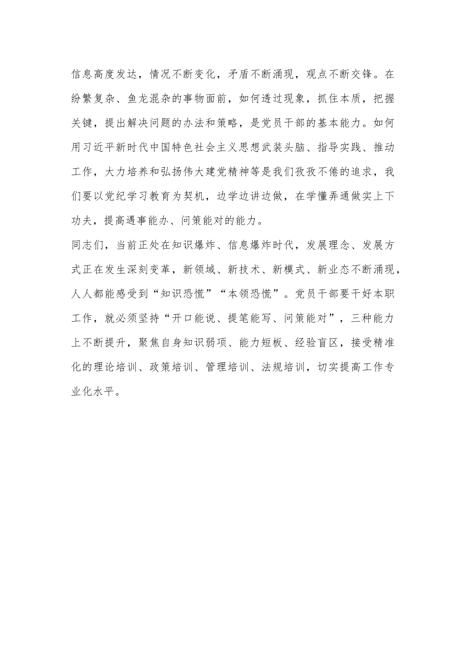 2024年第三季度党课讲稿同志们:根据安排,今天由我和大家一起开展一次党课学习,党课的主题为:聚焦“三种能力”提升,全方位打造高素质党员干部队伍。同志们,党员干部开口能说、提笔能写、问策能对,是核心竞争力也是对党员干部自身素质的要求。党员干部在面对错综复杂的工作和环境时,“不会说、不能写、不懂对”就不能高质量的履行职能职责、开展工作。但这“三种能力”(即,开口能说、提笔能写、问策能对)也不是与生俱来的,都需要在实践中学习、总结、提炼。一、提高开口能说的能力。在工作处理上、开展中开口能说,说到重点是一种能力,对党员干部来说,比如我们面对自身岗位工作时,敢说话、能说话、会说话是一项重要的工作计技巧、技能。当前全党正在开展党纪学习教育,深入学习贯彻《中国共产党纪律处分条例》,学习好贯彻好落实好,可以有效提升党员干部政治理论水平、提高党员干部开口能说的能力。开口能说,不是“开口胡说、乱说”,要理论联系实际、不照本宣科,要将习近平新时代中国特色社会主义思想运用到实际工作中,对岗位相关业务知识都讲得深入浅出。面对群众工作,要用最短的时间、最短的语言,把深刻的道理说明白;语言有新意、思想要深刻,不虚言妄语,不说不着边际、没有根据的话;用真实鲜活的言语表达,不但会引经据典,还会运用人民群众喜闻乐见的惯用语、歇后语、甚至网络用语来表达,让我们在提高开口能说的能力上找到方法。二、提高提笔能写的能力。提笔能写是对党员干部的一项工作能力要求,我们党一贯主张党员干部必须自己动手撰写发言材料、学习体会、发言稿等,这就要求党员干部必须具备这项技能。同志们,毛泽东主席曾说,“枪杆子、笔杆子,革命就靠这两杆子”,由此可见,党员干部具备提笔能写的能力是非常重要的。“文贵于精,精在于练”,写文章在于熟能生巧,写的时候必须有新思想,没有新鲜血液的补充、没有深入的思考、没有思想的碰撞,没有一些很好的讨论,有些东西是出不来的。我们要通过认真学习领会习近平新时代中国特色社会主义思想,学习党规党纪党内法规等,不断加深了对相关理论的理解。围绕每项工作的具体要求,从写作思路、写作技巧、框架结构、注意细节等进行撰写,从不敢写到能够写,从无从下手到精挑细选,不断提高我们提笔能写的能力。能够熟练掌握提笔能写的能力,就能够把工作中的,好经验、好做法及时总结提炼,形成独具特色的工作措施,有利于促进工作水平的提升。三、提高问策能对的能力。最后,我们一起来探讨、交流问策能对这一技能。我想这个“策”包括各种信息、情况和问题,“能对”是对于问题发现得了、分析得准、提得出解决的办法和建议。三国时期诸葛亮是“问策能对”的典范,名垂千古的《隆中对》,指明了刘备争夺天下的前程及路径选择,真正具有指导性和操作性。当前,我们身处新时代、新环境,社会是信息化社会、网络化时代,信息高度发达,情况不断变化,矛盾不断涌现,观点不断交锋。在纷繁复杂、鱼龙混杂的事物面前,如何透过现象,抓住本质,把握关键,提出解决问题的办法和策略,是党员干部的基本能力。如何用习近平新时代中国特色社会主义思想武装头脑、指导实践、推动工作,大力培养和弘扬伟大建党精神等是我们孜孜不倦的追求,我们要以党纪学习教育为契机,边学边讲边做,在学懂弄通做实上下功夫,提高遇事能办、问策能对的能力。同志们,当前正处在知识爆炸、信息爆炸时代,发展理念、发展方式正在发生深刻变革,新领域、新技术、新模式、新业态不断涌现,人人都能感受到“知识恐慌”“本领恐慌”。党员干部要干好本职工作,就必须坚持“开口能说、提笔能写、问策能对”,三种能力上不断提升,聚焦自身知识弱项、能力短板、经验盲区,接受精准化的理论培训、政策培训、管理培训、法规培训,切实提高工作专业化水平。