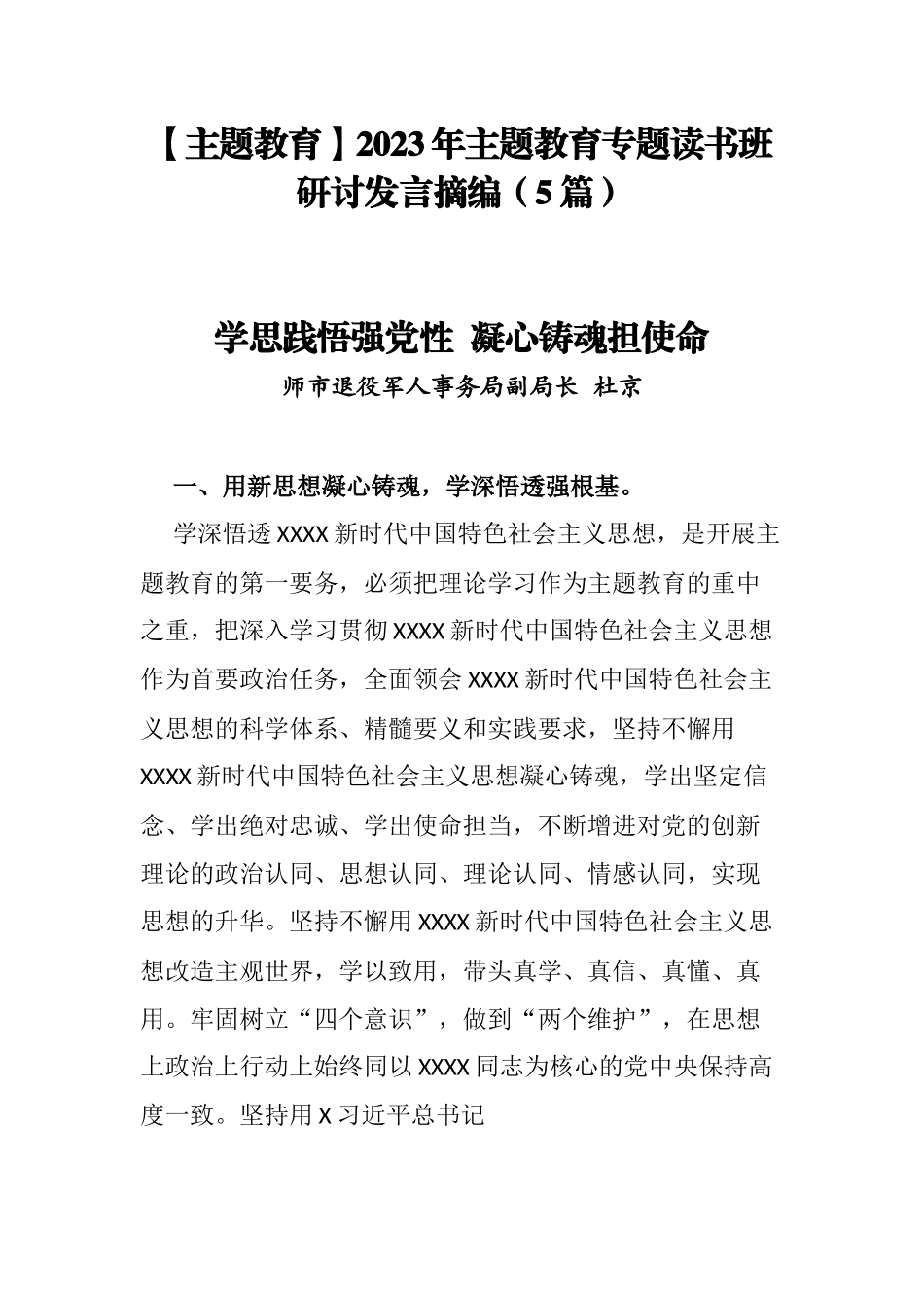 【主题教育】2023年主题教育专题读书班研讨发言摘编(5篇)学思践悟强党性凝心铸魂担使命师市退役军人事务局副局长杜京一、用新思想凝心铸魂,学深悟透强根基。学深悟透XXXX新时代中国特色社会主义思想,是开展主题教育的第一要务,必须把理论学习作为主题教育的重中之重,把深入学习贯彻XXXX新时代中国特色社会主义思想作为首要政治任务,全面领会XXXX新时代中国特色社会主义思想的科学体系、精髓要义和实践要求,坚持不懈用XXXX新时代中国特色社会主义思想凝心铸魂,学出坚定信念、学出绝对忠诚、学出使命担当,不断增进对党的创新理论的政治认同、思想认同、理论认同、情感认同,实现思想的升华。坚持不懈用XXXX新时代中国特色社会主义思想改造主观世界,学以致用,带头真学、真信、真懂、真用。牢固树立“四个意识”,做到“两个维护”,在思想上政治上行动上始终同以XXXX同志为核心的党中央保持高度一致。坚持用X习近平总书记关于退役军人工作重要论述武装头脑、指导实践、推动工作,以理论深度提升思想境界,强化实干实绩导向,潜心研究退役军人工作领域的政策法规和业务知识,在加快退役军人服务保障体系建设、双拥模范城创建、维护退役军人合法权益等方面勇担责任、积极作为。二、用新理念推动发展,凝心聚力强党性。XXXX新时代中国特色社会主义思想是马克思主义中国化的最新成果,是启迪思想、指导实践、推动工作的强大思想武器。主题教育中,我们要坚持深入思考学、问题导向学,着力在以学增智上下功夫。要从党的科学理论中悟规律、明方向、学方法、增智慧,把看家本领、兴党本领、强国本领学到手。要坚持带头坚定理想信念,带头维护党中央的权威和集中统一领导,带头贯彻执行党中央的决策部署,全面深入领会党中央、自治区、兵团和师市党委的决策部署和工作安排,确保执行不偏向、不变通、不走样,把全部精力用到干事创业上。要坚持学以致用、身体力行,把自己摆进去、把职责摆进去、把工作摆进去,当好党委决策的执行者和推动者,激励广大退役军人永远听党话、感党恩、跟党走,退役不褪色、退伍不退志。三、用新方法调查研究,减差补短强本领。一切从实际出发,是我们想问题、作决策、办事情的出发点和落脚点。调查研究是我们党的传家宝,是做好各项工作的基本功。群众满意不满意,是评判主题教育成效的根本标准。要拜人民为师,向人民学习,放下架子、扑下身子,接地气、通下情,“身入”更要“心至”,开展深入细致的调查研究,解决好群众最关心最直接最现实的利益问题,真正把功夫下到察实情、出实招、办实事、求实效上。要树牢人民至上理念,自觉践行初心使命,正确对待名利,发挥党员领导干部的先锋模范作用和关键少数的领头雁作用。要着力掌握退役军人事务工作的短板、弱项、差距和不足,做到了解过往、熟悉近况、预见未来。要深入调查研究,眼睛向下看、身子往下沉,把工作做实做细,做到职工群众的心坎里,当好退役军人的“贴心人”,全力维护退役军人合法权益。四、用新成效检视整改,激浊扬清强弱项。“为学之实,固在践履”。检视整改是本次主题教育的关键所在,要坚持问题导向,做到边学习、边对照、边检视、边整改,把问题整改贯穿主题教育始终。我们要锚定实干担当促发展的目标,树立系统观念,通过建章立制将好的经验做法以制度形式加以固定,巩固扩大主题教育成果。要始终刀刃向内,自觉接受政治体检,认真打扫政治灰尘,切实纠正政治偏差,不断增强自我净化、自我完善、自我革新、自我提高的能力。要引导退役军人工作系统全体党员干部理顺工作思路,聚焦工作重点,创新工作措施,强化跟踪督办,形成工作闭环,力促每一项工作见行见效,解决退役军人急难愁盼问题,做到感情上贴近退役军人、行动上深入退役军人、利益上维护退役军人,确保问题在一线解决,打通服务“最后一公里”,突出重实干、务实功、出实招、办实事、求实效,杜绝“栽盆景”“做虚功”,以扎实的工作作风解决退役军人的难点、痛点、堵点问题,不断推动师市退役军人事业高质量发展。踔厉奋发勇毅创新不断开创审计事业高质量发展新局面师市审计局局长高东磊一是坚持和加强党的全面领导...