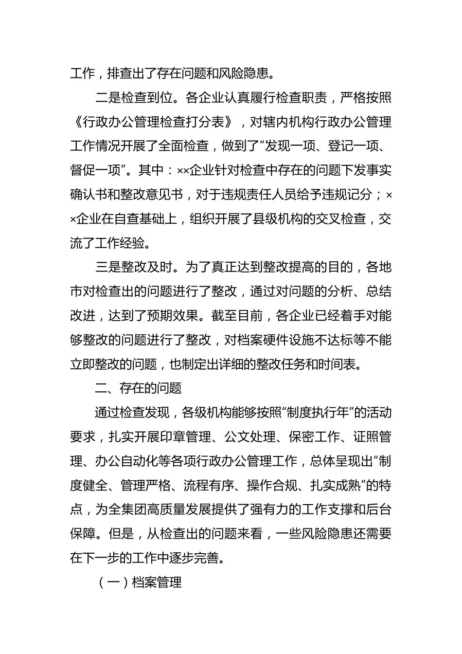 行政办公室行政办公管理检查开展情况汇报为了认真开展“制度执行年”活动,全面提升行政办公管理水平,根据年初工作安排,集团公司自x月x日至x月x日,在全省范围内开展了行政办公管理检查活动。通过检查,发现了风险隐患,查找到问题不足,总结了经验做法完善了相关工作,达到了“边查边改边完善”的效果,有效推动了行政办公管理工作。现将有关检查情况通报如下:一、检查基本情况此次行政办公管理检查活动是按照《关于开展行政办公管理检查活动的通知》文件要求,由集团公司统一组织由各所属企业具体负责,通过听取汇报、查阅资料、问询情况、实地察看等方式,对档案、印章、保密、证照、办公自动化等重点工作进行了检查,检查覆盖面达到了100%。从检查的总体情况看,各级机构基本能够按照集团公司的要求组织开展检查工作,具体有三个特点:一是思想重视。各级机构均认识到行政办公管理检查活动的重要性,加强组织领导,制定检查方案,不仅对检查活动的时间、范围、方式、程序、内容、检查组人员构成做了统一安排,并结合实际,从严、从细、从行政办公管理条线的各个环节和流程入手,认真做好自查、抽查和整改各阶段工作,排查出了存在问题和风险隐患。二是检查到位。各企业认真履行检查职责,严格按照《行政办公管理检查打分表》,对辖内机构行政办公管理工作情况开展了全面检查,做到了“发现一项、登记一项、督促一项”。其中:××企业针对检查中存在的问题下发事实确认书和整改意见书,对于违规责任人员给予违规记分;××企业在自查基础上,组织开展了县级机构的交叉检查,交流了工作经验。三是整改及时。为了真正达到整改提高的目的,各地市对检查出的问题进行了整改,通过对问题的分析、总结改进,达到了预期效果。截至目前,各企业已经着手对能够整改的问题进行了整改,对档案硬件设施不达标等不能立即整改的问题,也制定出详细的整改任务和时间表。二、存在的问题通过检查发现,各级机构能够按照“制度执行年”的活动要求,扎实开展印章管理、公文处理、保密工作、证照管理、办公自动化等各项行政办公管理工作,总体呈现出“制度健全、管理严格、流程有序、操作合规、扎实成熟”的特点,为全集团高质量发展提供了强有力的工作支撑和后台保障。但是,从检查出的问题来看,一些风险隐患还需要在下一步的工作中逐步完善。(一)档案管理一是档案室硬件设备不达标。受办公条件限制,部分县级行社没有专用的档案室,密集架、计算机、打印机等设备配置不全,防潮、防鼠、防虫等安全设施不完善。二是档案登记簿使用不规范。一些档案文件的借阅、移交登记簿记录不完整、不全面。三是档案资料整理不规范。部分企业的档案资料未及时整理排列上架,没有对电子文件进行存档整理。四是档案管理人员不到位。一些企业未设置专(兼)职档案管理员。(二)印章管理各级机构虽然建立了印章管理制度,但一部分企业在管理中还不够严密、科学,存在瑕疵和纰漏,部分企业《印章使用登记簿》和《印章交接登记簿》要素不全,登记不全,有些还存在多个登记簿混用的现象。(三)公文处理部分企业存在公文核稿质量不高,收文不及时,文件办理效率不高、责任不明确、保密意识淡薄等问题。(四)保密管理一些企业对保密工作认识不到位,虽然逐级签订了《保密承诺书》,但未能有计划地开展保密宣传教育工作有的单位相关职能部室未设立保密员;有的单位秘密文件复印、收发、分送、借阅、移交、销毁等未登记造册;有的单位涉及商业秘密的保密期限未按规定的标注方法进行标注、管理和登记备案。(五)证照管理各级机构高度重视证照管理工作,能够及时做好证照的申领、变更、登记、管理工作,但是一部分企业没有明确证照管理的部门及岗位职责,存在证照使用不规范,证照年检变更不及时等问题。(六)信息披露各级机构能够定期做好信息披露工作,并确保披露内容真实、有效。但是部分企业存在信息披露不及时、不完整,未按相关要求进行公开等问题。(七)内控建设一些企业内控制度建设过多地依赖上级机构,内控制度建设不主动,缺乏内生动力,真正结合自身实际制定的较少,导致部分规章制度更新不及时,内...