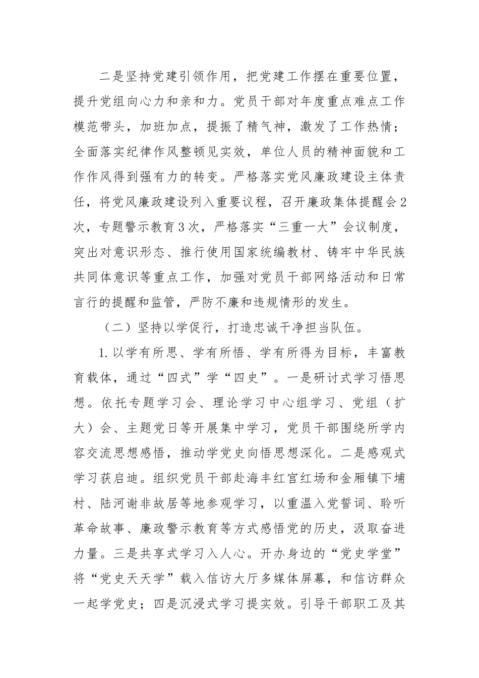 市信访局党组2022年上半年抓党建工作情况总结报告今年以来,X市信访局党组在市委的正确领导下,以习近平新时代中国特色社会主义思想为指导,强化底线思维围绕“为民解难、为党分忧”的信访工作使命,认真学习贯彻习近平总书记关于党的基层组织建设的重要论述,紧紧依照基层党建三年行动计划,树牢党组抓党建的鲜明导向,党组领导班子成员认真履职尽责,不断推动市信访局各项党建工作落实到位,不断夯实信访局党支部的政治基础,为全市信访工作创新发展,维护社会大局稳定作出了应有贡献。现将有关情况报告如下:一、主要工作(一)坚持党要管党,夯实基层党建根基一是坚持党组领导作用,把组织建设作为第一抓手,夯实党建和业务工作基础。我局落实党组书记“一把手”责任,党组成员一岗双责,对全局党建工作进行细心谋划构建上下同心、齐抓党建的良好运行机制。局党组成员以身作则带领全局人员切实增强“四个意识”、坚定“四个自信”,坚决做到“两个维护”,贯穿于全市信访工作。把加强支部班子建设、抓好党员教育管理、完善支部工作制度规范内部管理作为机关党建重点。坚持党组中心组理论学习制度,认真遵守“三会一课”制度,坚持党组成员每季度上一次党课制度。印发了支部年度工作计划和学习计划,针对基层党建工作阶段性任务做出各项妥善安排;今年以来,召开集中学习会议X次,集中观看党建教育片3次。二是坚持党建引领作用,把党建工作摆在重要位置,提升党组向心力和亲和力。党员干部对年度重点难点工作模范带头,加班加点,提振了精气神,激发了工作热情;全面落实纪律作风整顿见实效,单位人员的精神面貌和工作作风得到强有力的转变。严格落实党风廉政建设主体责任,将党风廉政建设列入重要议程,召开廉政集体提醒会2次,专题警示教育3次,严格落实“三重一大”会议制度,突出对意识形态、推行使用国家统编教材、铸牢中华民族共同体意识等重点工作,加强对党员干部网络活动和日常言行的提醒和监管,严防不廉和违规情形的发生。(二)坚持以学促行,打造忠诚干净担当队伍。1.以学有所思、学有所悟、学有所得为目标,丰富教育载体,通过“四式”学“四史”。一是研讨式学习悟思想。依托专题学习会、理论学习中心组学习、党组(扩大)会、主题党日等开展集中学习,党员干部围绕所学内容交流思想感悟,推动学党史向悟思想深化。二是感观式学习获启迪。组织党员干部赴海丰红宫红场和金厢镇下埔村、陆河谢非故居等地参观学习,以重温入党誓词、聆听革命故事、廉政警示教育等方式感悟党的历史,汲取奋进力量。三是共享式学习入人心。开办身边的“党史学堂”将“党史天天学”载入信访大厅多媒体屏幕,和信访群众一起学党史;四是沉浸式学习提实效。引导干部职工及其家人积极参加线上、线下党史知识竞赛,共学党史,让红色基因、革命薪火代代传承。2.将“我为群众办实事”实践活动与了解民情、集中民智、维护民利、凝聚民心各项工作有机结合,全力化解信访矛盾纠纷、维护群众合法权益。一是信访事项办理保持“加速度”。健全完善信、访、网、电、视频“五位一体”诉求平台,持续提高信访事项流转、受理、办理、办结效率。信访事项受理率、办结率达到100%,群众满意度逐步提高。二是信访积案化解按下“快进键”。深入推进重复信访治理、化解信访积案专项行动,加快国家交办的第一批X宗、第二批X宗信访积案攻坚化解,切实维护群众合法权益。三是组织开展信访法律法规宣传活动,采取包括网络媒体、户外广告、发放宣传资料和送法上门等多种方式进行宣传,切实提高群众依法信访观念和理性维权意识,引导群众依法逐级信访维护信访秩序,推进信访工作规范化、法治化建设。四是推动局党员干部积极参与“返乡走亲”、“双报到双服务”、卫生网格化管理等活动。“学党史办实事”学习教育活动开展以来,市信访局累计收到群众送来锦旗X面,感谢信X封。局全体党员干部坚持以维护社会稳定为己任,发挥党组和党员的先锋模范作用。认真贯彻落实上级信访部门“大督查、大接访、大调解”工作要求,拟定了市领导常态化接访下访制度,建立了信访部门巡回接访制度,定期下基层接访,推动“精准务实”的...
