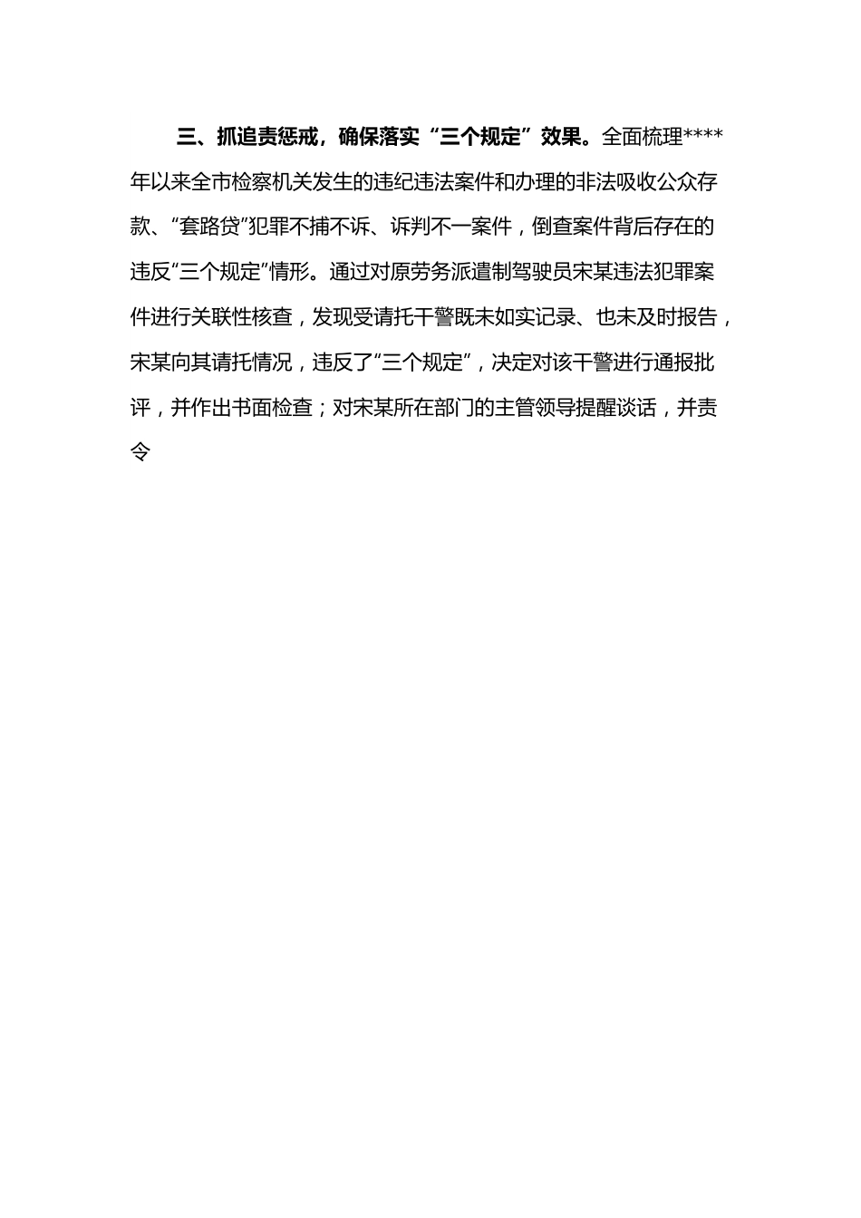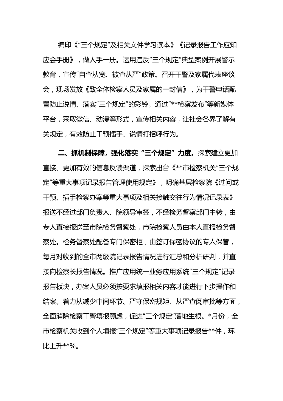防止干预司法“三个规定”落实情况报告在队伍教育整顿试点工作中,**市检察院把落实“三个规定”专项整治作为重大政治任务扎实推进,在“基础”“力度”“效果”三个方面持续发力,打造具有鲜明特色防止干预司法“三个规定”填报工作的**检察样板。一、抓教育引导,夯实落实“三个规定”基础。一是用好整治“增压器”。针对落实“三个规定”工作还存在思想认识不够到位、工作开展不够均衡、压力传导层层递减等问题,市检察院以开展顽瘴痼疾为契机把贯彻执行“三个规定”作为一个整治重点,召开全市检察机关违反防止干预司法“三个规定”问题专项整治动员部署会,在全市检察系统层层压实主体责任。二是画出思想“同心圆”。邀请高检院检务督察局二处处长**作“三个规定”专题辅导讨论,设立咨询电话,答疑、解释“三个规定”执行及记录报告有关问题,组织离退休老干部专题学习解读“三个规定”并签订“承诺书”,开展全员学习讨论等,让每名检察人员深入了解“三个规定”的具体内容和要求,引导干警将“三个规定”精神内化于心、外化于形。三是营造宣传“新声势”。编印《“三个规定”及相关文件学习读本》《记录报告工作应知应会手册》,做人手一册。运用违反“三个规定”典型案例开展警示教育,宣传“自查从宽、被查从严”政策。召开干警及家属代表座谈会,现场发放《致全体检察人员及家属的一封信》,为干警电话配置防止说情、落实“三个规定”的彩铃。通过“**检察发布”等新媒体平台,采取微信、动漫等形式,宣传相关内容,让社会各界了解有关规定,有效防止干预插手、说情打招呼行为。二、抓机制保障,强化落实“三个规定”力度。探索建立更加直接、更加有效的信息反馈渠道,探索出台《**市检察机关“三个规定”等重大事项记录报告管理使用规定》,明确基层检察院《过问或干预、插手检察办案等重大事项及相关接触交往行为情况记录表》报送不经过部门负责人、院领导审签,不经检务督察部门中转,由专人直接报送至市院检务督察处,市院检察人员由本人直报检务督察处。检务督察处配备专门保密柜,由签订保密协议的专人保管,每月对收到的全市两级院记录报告情况进行汇总和分析研判,并直接向检察长报告情况。推广应用统一业务应用系统“三个规定”记录报告板块,办案人员必须按要求填报相关内容才能进行下步操作和结案。着力从减少中间环节、严守保密规矩、从严查阅审批等方面,全面消除检察干警填报顾虑,促进“三个规定”落地生根。*月份,全市检察机关收到个人填报“三个规定”等重大事项记录报告**件,环比上升**%。三、抓追责惩戒,确保落实“三个规定”效果。全面梳理****年以来全市检察机关发生的违纪违法案件和办理的非法吸收公众存款、“套路贷”犯罪不捕不诉、诉判不一案件,倒查案件背后存在的违反“三个规定”情形。通过对原劳务派遣制驾驶员宋某违法犯罪案件进行关联性核查,发现受请托干警既未如实记录、也未及时报告,宋某向其请托情况,违反了“三个规定”,决定对该干警进行通报批评,并作出书面检查;对宋某所在部门的主管领导提醒谈话,并责令其向党组作出书面检查。同时,把落实“三个规定”情况作为民主生活会和组织生活会的重要内容,纳入干部选拔任用和年度绩效考核体系,记入干警廉政档案、领导干部的业绩档案,作为干警年度考核、评选选优、提拔重用、职级晋升的重要依据。