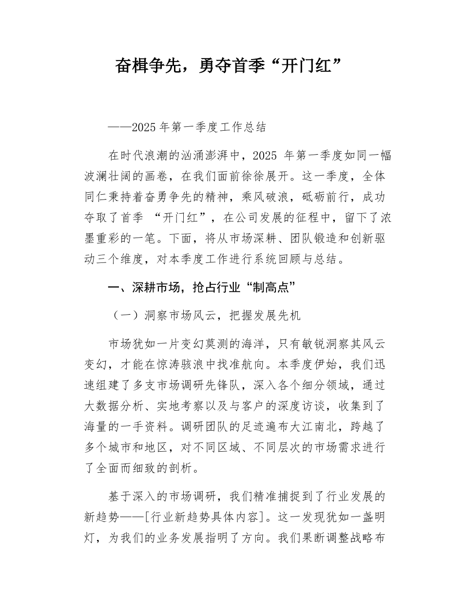 奋楫争先,勇夺首季“开门红”——2025年第一季度工作总结在时代浪潮的汹涌澎湃中,2025年第一季度如同一幅波澜壮阔的画卷,在我们面前徐徐展开。这一季度,全体同仁秉持着奋勇争先的精神,乘风破浪,砥砺前行,成功夺取了首季“开门红”,在公司发展的征程中,留下了浓墨重彩的一笔。下面,将从市场深耕、团队锻造和创新驱动三个维度,对本季度工作进行系统回顾与总结。一、深耕市场,抢占行业“制高点”(一)洞察市场风云,把握发展先机市场犹如一片变幻莫测的海洋,只有敏锐洞察其风云变幻,才能在惊涛骇浪中找准航向。本季度伊始,我们迅速组建了多支市场调研先锋队,深入各个细分领域,通过大数据分析、实地考察以及与客户的深度访谈,收集到了海量的一手资料。调研团队的足迹遍布大江南北,跨越了多个城市和地区,对不同区域、不同层次的市场需求进行了全面而细致的剖析。基于深入的市场调研,我们精准捕捉到了行业发展的新趋势——[行业新趋势具体内容]。这一发现犹如一盏明灯,为我们的业务发展指明了方向。我们果断调整战略布局,集中优势资源,迅速进军[新业务领域]。在新领域中,我们凭借前瞻性的战略眼光和勇于开拓的精神,抢先一步推出了契合市场需求的[新产品或服务],成功吸引了众多客户的目光,在激烈的市场竞争中抢占了先机,赢得了市场份额的快速增长。(二)精耕客户关系,铸就品牌口碑客户是企业生存和发展的基石,是我们最宝贵的财富。本季度,我们始终将客户满意度放在首位,致力于为客户提供全方位、个性化的优质服务。从售前的专业咨询,到售中的高效执行,再到售后的贴心关怀,我们为客户打造了一站式服务体验,让客户在每一个环节都感受到我们的诚意与专业。为了更好地满足客户需求,我们建立了客户反馈快速响应机制。专门设立了客户服务热线和线上反馈平台,确保客户的每一条意见和建议都能得到及时的收集和处理。对于客户反馈的问题,我们实行限时解决制度,安排专人跟进,直至问题得到圆满解决。通过这些举措,我们不仅有效提升了客户满意度,还赢得了客户的高度认可和信赖,铸就了良好的品牌口碑。许多客户成为了我们的忠实粉丝,不仅自身持续与我们合作,还积极为我们推荐新客户,为公司业务的拓展起到了积极的推动作用。(三)拓展营销渠道,奏响市场强音在信息爆炸的时代,营销渠道的多元化是企业拓展市场的关键。本季度,我们打破传统营销思维的束缚,积极探索线上线下融合的全渠道营销模式。在线上,我们充分利用社交媒体、搜索引擎营销、内容营销等数字化手段,打造了全方位的品牌宣传矩阵。通过制作高质量的短视频、撰写有深度的行业文章等方式,吸引了大量潜在客户的关注,提升了品牌的知名度和影响力。在线下,我们积极参加各类行业展会、研讨会和招商会,展示公司的最新产品和技术成果。在展会上,我们精心设计的展位吸引了众多参观者的目光,专业的销售人员与客户进行面对面的沟通和交流,深入了解客户需求,现场达成了多项合作意向。此外,我们还与各地的经销商和合作伙伴建立了紧密的合作关系,借助他们的渠道优势,进一步扩大了产品的市场覆盖范围。通过线上线下的协同发力,我们奏响了市场拓展的最强音,为公司业务的增长注入了强劲动力。二、协同作战,锻造团队“硬实力”(一)汇聚精英力量,打造攻坚团队人才是企业发展的核心竞争力,一支优秀的团队是企业取得成功的关键。本季度,我们通过内部选拔和外部招聘相结合的方式,汇聚了一批来自不同领域的精英人才,组建了多个项目攻坚团队。这些团队成员不仅具备扎实的专业知识和丰富的工作经验,还拥有强烈的责任心和团队合作精神。在团队组建过程中,我们注重人才的多元化和互补性。根据项目的特点和需求,合理搭配团队成员,确保每个团队都具备全面的专业能力和高效的执行能力。同时,我们为团队成员提供了广阔的发展空间和良好的工作环境,激发他们的工作热情和创造力,让他们在团队中充分发挥自己的优势,实现个人价值与团队目标的有机统一。(二)强化团队协作,提升执行效能团队协作是团队战斗力的源泉,只有各成员之间密切配合、协同作战,才能发挥出团队的最大效能。本季度...