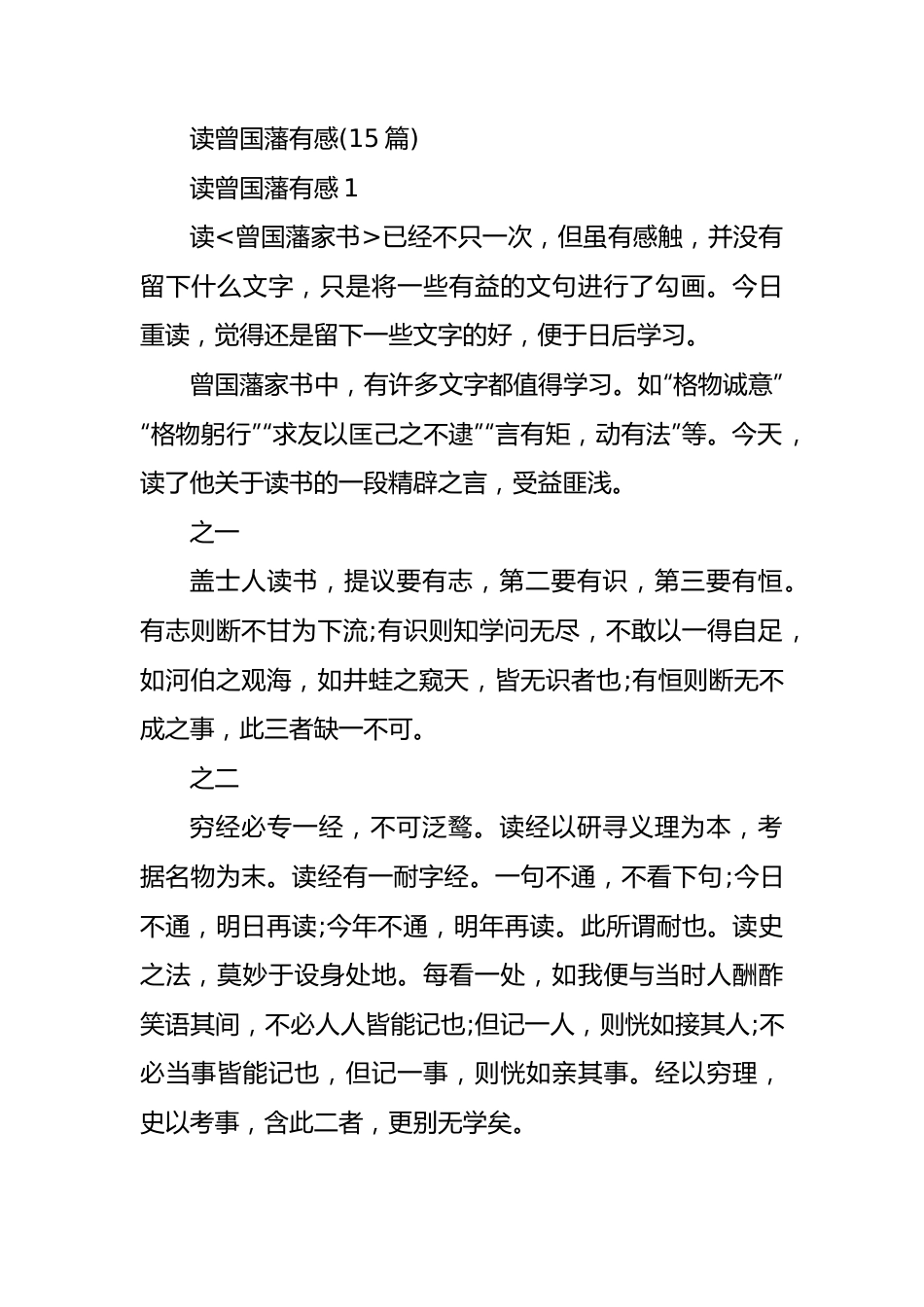 读曾国藩有感(15篇)读曾国藩有感1读<曾国藩家书>已经不只一次,但虽有感触,并没有留下什么文字,只是将一些有益的文句进行了勾画。今日重读,觉得还是留下一些文字的好,便于日后学习。曾国藩家书中,有许多文字都值得学习。如“格物诚意”“格物躬行”“求友以匡己之不逮”“言有矩,动有法”等。今天,读了他关于读书的一段精辟之言,受益匪浅。之一盖士人读书,提议要有志,第二要有识,第三要有恒。有志则断不甘为下流;有识则知学问无尽,不敢以一得自足,如河伯之观海,如井蛙之窥天,皆无识者也;有恒则断无不成之事,此三者缺一不可。之二穷经必专一经,不可泛鹜。读经以研寻义理为本,考据名物为末。读经有一耐字经。一句不通,不看下句;今日不通,明日再读;今年不通,明年再读。此所谓耐也。读史之法,莫妙于设身处地。每看一处,如我便与当时人酬酢笑语其间,不必人人皆能记也;但记一人,则恍如接其人;不必当事皆能记也,但记一事,则恍如亲其事。经以穷理,史以考事,含此二者,更别无学矣。之三诸子百家,汗牛充栋,或欲阅之,但当读一人之专集,不当东翻西阅。一集未读完,断断不换他集,亦专字诀也。每日习字不必多,作百字可耳。读背诵之书不必多,十页可耳。看涉猎之书不必多,亦十页可耳。但一部未完不可换他部,此万万不易之道。看来,对于读书、习字,曾国藩是颇有一番见解,值得借鉴。读曾国藩有感2读了南京师范大学副教授郦波的《曾国藩家训》(上下),感受颇深,特别是讲到曾国藩的日课十二条,每天持之以恒的践行,非常受益。结合自身实际,反思自己也存在比较突出的七条问题和恶习。一是抖脚;二是无事看手机;三是不善总结;四是不细心;五是不能从容;六是臆测行事;七是不耐烦。等等因此也制定了自己的日课七条:1.早起。冬春6点起床,23点前睡觉,午休1小时。2.专敬。一是早起后思考自己的人生目标和存在差距。二是集中精力做好一件事后再做下一件事情。三是保持精神振奋。四是时刻不间断琢磨从事业务工作。五是严以自律,公私分明,时刻与自己的私心作斗争。3.谨言。一是正确领会领导意图,及时汇报沟通。二是背后莫论人非。三是不当众批评人。4.保身。一是节劳。保持专注力,勿分散精力;中午午休,工作间隙运动10分钟。二是节欲。只问耕耘,不问收获。三是节饮食。不饮酒、不吃辣;早起一杯温水、一碗黑米粥;晚饭吃中饭一半并不吃肉;饭前喝汤。四是锻炼早起做2次平板支撑、俯卧撑、下蹲各10个;下班后跑步30分钟及以上;每周打一次羽毛球。5.研文。一是每天剖析一段或一篇文章,并记录纳入知识体系。二是不看任何参考资料、用手写的方法检验学习成效。6.读书留痕。一是读书不二。二是读不懂不往下读。三是每读一次书须做读书笔记。四是每月至少读两本书,每日至少读10页,每读完一本书须写读后感。7.日有所获。一是用日记反省不足。二是静坐30分钟。三是完成一篇、一次公务活动等较大工作量的须在日记进行总结。四是每日梳理所学,并纳入知识结构。读曾国藩有感3近日一直在读好朋友送的《曾国藩家书精选》,同治元年四月二十四日给纪泽、纪鸿的信中,曾国藩这样写道“人之气质,由于天生,本难改变,惟读书则可变化气质。古之精相法者,并言读书可以变换骨相。欲求变之之法,总须先立坚卓之志”。大意为:人的气质,与生俱来,本来难以改变,只有读书才可以改变它,重新塑造气质。古代精于相面的人,都说读书可以改变骨相。要求得变骨相的方法,必须先立下坚定不移的志向。读完此文有以下两点感悟:一、读书改变气质。曾国藩是一介书生,靠科举发家,最后权倾朝野。在《曾国藩家书》中多次提到读书的重要性,他谆谆教诲家人子弟要读书,“读书贵精专”,“须用困知勉行功夫”,“读书有一耐字诀”。读书可以改变气质,这一点毋庸置疑,且与“满腹诗书气自华”表达的意思完全相同,现今提倡的“知识改变命运”则把读书的重要性提升到一个更高的层面。二、立坚卓之志。古往今来,凡是有所成就之人必先立坚卓之志,才能锲而不舍,持之以恒,终成大器。道理浅显易懂,做起来却是千难万难。当今世界,灯红酒绿、物欲横流,多少人在宦海商场中颠扑沉...