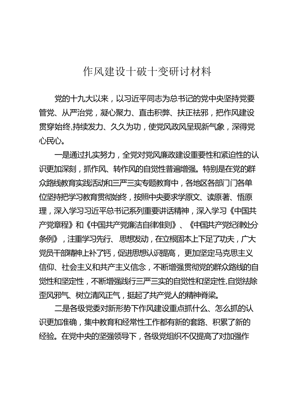 作风建设十破十变研讨材料党的十九大以来,以习近平同志为总书记的党中央坚持党要管党、从严治党,凝心聚力、直击积弊、扶正祛邪,把作风建设贯穿始终,持续发力、久久为功,使党风政风呈现新气象,深得党心民心。一是通过扎实努力,全党对党风廉政建设重要性和紧迫性的认识更加深刻,抓作风、转作风的自觉性普遍增强。特别是在党的群众路线教育实践活动和三严三实专题教育中,各地区各部门门各单位坚持把学习教育贯彻始终,按照中央要求学原文、读原著、悟原理,深入学习习近平总书记系列重要讲话精神,深入学习《中国共产党章程》和《中国共产党廉洁自律准则》、《中国共产党纪律处分条例》,注重学习先行、思想发动,在立根固本上下足了功夫,广大党员干部精神上补了钙,促进思想认识提高,更加坚定马克思主义信仰、社会主义和共产主义信念,不断增强贯彻党的群众路线的自觉性和坚定性,不断增强践行三严三实的自觉性和坚定性,自觉祛除歪风邪气、树立清风正气,挺起了共产党人的精神脊梁。二是各级党委对新形势下作风建设重点抓什么、怎么抓的认识更加准确,集中教育和经常性工作都有新的套路、积累了新的经验。在党中央的坚强领导下,各级党组织不仅提高了对加强作风建设的思想认识,增强了落实管党治党的主体责任,而且明确了新形势下作风建设的思路和方法,丰富了管党治党经验,着力把依规治党与以德治党紧密结合起来,把经常性教育与集中教育紧密结合起来。进一步认识到抓作风建设要返朴归真、固本培元,在加强党性修养的同时,弘扬中华优秀传统文化;要把纪律建设摆在更加突出位置,坚持纪严于法、纪在法前,用政治纪律、组织纪律、廉洁纪律、群众纪律、工作纪律、生活纪律管住全体党员;作风建设一定要咬住常、长两字,经常抓、深入抓、持久抓,不断提高党的建设科学化水平。三是形式主义、官僚主义、享乐主义和奢靡之风得到有力整治,领导干部中不严不实问题得到初步解决,一大批老虎、苍蝇被绳之以党纪国法,不敢腐的氛围总体形成,不能腐、不想腐的工作正在深化。3年多来,我们党聚焦四风,突出问题导向,以解决问题开局亮相、以正风肃纪先声夺人、以专项整治寻求突破,出重拳、用重典,不断拧紧螺丝、上紧发条,刹住了四风蔓延势头,着力解决管党治党失之于宽、失之于松、失之于软的问题,使不敢腐的震慑作用充分发挥,不能腐、不想腐的效应初步显现,反腐败斗争压倒性态势正在形成,党的优良传统和作风得到恢复和发扬,进一步密切党群干群关系,政治生态清朗起来。四是党风廉政建设制度法规更加完善,制度笼子扎得更紧,制度执行力和纪律约束力明显增强。3年多来,我们党在推进作风建设中及时把成功经验转化为制度成果,为全面从严治党提供制度利器。坚持解决问题与建章立制相结合,坚持健全制度与执行制度相结合,以转作风改作风为重点的制度体系更加完善。中央相继出台党政机关厉行节约反对浪费、国内公务接待管理、公务用车改革等一系列制度,颁布实施新修订的《中国共产党廉洁自律准则》、《中国共产党纪律处分条例》,强化了对不良作风的刚性约束,按规矩办事、按规矩用权意识显著增强,党的纪律更加严格,党内生活更加规范。五是党风廉政建设推动了全面从严治党,促进了改革发展稳定各项工作。风清则气正,气正则心齐,心齐则事成。3年多来,随着作风建设的扎实推进,推动了党风民风社风明显好转,在全党全社会弘扬了正气,使党在人民群众中威信和形象进一步树立,党心民心进一步凝聚,♘植了党执政的政治基础,形成了推动改革发展的强大正能量,。实践充分证明,我们党在推进全面从严治党中把抓作,风作为先手棋,一子落、满盘活,为新形势下我们党进行具有新的历史特点的伟大斗争提供了坚强保证。作风建设永远在路上,全面从严治党永远在路上。如今,反腐败斗争压倒性态势正在形成,党风廉政建设和反腐败斗争形势依然严峻复杂。我们要对四风问题和一切腐败现象穷追猛打、除恶务尽。继续前行的集合号已经吹响。习近平总书记在十八届中央纪委六次全会的重要讲话中,明确了20年党风廉政建设和反腐败斗争的五大工作要点。一是尊崇党章,严格执行准则和条例;二是坚持坚...