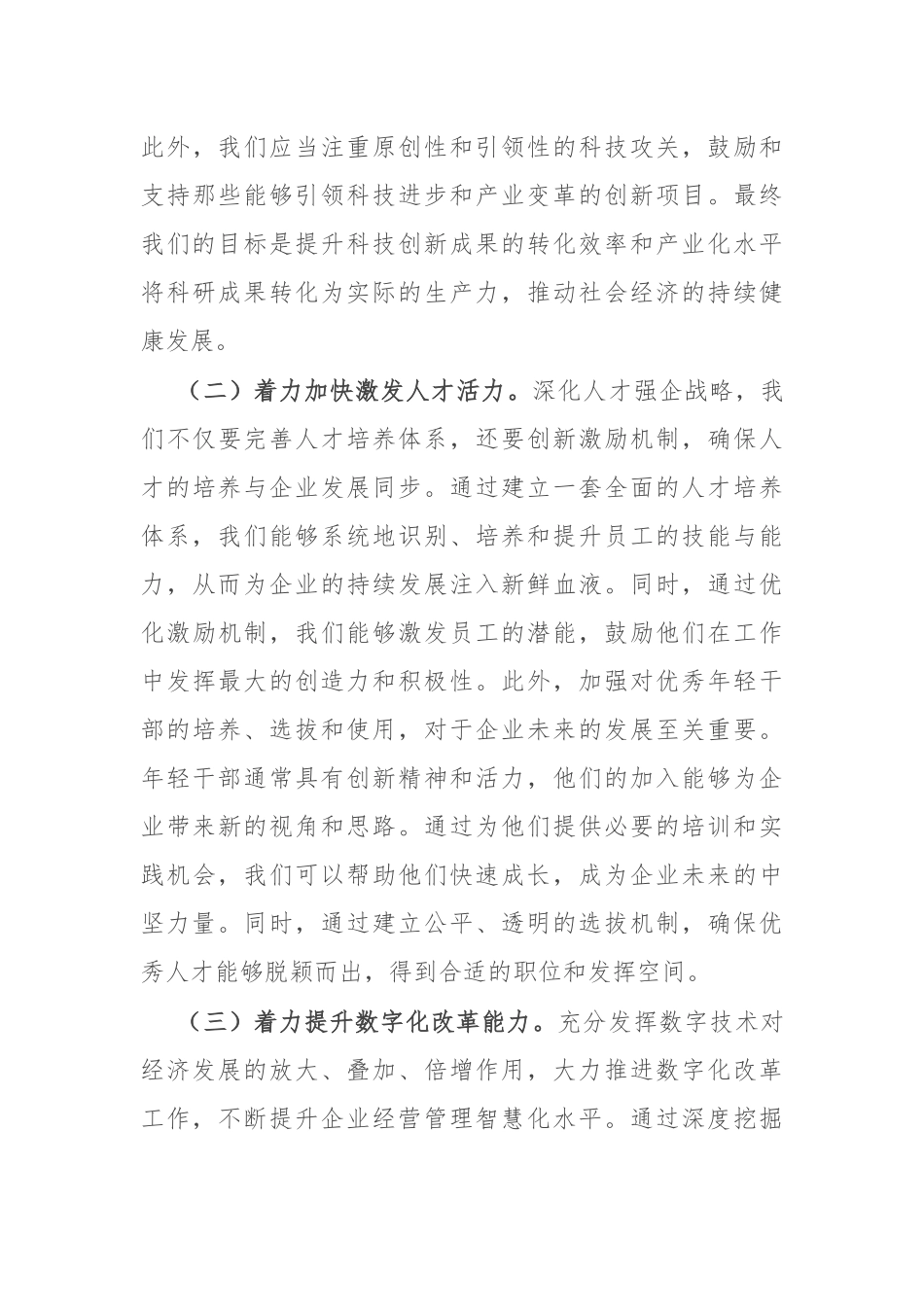 公司党委书记、董事长理论中心组关于发展新质生产力的研讨发言同志们:加快发展新质生产力,是我们党把握新一轮科技革命和产业变革新机遇、推动经济高质量发展的战略选择。奋进新征程建功新时代,就要牢牢把握高质量发展这个首要任务,围绕“打造国内一流工程投资建设运营综合服务商”战略定位,聚焦“质量、效益、规模、品牌、文化”五大发展目标,锚定“一流的工程总承包商”“一流的城市投资开发运营商”“一流的建筑科技服务商”“一流的基础设施集成商”“一流的生态环境修复服务商”等“五个一流”发展愿景,坚定不移推进新质生产力发展,为全力谱写中国式现代化企业篇章贡献力量。下面,我谈几点体会以供同志们参考。一、提高站位,充分认识发展新质生产力的重要意义党的二十届三中全会指出,要以科技创新推动产业创新,特别是以颠覆性技术和前沿技术催生新产业、新模式、新动能,发展新质生产力。当前,企业发展面临新的机遇和挑战,必须坚持问题导向、系统观念、底线思维,着力解决影响高质量发展的突出问题,努力实现更高质量、更有效率、更加公平、更可持续、更为安全的发展。发展新质生产力是顺应新一轮科技革命和产业变革趋势、推动经济结构优化升级的迫切需要;是坚持以人民为中心的发展思想、满足人民对美好生活向往的现实需要;是统筹发展和安全、实现可持续发展的必然要求。我们要深刻认识到发展新质生产力是事关全局的系统性、深层次变革,是立足当前、着眼长远的战略谋划,必须把发展新质生产力作为一项紧迫任务抓实抓好。二、聚焦重点,加快培育发展新质生产力的主阵地加快发展新质生产力是一项复杂的系统工程,涉及领域新、技术含量高、创新难度大。我们以习近平中国特色社会主义思想为指导,全面贯彻落实党的二十届三中全会精神和中央经济工作会议精神,完整准确全面贯彻新发展理念,紧紧围绕“打造国内一流工程投资建设运营综合服务商”这一战略定位,聚焦“五个一流”发展目标,突出重点领域和关键环节发力,加快培育发展新质生产力的主阵地。(一)着力提高科技创新能力。我们必须坚定不移地贯彻执行创新驱动发展战略,不断加大对科技创新的资金投入,以确保科研活动的持续性和深入性。同时,我们还需要积极加强与各类科研院所和研究机构的合作与交流,通过建立稳固的伙伴关系,共同推进科学技术的前沿研究。此外,我们应当注重原创性和引领性的科技攻关,鼓励和支持那些能够引领科技进步和产业变革的创新项目。最终我们的目标是提升科技创新成果的转化效率和产业化水平将科研成果转化为实际的生产力,推动社会经济的持续健康发展。(二)着力加快激发人才活力。深化人才强企战略,我们不仅要完善人才培养体系,还要创新激励机制,确保人才的培养与企业发展同步。通过建立一套全面的人才培养体系,我们能够系统地识别、培养和提升员工的技能与能力,从而为企业的持续发展注入新鲜血液。同时,通过优化激励机制,我们能够激发员工的潜能,鼓励他们在工作中发挥最大的创造力和积极性。此外,加强对优秀年轻干部的培养、选拔和使用,对于企业未来的发展至关重要。年轻干部通常具有创新精神和活力,他们的加入能够为企业带来新的视角和思路。通过为他们提供必要的培训和实践机会,我们可以帮助他们快速成长,成为企业未来的中坚力量。同时,通过建立公平、透明的选拔机制,确保优秀人才能够脱颖而出,得到合适的职位和发挥空间。(三)着力提升数字化改革能力。充分发挥数字技术对经济发展的放大、叠加、倍增作用,大力推进数字化改革工作,不断提升企业经营管理智慧化水平。通过深度挖掘数字技术的潜力,我们可以实现对传统产业的转型升级,促进新兴产业的快速发展。数字化改革不仅能够提高企业的运营效率,降低运营成本,还能够增强企业的市场竞争力,帮助企业更好地适应数字经济时代的需求。在数字化改革的进程中,企业需要积极拥抱云计算、大数据、人工智能等前沿技术,将这些技术应用于产品设计、生产制造市场营销、客户服务等各个环节。通过智能化的决策支持系统,企业能够更加精准地把握市场动态,快速响应消费者需求的变化。同时,数字化转型还能够帮...
