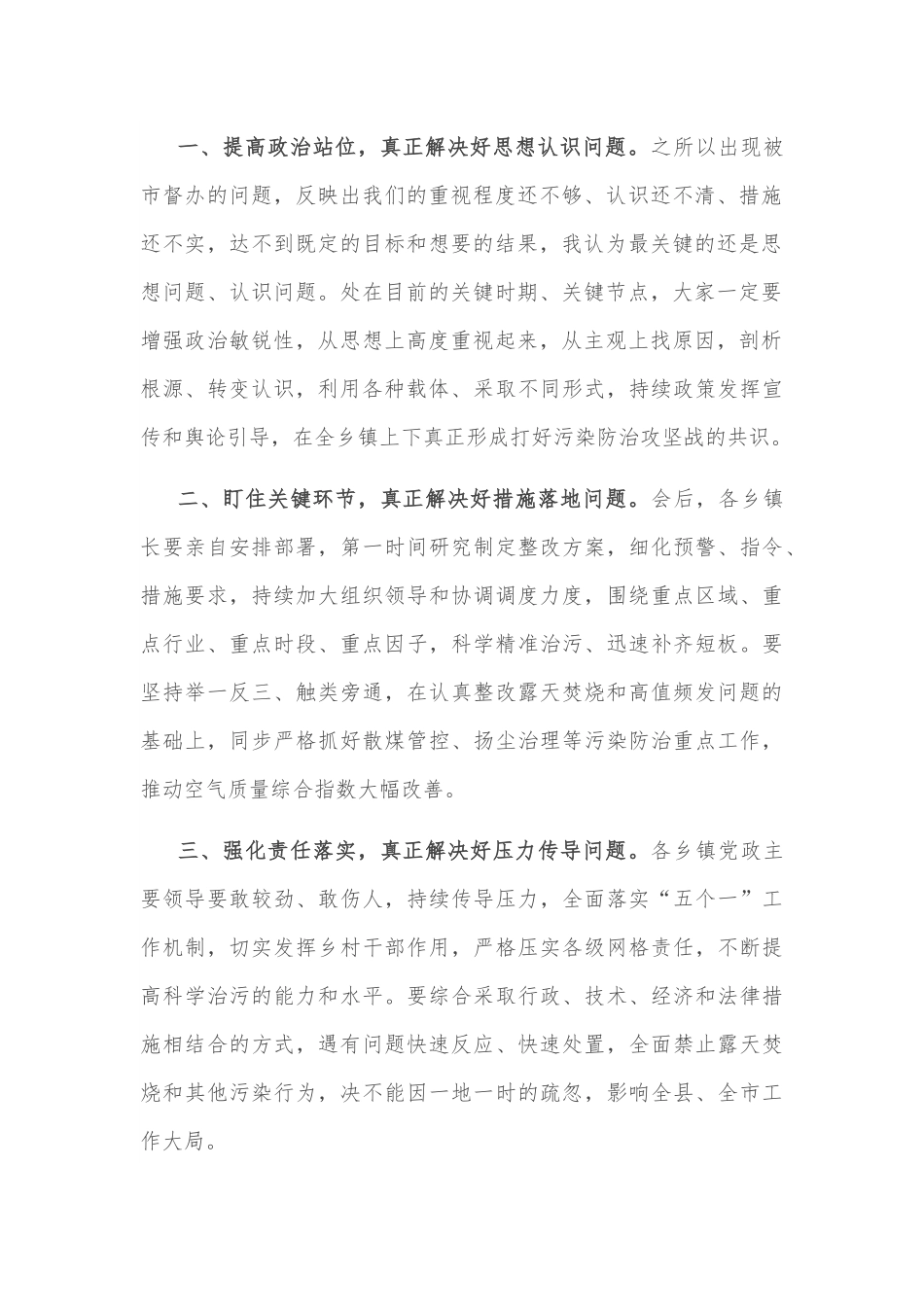 露天焚烧问题约谈讲话提纲同志们:按照市大气污染防治工作领导小组办公室督办要求,今天我专门召集*、*、*、*共*个乡镇的政府主要同志,就露天焚烧和PM2.5高值推送次数最多的问题进行约谈。目的就是要针对当前存在的突出问题,敦促各乡镇特别是在座的乡镇长同志们,深刻反思根源、真正找准症结,切实转变作风、拿出改进措施,迅速扭转被动落后局面,持续用力解决好高值频发、火点多发问题。当前,党的二十大召开在即,也正值全市空气质量“退后三十”攻坚的关键时期,处在重点时段空气质量保障的关键节点,但我县的大气污染防治形势非常严峻:*月*日以来,*部共通报我县乡镇站高值问题*次,在全市被通报次数最多;*月*日上午,市大气办交办我县露天焚烧火点*起,涉及*、*、*、共*个乡镇共*起,市大气污染防治工作领导小组办公室下发督办函,要求依规依纪对相关责任人进行问责。今天被约谈的同志们,要切实引以为戒,坚持守土有责、守土尽责,对露天焚烧和高值推送问题早谋划、下决心、快动手、敢亮剑,在疏堵结合中迅速扭转被动局面,坚决打赢大气污染防治的攻坚战、翻身仗。下面,按照市大气污染防治工作领导小组办公室督办要求,结合我县和被约谈乡镇的实际情况,我提三点要求。一、提高政治站位,真正解决好思想认识问题。之所以出现被市督办的问题,反映出我们的重视程度还不够、认识还不清、措施还不实,达不到既定的目标和想要的结果,我认为最关键的还是思想问题、认识问题。处在目前的关键时期、关键节点,大家一定要增强政治敏锐性,从思想上高度重视起来,从主观上找原因,剖析根源、转变认识,利用各种载体、采取不同形式,持续政策发挥宣传和舆论引导,在全乡镇上下真正形成打好污染防治攻坚战的共识。二、盯住关键环节,真正解决好措施落地问题。会后,各乡镇长要亲自安排部署,第一时间研究制定整改方案,细化预警、指令、措施要求,持续加大组织领导和协调调度力度,围绕重点区域、重点行业、重点时段、重点因子,科学精准治污、迅速补齐短板。要坚持举一反三、触类旁通,在认真整改露天焚烧和高值频发问题的基础上,同步严格抓好散煤管控、扬尘治理等污染防治重点工作,推动空气质量综合指数大幅改善。三、强化责任落实,真正解决好压力传导问题。各乡镇党政主要领导要敢较劲、敢伤人,持续传导压力,全面落实“五个一”工作机制,切实发挥乡村干部作用,严格压实各级网格责任,不断提高科学治污的能力和水平。要综合采取行政、技术、经济和法律措施相结合的方式,遇有问题快速反应、快速处置,全面禁止露天焚烧和其他污染行为,决不能因一地一时的疏忽,影响全县、全市工作大局。各乡镇贯彻落实今天约谈会议的做法举措,请于*月*日前报*。