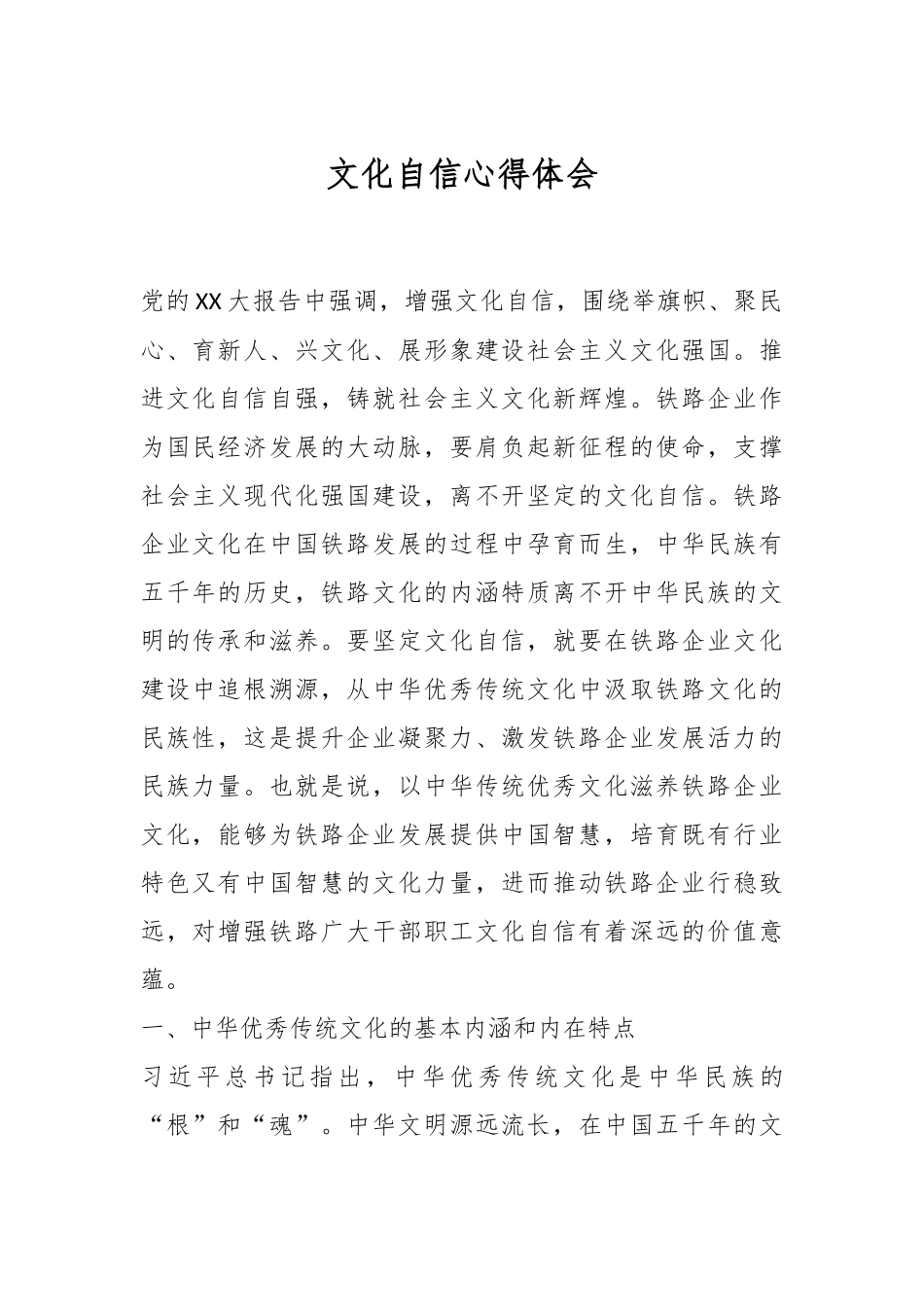 文化自信心得体会党的XX大报告中强调,增强文化自信,围绕举旗帜、聚民心、育新人、兴文化、展形象建设社会主义文化强国。推进文化自信自强,铸就社会主义文化新辉煌。铁路企业作为国民经济发展的大动脉,要肩负起新征程的使命,支撑社会主义现代化强国建设,离不开坚定的文化自信。铁路企业文化在中国铁路发展的过程中孕育而生,中华民族有五千年的历史,铁路文化的内涵特质离不开中华民族的文明的传承和滋养。要坚定文化自信,就要在铁路企业文化建设中追根溯源,从中华优秀传统文化中汲取铁路文化的民族性,这是提升企业凝聚力、激发铁路企业发展活力的民族力量。也就是说,以中华传统优秀文化滋养铁路企业文化,能够为铁路企业发展提供中国智慧,培育既有行业特色又有中国智慧的文化力量,进而推动铁路企业行稳致远,对增强铁路广大干部职工文化自信有着深远的价值意蕴。一、中华优秀传统文化的基本内涵和内在特点习近平总书记指出,中华优秀传统文化是中华民族的“根”和“魂”。中华文明源远流长,在中国五千年的文明历史中,形成了中华民族独具特色的传统文化。在五千年流传的文明过程中,沉淀了许多传统文化的精髓,形成了中华优秀传统文化。这些优秀传统文化的流传使得中华文明得以持续不断的延续,也为整个世界社会进步带来深远的影响。这些优秀传统文化的沉淀,是中华民族一代代发展过程中思想精华和有益经验的提炼总结,是巨大的精神财富,蕴藏的智慧博大精深。中华优秀传统文化基本内涵主要表现在思想理念、中华传统美德和人文精神上。其基本特点表现在四个方面。一是具有历史的传承性。中华民族是世界四大文明古国中文化传承时间最长、且从未中断的民族,这种延续性使其文化的核心内容得到了持续不断的传承。二是具有多元的民族性。中华民族历经沧桑和磨难,其文化实现了多民族多地域的融合,文化很多元,但得到了和谐的融合,表现出统一的特点,形成了独特的民族特点。三是具有强大的生命力。中华优秀传统文化历史悠久,自尧舜禹时期至今,五千年经久不衰、绵延不绝,具有生机勃勃的生命力。四是具有包容性。中华优秀传统文化得以延续,离不开其求同存异的包容性,使中华优秀传统文化博采众长、博大精深。二、铁路文化特质与中华优秀传统文化的精髓高度契合在铁路企业长期发展的历程中,其企业文化的价值精髓集中表现在安全第一、爱国奉献、人民铁路为人民、敢于创新和艰苦奋斗等方面,这些文化价值与中华优秀传统文化中的忧患意识、“天下兴亡、匹夫有责”的爱国情怀、“民为邦本”的人本观、“革故鼎新”的创新观、“自强不息”的奋斗观等有高度的契合性。(一)铁路“安全第一”的文化特质体现着中华民族“居安思危”的忧患意识铁路企业是国民经济的大动脉,长期以来,铁路企业始终把安全作为铁路发展长治久安的根基和命脉,以高度负责的安全意识确保铁路实现安全发展。比如“安全优质、兴路强国”的铁路精神,作为运输行业,安全是铁路发展永恒的主题,是对国家使命、人民生命财产安全的高度珍视在这个过程中形成了铁路鲜明的安全文化特质,干部职工“预防为主、防治结合”的安全理念、安全风险管理等都是安全文化的具体表现,为铁路安全运输提供了文化的凝聚力量。这种对安全的高度重视背后有着中华民族深厚的文化底蕴,突出表现为中华民族居安思危的忧患意识。居安思危是中华民族几千年文化忧患意识的具体体现,提醒人们要始终保持如履薄冰、如临深渊的的警惕感,代表着中华民族生存和发展的大智慧,在中华优秀传统文化中都有深刻的印记。范仲淹写出千古绝唱:“先天下之忧而忧后天下之乐而乐。”孟子认为,无论个人还是国家,都要有忧患意识。他的至理名言“生于忧患而死于安乐”,几千年来始终闪着安全理念的光辉。这些忧患意识延续在一代代中国人的血脉中。铁路安全文化的突出特点“安全大如天、责任重于山”,与中华民族居安思危的忧患意识高度契合,是中华优秀传统文化的传承和发展,激励着一代代铁路人始终保持防微杜渐的警觉,为铁路安全文化融人了民族基因。(二)铁路“爱国奉献”的文化特质体现着中华民族“天下兴亡,匹夫有责”的爱国情怀爱国奉献...
