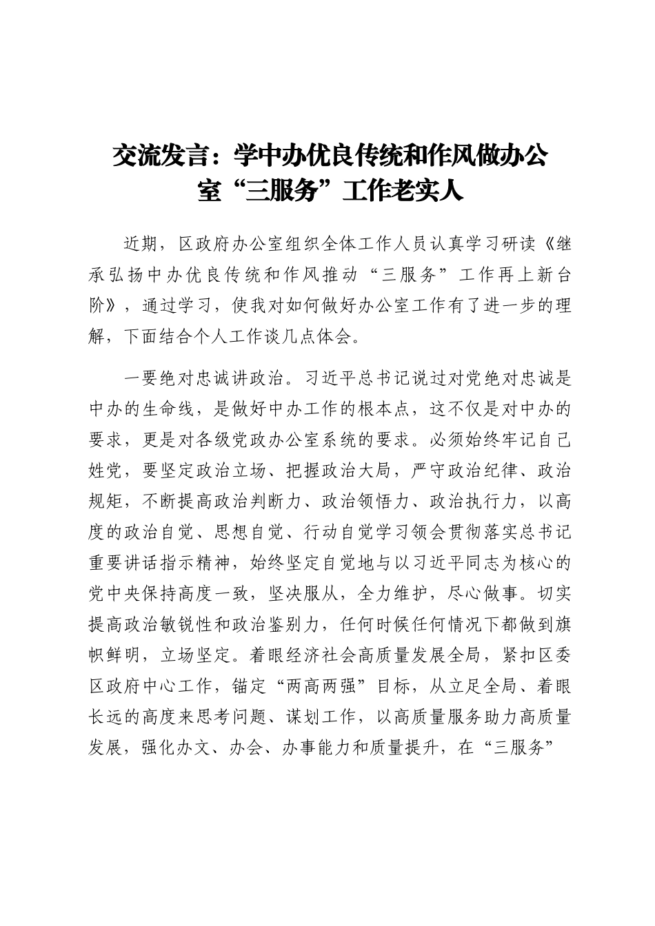 交流发言:学中办优良传统和作风做办公室“三服务”工作老实人近期,区政府办公室组织全体工作人员认真学习研读《继承弘扬中办优良传统和作风推动“三服务”工作再上新台阶》,通过学习,使我对如何做好办公室工作有了进一步的理解,下面结合个人工作谈几点体会。一要绝对忠诚讲政治。习近平总书记说过对党绝对忠诚是中办的生命线,是做好中办工作的根本点,这不仅是对中办的要求,更是对各级党政办公室系统的要求。必须始终牢记自己姓党,要坚定政治立场、把握政治大局,严守政治纪律、政治规矩,不断提高政治判断力、政治领悟力、政治执行力,以高度的政治自觉、思想自觉、行动自觉学习领会贯彻落实总书记重要讲话指示精神,始终坚定自觉地与以习近平同志为核心的党中央保持高度一致,坚决服从,全力维护,尽心做事。切实提高政治敏锐性和政治鉴别力,任何时候任何情况下都做到旗帜鲜明,立场坚定。着眼经济社会高质量发展全局,紧扣区委区政府中心工作,锚定“两高两强”目标,从立足全局、着眼长远的高度来思考问题、谋划工作,以高质量服务助力高质量发展,强化办文、办会、办事能力和质量提升,在“三服务”中展现时代担当,助力“四区”建设,全力争创全国老工业区搬迁改造示范区。二要辅政建言讲大局。办公室工作必须紧紧围绕大局、时时聚焦大局、处处服务大局,找准位置,发挥作用。要充分发挥“第一参谋助手”作用,做“千里眼、顺风耳”,把各方面新情况新问题、贯彻落实区委区政府决策部署的意见和建议、干部群众关注的热点焦点问题等及时收集上来,归纳综合,分析研判,第一时间报送区政府,为区政府科学决策提供信息基础。要“身在兵位,胸为帅谋”,主动对区政府全局工作、抓的重点工作进行深入研究,始终坚持目标导向、问题导向和结果导向,针对人民群众和广大市场主体关心关注热点难点和堵点,围绕全区高质量发展大局,出谋划策、贡献智慧。三要敢于担当讲奉献。我们党是敢于担当的政党,始终把民族、人民的责任扛在肩上,放在心里。对于我们而言,就是将XX区四十多万人民的美好生活福祉扛在肩上。担当就是在急难险重、攻坚克难的任务面前冲锋在前,对组织安排的任务不推诿、不退让、不抱怨、不讲条件。去年,受台风“烟花”影响三角线片区积水最深处将近一米,区委区政府领导冒雨连夜现场指挥,工作人员在积水中连续作战到次日凌晨终于将积水排毕。这次事件深深感染了参加工作不久的我,使我对为人民服务有了更深的体会,这也促使我在后面几次疫情处置期间展现出一名政府办工作人员应有的担当,哪里有需要就去哪里,无论是防指办日常工作还是隔离转运、外防输入,都毫不犹豫连续作战不折不扣完成组织安排的任务。对于我们大多数普通党员来说,担当不一定都体现在急难险重任务中,更多的是体现在我们日常工作中,我们的岗位普通平凡没有轰轰烈烈的惊天伟业,办公室很多同志都在这样的岗位上兢兢业业、恪尽职守,经常是早来晚归没有假期,我们要学习他们这种无私奉献的精神,向他们看齐,从一件一件的具体工作做起,把自己岗位上的、手中的事情做到最好。四要极端负责讲落实。一是要发扬“钉钉子”精神抓落实,习近平总书记说过“一分部署,九分落实”。任何工作,如果只有决策没有落实,都只是一句口号,必须重视抓落实。对于领导的各项会议要求、文件批示和调研指示,要记得清、传的准、督得紧、落得实,尤其要在重点事项、重点环节、重点单位上下功夫、压茬落实,从而起到小中见大、见微知著、推动全局工作的作用,养成踏石留印、抓铁有痕的优良作风。二是要培养严谨细致的工作习惯,坚持高标准、严要求、作表率的工作作风。无论办文办会办事,都要一丝不苟、严谨细致、精益求精,于细微之处见精神,在细节之间显水平。切实做到“文经我手无差错、事交我办请放心”,自觉杜绝“差不多”,用忙而有序追求最完美。五要实事求是讲原则。作为政府办工作人员必须坚持实事求是的思想路线,讲老实话、办老实事、做老实人。讲老实话就是要对上跟领导汇报坦坦荡荡、说真话、报实情,不能遮掩、搭花架子、做表面文章,甚至说假话、报假情;对下调研要听真话、察实情,不空...