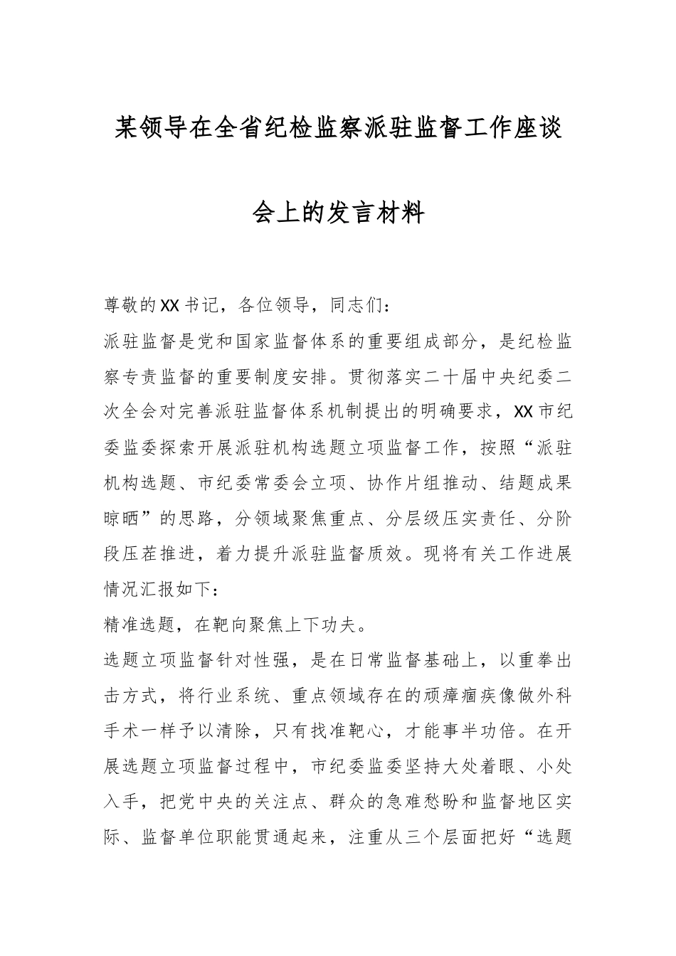 某领导在全省纪检监察派驻监督工作座谈会上的发言材料尊敬的XX书记,各位领导,同志们:派驻监督是党和国家监督体系的重要组成部分,是纪检监察专责监督的重要制度安排。贯彻落实二十届中央纪委二次全会对完善派驻监督体系机制提出的明确要求,XX市纪委监委探索开展派驻机构选题立项监督工作,按照“派驻机构选题、市纪委常委会立项、协作片组推动、结题成果晾晒”的思路,分领域聚焦重点、分层级压实责任、分阶段压茬推进,着力提升派驻监督质效。现将有关工作进展情况汇报如下:精准选题,在靶向聚焦上下功夫。选题立项监督针对性强,是在日常监督基础上,以重拳出击方式,将行业系统、重点领域存在的顽瘴痼疾像做外科手术一样予以清除,只有找准靶心,才能事半功倍。在开展选题立项监督过程中,市纪委监委坚持大处着眼、小处入手,把党中央的关注点、群众的急难愁盼和监督地区实际、监督单位职能贯通起来,注重从三个层面把好“选题关”:首先是派驻机构报题,各派驻机构紧紧围绕中央纪委和省、市纪委全会部署的监督重点,在认真梳理分析日常监督发现问题和深入调研的基础上,找准被监督单位具有行业性、系统性的易发高发风险点,报送监督选题;其次是工作片组审题,联系片组结合近年来违纪违法问题的突出表现、典型案例及“点题整治”收集的群众意见建议等情况进行调研,审核派驻机构报送的监督选题并提出修改完善意见;最后是市纪委常委会定题,经片组审核后的选题提交市纪委常委会会议研究,确定监督选题进行立项,印发实施方案,作出部署安排。今年以来,共选定乡村振兴项目资金监管、工程领域招投标监管、粮食购销领域制度建设、文化产业发展专项资金管理使用等多个选题开展立项监督,变被动监督为主动监督,变“大水漫灌”为“精准滴灌”,持续提升派驻监督质效。用足力量,在深入推动上做文章。选题立项监督往往涉及一个或多个领域,横向看涉及条块多、责任主体多,纵向看条线长、层级多,涉及对象群体数量庞大,必须用足力量,高站位谋划、高标准推进。在开展选题立项监督过程中,选题、破题、结题的每一个阶段,都要下重力、做真功。例如,在选题阶段,把某个单位或系统存在的专项问题提级到市纪委常委会研究立项;在破题阶段,善于运用日常监督成果,始终坚持问题导向在监督检查前做足功课,既要带着问题下去,也要带着问题上来,一方面构建派驻机构具体负责、联系监督检查室督促推进、党风政风监督室综合评价的监督体系,另一方面由工作片组定期组织召开工作调度会,及时了解情况、掌握进度,帮助解决推进中的困难问题,充分发挥专项监督的系统性优势,推动各类监督贯通协调、形成合力;在结题阶段,要求每个选题均形成专题报告提交市纪委常委会研究审议,综合研判在工作部署、举措做法、推进落实等方面的情况和取得的实际成效,按照成效“较好”“一般”“较差”三个等次评估立项监督实施情况,以可检测、可评判、可感知的成果体现监督成效。标本兼治,在系统治理上求实效。选题立项监督既注重发现、整治问题,更注重分析、解决问题,要达到标本兼治的目的,必须把阶段性整治与常态化治理统一起来,既加大力度破除顽瘴痼疾,又推动深化改革、完善机制,做到完成一个选题,解决一个或一批突出问题,出台一套管用制度,不断推动重点领域系统治理在开展选题立项监督过程中,既注重充分发挥派驻监督近距离、全天候的优势,根据不同监督选题探索开展“蹲点式”“嵌入式”等监督,又注重发挥好所联系监督检查室作用,通过开展会诊把关、联动核查等方式提升监督合力实现多方联动、协同推进,形成精准发现问题、有效纠正问题、全方位整改问题的监督闭环。对立项监督发现的问题,及时列出整改问题清单、责任清单、任务清单,并按照即知即改、限期整改、移送交办三类,精准做好分类处置,逐一对账销号,实现立项一事、规范一域,着力从根本上铲除腐败滋生的土壤。汇报完毕,不当之处,请各位领导批评指正,谢谢。