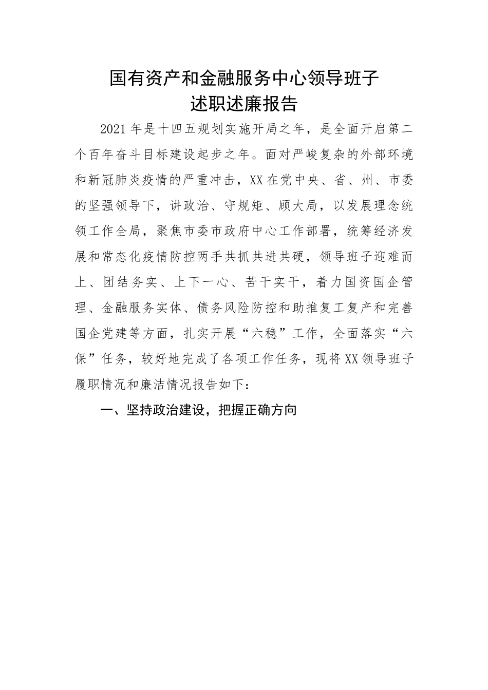 国有资产和金融服务中心领导班子述职述廉报告2021年是十四五规划实施开局之年,是全面开启第二个百年奋斗目标建设起步之年。面对严峻复杂的外部环境和新冠肺炎疫情的严重冲击,XX在党中央、省、州、市委的坚强领导下,讲政治、守规矩、顾大局,以发展理念统领工作全局,聚焦市委市政府中心工作部署,统筹经济发展和常态化疫情防控两手共抓共进共硬,领导班子迎难而上、团结务实、上下一心、苦干实干,着力国资国企管理、金融服务实体、债务风险防控和助推复工复产和完善国企党建等方面,扎实开展“六稳”工作,全面落实“六保”任务,较好地完成了各项工作任务,现将XX领导班子履职情况和廉洁情况报告如下:一、坚持政治建设,把握正确方向(一)聚焦理论学习,推动夯实思想武器入脑入心。牢固树立“终身学习”、“全员学习”理念,在学习的系统过程和浓度上下功夫,利用学习成效指导实践、推动工作上出成果,制定印发了《中共XX党组2021年度理论学习中心组学习计划》《中共XX党组关于印发关于深入学习贯彻党内条例依法依规从严治管党治党学习计划》,严格按照党内法规开展各类学习活动,利用党员大会、党组会、党组中心组理论学习会、支委会等多元化形式深入学习习近平新时代中国特色社会主义思想、习近平总书记系列重要讲话精神,读原著、悟原理,把学习作为中心高质量完成各项任务的前提。2021年开展中心组学习XX次,开展党史学习集中学习会XX次,对党内法规XX项重点学习条例已学习完毕,并积极开展了XX次党内法规知识测试。(二)强化阵地建设,认真落实意识形态工作责任。一是强化绝对领导,健全责任机制。严格落实《党委(党组)意识形态工作责任制实施办法》及时成立意识形态工作领导小组,全年共召开意识形态工作专题会4次统筹谋划,研究部署中心意识形态工作。二是排查风险隐患,严把风险关口。认真落实意识形态年度工作计划安排,组织召开意识形态工作情况总结和存在问题排查分析会,并提出改进措施和意见。坚持每季度开展意识形态风险分析研判,根据排查问题提出处置措施。切实做好网络舆情和网络安全工作,密切关注线上线下舆情,发现情况第一时间报告,促进形成良好的用网习惯。2021年联合XX处置金融领域网络负面舆情XX起,全年金融系统、国资国企领域无发生重大网络舆情。三是严格落实保密工作责任,督促全中心干部职工树牢“涉密不上网,上网不涉密”保密意识,一一与干部职工签订保密责任书,做到常提醒常检查,及时更新和维护计算机、打印机等办公室设备,对涉密文件及时做好流转登记并控制知悉范围,做到思想认识到位、保密措施防护到位、宣传教育到位。(三)狠抓法治建设,坚定树立依法行政法治意识。一是加大法治宣传工作力度,中心领导带头学习《民法典》《习近平法治思想》以及保密、廉政、防止职务犯罪、金融经济方面的法律、法规和有关政策制度,并采取学习强国、法宣在线等线上学习和党组会、理论学习中心组集中学习相结合的方式组织中心干部职工学法,形成人人学法、守法、懂法、用法的良好氛围。二是规范中心行政规范性文件起草、审批、出台流程,规避行政规范性文件中可能出现的法律风险,根据《XX》(XX)文件规定,聘请专职法律顾问,为规范性文件合法性审查提供人员保障。三是建立中心普法责任清单,压实法治建设责任,结合中心工作实际,开展防范非法集资宣传教育活动XX次,进—步加大了防范非法集资宣传的力度,切实提高了社会公众风险意识及法律意识,维护了社会的和谐稳定。二、聚焦发展重点,着力攻坚克难(一)盯指标,全力助推全市经济发展规模。一是围绕全市金融机构存贷款发展规模强增量。截至2021年12月31日,我市金融机构存款余额为XX亿元,比上年同期增加XX亿元,增幅为XX%;全市金融机构贷款余额为XX亿元,比上年同期增加XX亿元,增幅为XX%;存贷款余额增速为XX%。二是围绕全市财源建设总量提升强贡献。按照市委市政府关于加大财源建设、提高财税收入工作决策,XX积极履职,强化调度,全力指导督促市属国有企业和金融系统围绕既定目标推进财源建设工作,截至12月末,我市国有企业上缴税收XX万元,全市金融系统缴纳税收XX亿元。三...