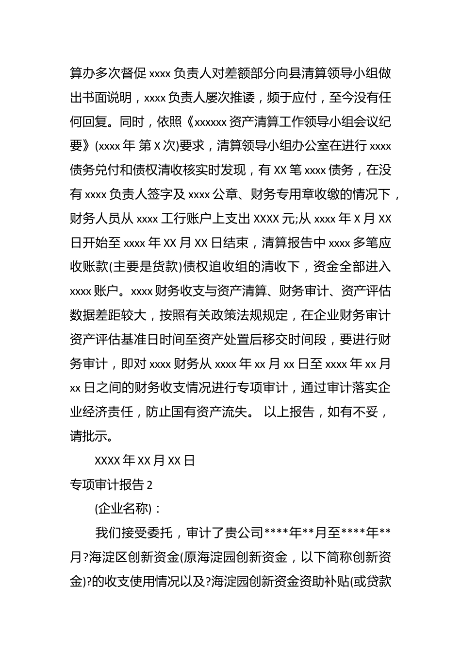 专项审计报告(3篇)报告1xxxx:xxxxx成立于xxxx年XX月XX日,负责人:XXX,经营范围:XXX、XXX、XXX,XXX。不具有法人独立资格。从XXXX年XX月XX日开始,清算领导小组出于对xxxx职工稳定原因,xxxx在清产核资时,xxxx生产一直未停止,为考虑xxxx财务稳定之计,XXXX年XX月XX日xxxx清算工作领导小组向xxxx发出《通知》,《通知》要求“xxxx及其xxxx不再产生新的债权债务,违者后果由责任人自负。”,截至xxxx年xx月xx日清产核资基准日,xxxx银行存款账面值xxxx元,库存现金账面值XXX元,合计XXXX元。依照《xxxxxx资产清算工作领导小组文件》(XXX?xxxx?X号)“......xxxx资金账户中存款,由XXX负责,县法院、县*、县清算办配合,对清算出的企业所有银行存款及现金一并转入县清算办公室专户,同时依法注销该企业账户。”,xxxx年XX月XX日,清算办对xxxx所有银行存款及现金一并转入县清算办公室专户时,发现xxxx工行账户上仅存XX元,与清产核资报告数据XXXXX元相差XXXXX元,清算办多次督促xxxx负责人对差额部分向县清算领导小组做出书面说明,xxxx负责人屡次推诿,频于应付,至今没有任何回复。同时,依照《xxxxxx资产清算工作领导小组会议纪要》(xxxx年第X次)要求,清算领导小组办公室在进行xxxx债务兑付和债权清收核实时发现,有XX笔xxxx债务,在没有xxxx负责人签字及xxxx公章、财务专用章收缴的情况下,财务人员从xxxx工行账户上支出XXXX元;从xxxx年X月XX日开始至xxxx年XX月XX日结束,清算报告中xxxx多笔应收账款(主要是货款)债权追收组的清收下,资金全部进入xxxx账户。xxxx财务收支与资产清算、财务审计、资产评估数据差距较大,按照有关政策法规规定,在企业财务审计资产评估基准日时间至资产处置后移交时间段,要进行财务审计,即对xxxx财务从xxxx年xx月xx日至xxxx年xx月xx日之间的财务收支情况进行专项审计,通过审计落实企业经济责任,防止国有资产流失。以上报告,如有不妥,请批示。XXXX年XX月XX日专项审计报告2(企业名称):我们接受委托,审计了贵公司****年**月至****年**月?海淀区创新资金(原海淀园创新资金,以下简称创新资金)?的收支使用情况以及?海淀园创新资金资助补贴(或贷款贴息)项目合同书?(以下简称合同)中?经济指标?的执行情况。贵公司的责任是提供真实、合法、完整的审计资料,我们的责任是对创新资金的收支使用情况及合同经济指标的执行情况发表审计意见。我们的审计是依据《*注册会计师独立审计准则》与《海淀园创新资金资助补贴(或贷款贴息)项目合同书》进行的。在审计过程中,我们结合贵公司的实际情况,实施了包括抽查会计记录等我们认为必要的审计程序,现将审计情况报告如下:一、企业及项目基本情况**********公司系****年**月**日注册成立的有限责任公司(或有限公司),由****工商行政管理局颁发企业法人营业执照,注册号***********;注册资本:人民币*****万元;法定代表人:*****;公司住所:***************。公司经营范围:*****公司于****年**月**日取得*******号高新技术企业批准证书,并于****年**月**日通过高新技术企业资格复核。项目基本情况:(简述项目基本情况)二、资金合同有关规定(一)贵公司于****年**月**日申报?****************?项目,并与中关村科技园区海淀园管理委员会于****年**月**日签订了《海淀园创新资金资助补贴(或贷款贴息)项目合同书》,合同书编号:****************,取得创新资金总额为**万元人民币的无偿资助(或贷款贴息),用于?***************?项目的投入。项目执行期为****年**月至****年**月。(二)项目投资总额为***万元,在创新资金合同签订时,已完成投资额**万元,计划新增投资****万元,其中创新资金资助**万元(先行拨付**万元,剩余的***万元将视项目进展及验收情况再予拨付。)。(三)创新资金用途规定:创新资金必须用于购臵生产用配套仪器设备、新产品的开发及研制等。(如合同中有规定,按照合同中规定条款写)(四)项目执行阶段的经济指标:合同规定,在合同执行期内:应实现累计销售收入****万元累计交税总额****万元累计净利润****万元三、创新资金合同中各项经济指标的'执行情况经审计,合同执行情况如下:(一)...