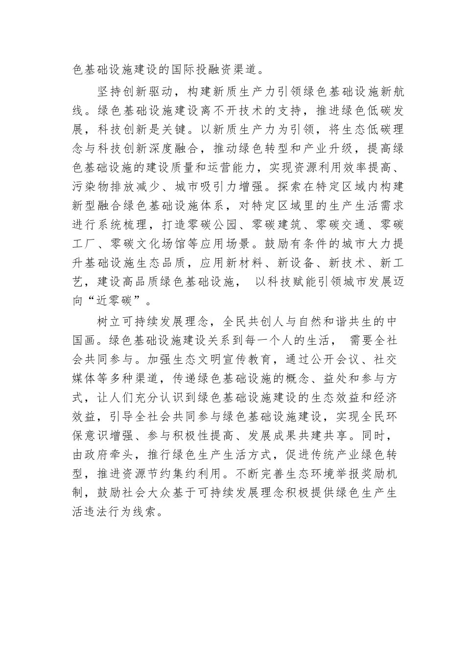 从五个方面着力推动绿色基础设施建设绿色发展是一种以可持续发展为目标、以环境保护为基础、以经济绿色增长为核心的发展模式。它不仅关注经济增长,更重视生态环境的保护和恢复,旨在建立一个可持续、公正、绿色的未来。随着全球气候变化和环境问题日益严重,绿色基础设施建设已经成为世界各国共同关注的焦点。因此,在推进绿色基础设施建设的具体工作时,我们需要从以下五个方面着力。发挥空间规划先导作用,因地制宜画好绿色基础设施规划图。贯彻落实党的二十届三中全会关于深化生态文明体制改革的精神,以中共中央、国务院2024年发布的《关于加快经济社会发展全面绿色转型的意见》为指引,加快建立绿色基础设施空间规划体系。绿色基础设施在规划建设中强调多层级性,针对不同的空间规划层级,应充分考虑当地的自然条件、资源禀赋和经济发展需求,制定差异化规划内容和建设标准,实现城市空间结构优化、城市生活品质提升、服务能力水平提高。在区域尺度,通过整合国家自然保护区、国家森林公园、文化娱乐走廊等生态资源,开展生态空间布局。在城市尺度,通过统筹大型城市公园、农场和林地、城市慢行网络等生态资源的保护与利用,引导城市建设。在社区尺度,通过建设屋顶花园、街道景观、雨水滞蓄设施等,串联活化社区绿色空间节点。坚守生态保护红线,全面推进生态环境分区管控计划表。生态保护红线也是绿色基础设施建设不可逾越的底线。生态环境分区管控是深化生态保护红线的重要举措,也是绿色基础设施建设的重要保障。生态环境管控注重分区分类差异化协同,通过科学化、精细化和智能化工作手段,划分生态环境管控单元,编制生态环境准入清单,科学开展生态保护与污染防治工作,实现生态功能修复、环境质量改善、城市治理水平提升。鼓励各地探索生态环境分区管控的数字化应用场景,例如搭建生态环境分区管控数据应用平台,绘制生态环境分区管控体系“一张图”,助推生态环境分区管控由“治”到“智”。深化金融供给侧改革,打通绿色金融赋能绿色基础设施快车道。绿色金融是绿色基础设施建设的“血液”。截至2023年末,我国本外币绿色贷款余额达到30.08万亿元,其中基础设施绿色升级产业贷款余额达到13.09万亿元。未来要按照中国人民银行等七部门2024年3月份发布的《关于进一步强化金融支持绿色低碳发展的指导意见》要求,积极推动绿色金融改革。创新绿色基础设施的投融资模式,搭建政银企合作平台,拓宽绿色基础设施项目的资金来源,为绿色基础设施建设提供多元化的融资渠道和金融支持,加快绿色基础设施项目落地实施,实现项目融资成本降低、经营主体活力增强、绿色低碳循环发展。同时,在金融高水平开放的要求下,也要积极争取国际资金,有序推进绿色金融市场双向开放,打造多层次的产融平台,发挥金融杠杆作用,畅通绿色基础设施建设的国际投融资渠道。坚持创新驱动,构建新质生产力引领绿色基础设施新航线。绿色基础设施建设离不开技术的支持,推进绿色低碳发展,科技创新是关键。以新质生产力为引领,将生态低碳理念与科技创新深度融合,推动绿色转型和产业升级,提高绿色基础设施的建设质量和运营能力,实现资源利用效率提高、污染物排放减少、城市吸引力增强。探索在特定区域内构建新型融合绿色基础设施体系,对特定区域里的生产生活需求进行系统梳理,打造零碳公园、零碳建筑、零碳交通、零碳工厂、零碳文化场馆等应用场景。鼓励有条件的城市大力提升基础设施生态品质,应用新材料、新设备、新技术、新工艺,建设高品质绿色基础设施,以科技赋能引领城市发展迈向“近零碳”。树立可持续发展理念,全民共创人与自然和谐共生的中国画。绿色基础设施建设关系到每一个人的生活,需要全社会共同参与。加强生态文明宣传教育,通过公开会议、社交媒体等多种渠道,传递绿色基础设施的概念、益处和参与方式,让人们充分认识到绿色基础设施建设的生态效益和经济效益,引导全社会共同参与绿色基础设施建设,实现全民环保意识增强、参与积极性提高、发展成果共建共享。同时,由政府牵头,推行绿色生产生活方式,促进传统产业绿色转型,推进资源节约集约利用。不断完善生态环境举报...