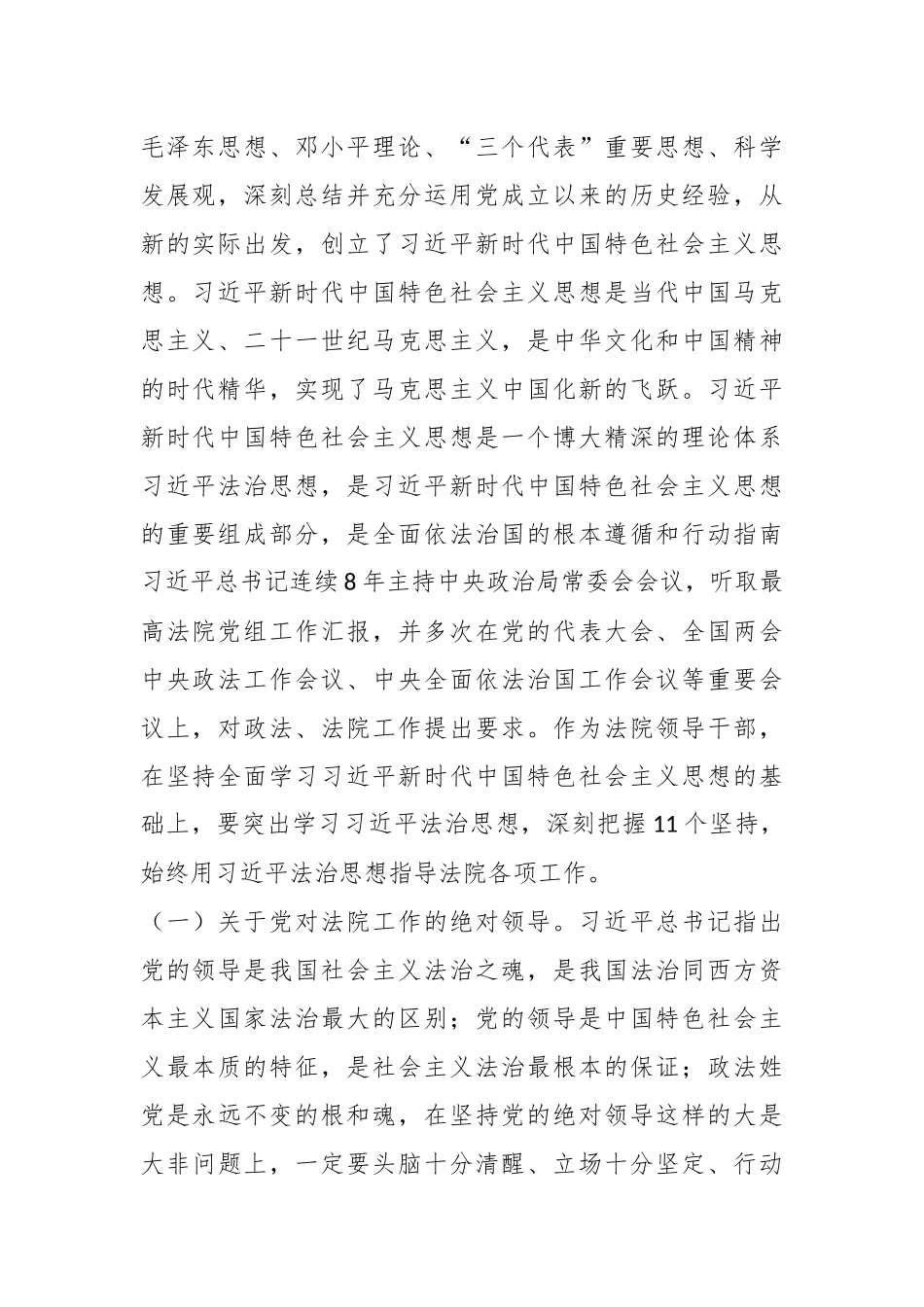 XX法院院长在全市政法系统专题研讨班上的辅导报告同志们:根据市委政法委统一部署,今天,我们集中一天的时间,参加全市政法系统学习贯彻习近平新时代中国特色社会主义思想锻造忠诚干净担当的政法铁军专题研讨班,主要任务是:进一步深入学习贯彻习近平新时代中国特色社会主义思想,深入学习贯彻习近平法治思想,全面贯彻落实党的XX大精神,认真落实全国、全省政法领导干部专题研讨班精神,锻造忠诚干净担当的政法铁军,以实际行动和扎实成效让党放心、让人民满意。上午,X作了辅导报告,我们要认真学习领会,抓好贯彻落实。按照专题研讨班方案要求,我讲几点意见。一、学习贯彻习近平新时代中国特色社会主义思想,关键在于深学细悟习近平法治思想和习近平总书记关于法院工作的重要论述马克思主义是我们立党立国、兴党强国的根本指导思想,其理论不是教条而是行动指南,必须随着实践发展而发展必须中国化才能落地生根、本土化才能深入人心。以习近平同志为主要代表的中国共产党人,坚持把马克思主义基本原理同中国具体实际相结合、同中华优秀传统文化相结合,坚持毛泽东思想、邓小平理论、“三个代表”重要思想、科学发展观,深刻总结并充分运用党成立以来的历史经验,从新的实际出发,创立了习近平新时代中国特色社会主义思想。习近平新时代中国特色社会主义思想是当代中国马克思主义、二十一世纪马克思主义,是中华文化和中国精神的时代精华,实现了马克思主义中国化新的飞跃。习近平新时代中国特色社会主义思想是一个博大精深的理论体系习近平法治思想,是习近平新时代中国特色社会主义思想的重要组成部分,是全面依法治国的根本遵循和行动指南习近平总书记连续8年主持中央政治局常委会会议,听取最高法院党组工作汇报,并多次在党的代表大会、全国两会中央政法工作会议、中央全面依法治国工作会议等重要会议上,对政法、法院工作提出要求。作为法院领导干部,在坚持全面学习习近平新时代中国特色社会主义思想的基础上,要突出学习习近平法治思想,深刻把握11个坚持,始终用习近平法治思想指导法院各项工作。(一)关于党对法院工作的绝对领导。习近平总书记指出党的领导是我国社会主义法治之魂,是我国法治同西方资本主义国家法治最大的区别;党的领导是中国特色社会主义最本质的特征,是社会主义法治最根本的保证;政法姓党是永远不变的根和魂,在坚持党的绝对领导这样的大是大非问题上,一定要头脑十分清醒、立场十分坚定、行动十分坚决。(二)关于为大局服务。习近平总书记指出,无论形势如何变化,政法机关维护党和国家工作大局的使命任务不能变;必须把政法工作放到党和国家工作大局中谋划,服务经济社会高质量发展,服务国家政治安全,服务反腐败斗争,服务对外斗争,为维护好党和国家工作大局提供法治保障;法治是最好的营商环境;要把平等保护贯彻到立法执法、司法、守法等各个环节,依法平等保护各类市场主体产权和合法权益。(三)关于为人民司法。习近平总书记指出,要努力让人民群众在每一个司法案件中都感受到公平正义,所有司法机关都要紧紧围绕这个目标来改进工作,重点解决影响司法公正和制约司法能力的深层次问题;司法工作者要密切联系群众,如果不懂群众语言、不了解群众疾苦、不熟知群众诉求,就难以掌握正确的工作方法,难以发挥应有的作用;坚持司法为民,改进司法工作作风,通过热情服务切实解决好老百姓打官司难问题。(四)关于严格公正司法。习近平总书记指出,公正司法是维护社会公平正义的最后一道防线;公平正义是执法司法的灵魂和生命,所谓公正司法,就是受到侵害的权利一定会得到保护和救济,违法犯罪活动一定要受到制裁和惩罚;要懂得“100-1=0”的道理,一个错案的负面影响足以摧毁九十九个公正裁判积累起来的良好形象,执法司法中万分之一的失误,对当事人就是百分之百的伤害;政法战线要肩扛公正天平、手持正义之剑,以实际行动维护社会公平正义让人民群众切实感受到公平正义就在身边。(五)关于司法改革。习近平总书记指出,要紧紧牵住司法责任制这个牛鼻子,凡是进入法官、检察官员额的,要在司法一线办案,对案件质量终身负责;法...