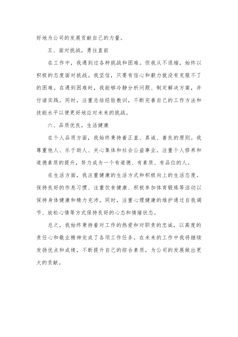 笃行职责,追求卓越——个人现实表现材料自踏入职场以来,我始终秉持着对工作的深深热爱和对职责的无限忠诚,在平凡的办公室岗位上,我用实际行动书写着不平凡的业绩篇章。以下是我的个人现实表现材料:一、政治坚定,道德高尚在政治素质方面,我深知作为一名党员,必须始终保持对党的忠诚和信仰。我深入学习党的理论和路线方针政策,不断提高自己的政治理论水平和政治素养。我坚信社会主义核心价值观,自觉抵制各种错误思想的侵蚀,始终与党中央保持高度一致。在职业道德方面,我恪守公司规章制度,秉持公正、公平、诚信的原则。无论面对何种情况,我都坚守自己的职业道德底线,以高度的责任心和敬业精神对待每一项工作。我深知,只有做到公正无私,才能赢得同事和领导的信任与尊重。二、勤奋敬业,业绩突出在工作态度上,我始终保持着高度的责任心和敬业精神。我明白,每一份工作都承载着公司的期望和信任。因此,无论是日常的文档处理、会议筹备还是紧急任务的执行,我都能够脚踏实地、兢兢业业地完成。我注重细节,深知“细节决定成败”,因此在处理工作的每一个环节都力求完美,确保工作质量和效率。在业绩方面,我通过不断学习和实践,提高了自己的业务能力和工作效率。积极参与公司的各类项目,为公司的发展贡献了自己的力量。我的工作成果得到了领导和同事们的一致认可,多次获得表彰和奖励。这些荣誉的背后,是我对工作的热爱和对职责的坚守。三、团队协作,沟通顺畅一个人的力量是有限的,只有团队协作才能发挥最大的效能。因此,我始终注重与同事们的沟通和协作。我尊重每一个同事的意见和建议,与他们相互支持、相互尊重,共同推动工作的进展。在沟通方面,我注重倾听他人的意见,善于从多个角度思考问题,通过有效沟通协调各方资源,确保工作的顺利进行。在团队协作中,我充分发挥自己的优势,为团队贡献自己的力量。我善于倾听他人的意见和建议,积极与团队成员进行交流和沟通。在遇到困难时,我能够主动承担责任,积极寻求解决方案,与团队成员共同面对挑战。我的团队协作精神和沟通能力也得到了领导和同事们的认可和赞赏。四、持续学习,不断提升只有不断学习才能不断进步。因此,我始终保持着一颗学习的心态,通过阅读专业书籍、参加培训和研讨等方式不断提升自己的专业知识和技能。关注行业动态和技术发展趋势,及时了解最新的知识和技术,以便更好地适应工作的需要。除了专业技能的学习外,我还注重提升自己的综合素质。我学习管理知识、沟通技巧和领导力等方面的知识,以便更好地担任管理工作和领导职务。我相信,只有不断学习才能不断进步,才能更好地为公司的发展贡献自己的力量。五、面对挑战,勇往直前在工作中,我遇到过各种挑战和困难。但我从不退缩,始终以积极的态度面对挑战。我坚信,只要有信心和毅力就没有克服不了的困难。在遇到困难时,我能够冷静分析问题、制定解决方案,并付诸实践。同时,注重总结经验教训,不断完善自己的工作方法和技能水平以便更好地应对未来的挑战。六、品质优良,生活健康在个人品质方面,我始终秉持着正直、真诚、善良的原则。我尊重他人、乐于助人、关心集体和社会公益事业。注重个人修养和道德素质的提升,努力成为一个有道德、有素质、有品位的人。在生活方面,我注重健康的生活方式和积极向上的生活态度。保持良好的作息习惯、注重饮食健康、积极参加体育锻炼等活动以保持身体健康和精力充沛。同时,注重心理健康的维护通过自我调节、放松心情等方式保持良好的心态和情绪状态。总之,我始终秉持着对工作的热爱和对职责的忠诚,以高度的责任心和敬业精神完成了各项工作任务。在未来的工作中我将继续发扬优点和成绩,不断提升自己的综合素质,为公司的发展做出更大的贡献。