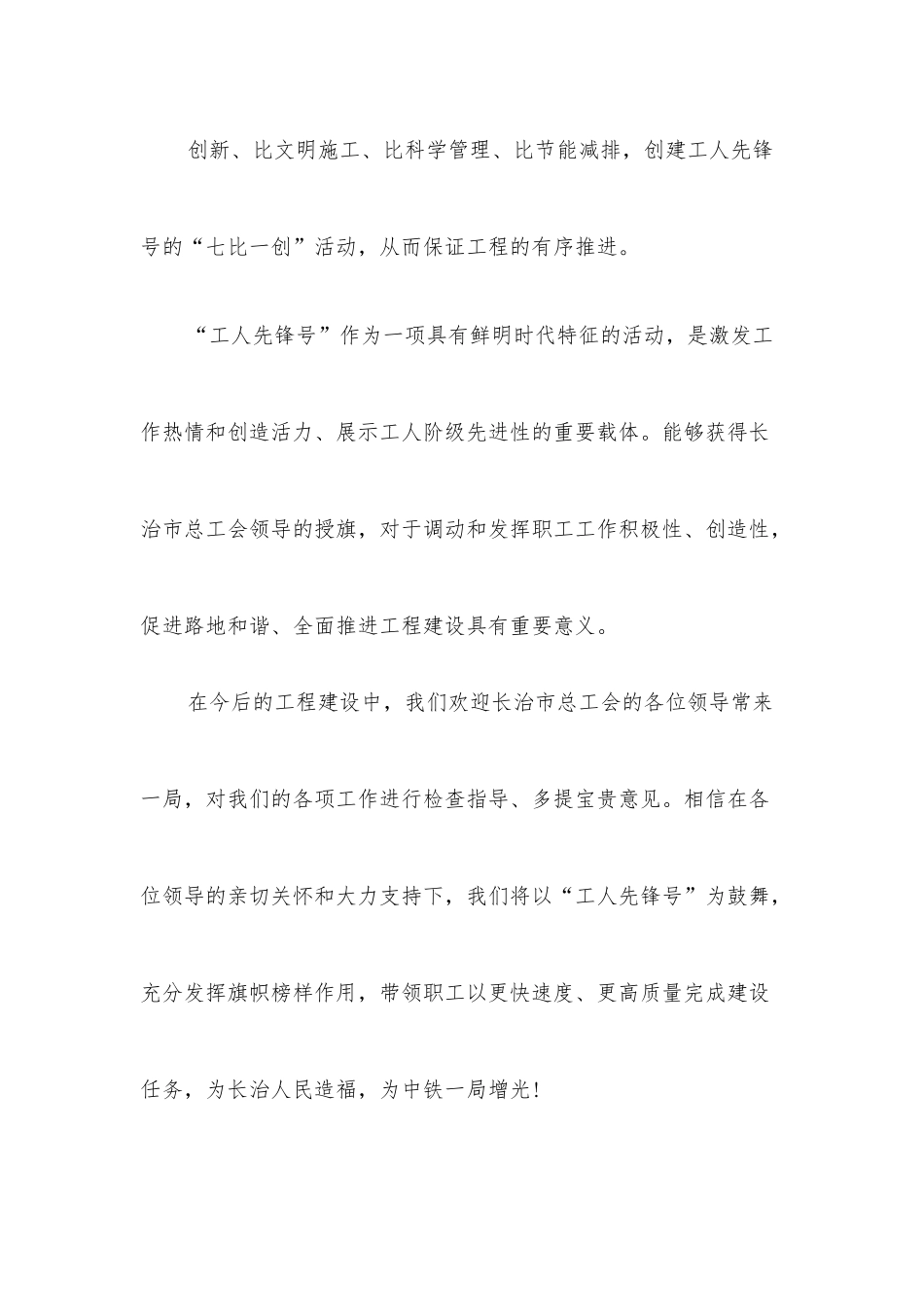 在“工人先锋号”授旗仪式上的讲话稿尊敬的各位领导,各位来宾:大家上午好!今天,我们有幸迎来长治市总工会的领导,为跨长晋高速公路特大桥、发鸠山隧道两个“工人先锋号工程”授旗,在此,我代表中铁一局集团山西中南部铁路通道工程指挥部,对各位领导的到来表示热烈的欢迎和衷心的感谢!山西中南部铁路通道是一条新的“西煤东运”的能源运输大动脉,也是我国东西向路网干线铁路之一,对国民经济发展具有重要的能源安全保障作用。中铁一局作为世界“双500强”企业、世界第二大的建筑企业一一中国中铁股份有限公司的全资子公司,能够与长治人民携手共建这条铁路,我们感到非常荣幸!本次获得工人先锋号授旗的跨长晋高速公路特大桥,以及发鸠山隧道工程,均是山西中南部铁路通道全线重难点控制工程。其中,跨长晋高速公路特大桥设计全长2618.57米,为双线铁路桥梁,共78个墩台。桥梁在40-43号墩台处采用连续梁,跨越宽38m、车流量密集的长晋高速公路,与线路交角135°,技术难度大,安全风险高。发鸠山隧道全长16007米,设斜井4处。隧道洞身穿越砂岩、泥岩互层,隧道出口段岩体破碎。发鸠山隧道作为全线风险隧道之一,对安全、质量和施工工法提出了非常严格的要求。为保证两项重点工程的安全有序推进,我们按照长治市总工会的安排部署,积极开展比工程质量、比工期进度、比安全生产、比科技创新、比文明施工、比科学管理、比节能减排,创建工人先锋号的“七比一创”活动,从而保证工程的有序推进。“工人先锋号”作为一项具有鲜明时代特征的活动,是激发工作热情和创造活力、展示工人阶级先进性的重要载体。能够获得长治市总工会领导的授旗,对于调动和发挥职工工作积极性、创造性,促进路地和谐、全面推进工程建设具有重要意义。在今后的工程建设中,我们欢迎长治市总工会的各位领导常来一局,对我们的各项工作进行检查指导、多提宝贵意见。相信在各位领导的亲切关怀和大力支持下,我们将以“工人先锋号”为鼓舞,充分发挥旗帜榜样作用,带领职工以更快速度、更高质量完成建设任务,为长治人民造福,为中铁一局增光!谢谢大家!