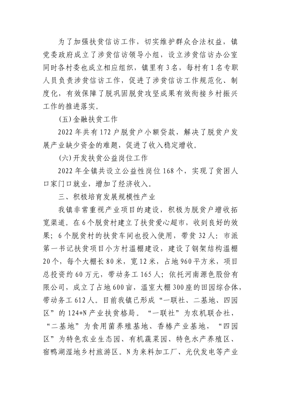 xx镇巩固脱贫攻坚成果有效衔接乡村振兴工作汇报xx镇党委、政府认真贯彻落实中央、省、市、县巩固脱贫攻坚成果有效衔接乡村振兴会议精神,全力以赴巩固拓展脱贫攻坚成果,精准识别三类户人群,细化帮扶措施明确目标任务,突出工作重点,现将近期工作开展汇报如下:一、镇基本情况汝南县xx镇位于宿鸭湖西岸,汝南县城西10公里处,距驻马店市区东20公里,素有“中州名镇”之美誉。全镇共有12个行政村,其中,脱贫村有6个,一般村6个。全镇总人口4.15万人,23个党支部,党员1318名,现有建档立卡脱贫户1050户3188人;三类户人群100户326人。二、主要工作开展情况(一)认真贯彻落实省推进会议精神在每次省、市、县召开推进会议后,镇党委、政府高度重视,迅速行动,学习贯彻会议精神,并对全镇巩固脱贫攻坚成果有效衔接乡村振兴工作进行部署。一是及时传达,抓好落实。认真贯彻落实省、市县巩固脱贫攻坚成果有效衔接乡村振兴工作精神,镇第一时间进行传达,研究贯彻落实意见。二是加强研判,分类施策。组织召开工作调度会,紧盯工作标准,对三类户实施分措施、分类别管理,精准施策,确保三类户实现稳定增收。(二)强化防返贫监测工作我们按照省、市、县要求,通过开展全面普查和周五帮扶日活动,对全镇脱贫户和非贫困户进行入户走访,详细了解走访每个贫困家庭的经济、劳动力等情况。一是建立防返贫监测机制,严格落实脱贫户、低收入户监测机制加强村责任组排查监管力度,建立月报告制度。二是严格按照程序进行认定审核,完善相关会议记录等材料。下步将加大对三类人员的帮扶力度,开展针对性帮扶,切实增加家庭收入,提高脱贫质量,降低返贫风险。(三)开展大排查大走访工作xx镇党委、政府认真落实省、市、县部署要求,每周五依托村级责任组,组织乡村干部、驻村第一书记和帮扶队员、帮扶责任人等力量,严格按照“五个必到”要求入户进行走访核实,认真填写入户排查表,根据上级安排组织开展了大走访等帮扶活动,在帮扶活动中,共走访1.2万户,核对完善档卡1050户,对全镇101个自然村进行了环境整治,对全镇1050户脱贫户开展了“五净一规范”活动,排查化解矛盾10多起,通过帮扶,大大提高了群众满意度。(四)做好扶贫领域信访工作为了加强扶贫信访工作,切实维护群众合法权益,镇党委政府成立了涉贫信访领导小组,设立涉贫信访办公室同时各村委也成立相应组织,镇里有3名,每村有1名专职人员负责涉贫信访工作,促进了涉贫信访工作规范化、制度化,有效保障了脱巩固脱贫攻坚成果有效衔接乡村振兴工作的推进落实。(五)金融扶贫工作2022年共有172户脱贫户小额贷款,解决了脱贫户发展产业缺少资金的难题,促进了收入稳定增收。(六)开发扶贫公益岗位工作2022年全镇共设立公益性岗位168个,实现了贫困人口家门口就业,增加了经济收入。三、积极培育发展规模性产业我镇非常重视产业项目的建设,积极为脱贫户增收拓宽渠道。在6个脱贫村建立了扶贫爱心超市,收到良好的效果;6个脱贫村的扶贫车间也投入使用,带贫32人:市派第一书记扶贫项目小方村温棚建设,建设了钢架结构温棚20个,每个大棚长80米,宽12米,占地960平方米,项目总投资约60万元,带动务工165人;依托河南源色股份有限公司,成立了占地600亩,温室大棚300座的田园综合体,带动务工612人。目前我镇已形成“一联社、二基地、四园区”的124+N产业扶贫格局。“一联社”为农机联合社,“二基地”为食用菌养殖基地、香椿产业基地,“四园区”为特色农业生态园、有机蔬菜园、特色水产养殖区、宿鸭湖湿地乡村旅游区。N为来料加工厂、光伏发电等产业项目。四、继续完善提升基础设施建设,美化群众生产生活环境镇对肖屯村和康店村的基础设施建设进行了完善,两个村共新修水泥路1683米,新建涵管桥2座;投资116.66万元建设了一个重残托养中心,给重残人员提供良好的生产生活环境;对小方、肖屯、杜庄、伍庄四个行政村开展了水土保持项目,对项目区境内的4条排水沟进行清淤,总长度7500米,开挖土方7574立方米,种植树木1708棵,治理水土流失面积50h左右以及二条支沟所涉及的㎡3座坑塘治理,对坑塘周边5米范围内进行植树、种草,涉及总面积2...
