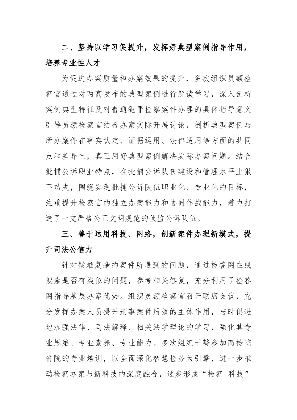 【三抓三促·铸忠诚警魂】检察院:严把案件质量关筑牢检察办案“生命线”办案是检察机关履行法律监督职能的基本方式,案件质量是检察办案的核心,只有牢牢把握住案件质量这道关才能真正实现“让人民群众在每一个司法案件中感受到公平正义”。**县人民检察院在办理案件过程中,始终秉持“强化法律监督,维护公平正义”的检察工作主题,认真贯彻宽严相济等刑事司法政策,依法履行工作职责。近年来,该院办理的案件无捕后不起诉、撤回起诉和被判无罪的情况,案件质量保持良好。一、始终以案件质量为抓手,严把案件审查关一是在刑事案件办理过程中,严把案件事实关、证据关、法律适用关,始终做到谨小慎微、追求细节,重视《继续侦查取证提纲》的作用,加强与公安机关的沟通,严格把握证据的客观真实性、时效性、关联性和合法性,确保诉出的案件能够达到事实清楚,证据确实、充分,同样也确保对于证据达不到起诉标准的的案件,按照相关规定处理,严防带病起诉。二是认真落实以审判中心的诉讼制度改革,强化公诉在行使质控中的主导作用,着力构建以证据为核心的刑事指控体系,通过探索实践提前介入、提出量刑建议、审前召开庭前会议、审查过程中充分听取律师意见等措施,积极构建新型诉侦、诉审、诉辩关系。二、坚持以学习促提升,发挥好典型案例指导作用,培养专业性人才为促进办案质量和办案效果的提升,多次组织员额检察官通过对两高发布的典型案例进行解读学习,深入剖析案例典型特征及对普通犯罪检察案件办理的具体指导意义引导员额检察官结合办案实际开展讨论,剖析典型案例与所办案件在事实认定、证据运用、法律适用等方面的共同点和差异性,真正用好典型案例解决实际办案问题。结合批捕公诉职业特点,在批捕公诉队伍建设和管理水平上狠下功夫,围绕实现批捕公诉队伍职业化、专业化的目标,注重提升检察官的独立办案能力和协同作战能力,着力打造了一支严格公正文明规范的侦监公诉队伍。三、善于运用科技、网络,创新案件办理新模式,提升司法公信力针对疑难复杂的案件所遇到的问题,通过检答网在线搜索是否有类似的问题,参考相关答复,充分利用了检答网指导基层办案优势。组织员额检察官召开联席会议,充分发挥办案人员提升刑事案件质效的主体作用,与时俱进地加强法律、司法解释、相关法学理论的学习,强化其专业思维、专业素养、专业能力。多次组织干警参加高检院省院的专业培训,以全面深化智慧检务为引擎,进一步推动检察办案与新科技的深度融合,逐步形成“检察+科技”的办案工作新模式,有效提升了检察办案质量效率和司法公信力。四、推进案件质量评查常态化,不断提升案件质量根据《省检察机关案件质量评查实施办法(试行)》《省检察机关案件质量评查指引(试行)》,制定了具体的评查细则。案件办结后,定期对案件进行内部集中互相评查,由检察长牵头,组织员额检察官,对于评查中遇到的具体问题,及时进行分析研讨,督促整改,并根据评查结果反馈至案件承办人,确保案件质量的不断提升。