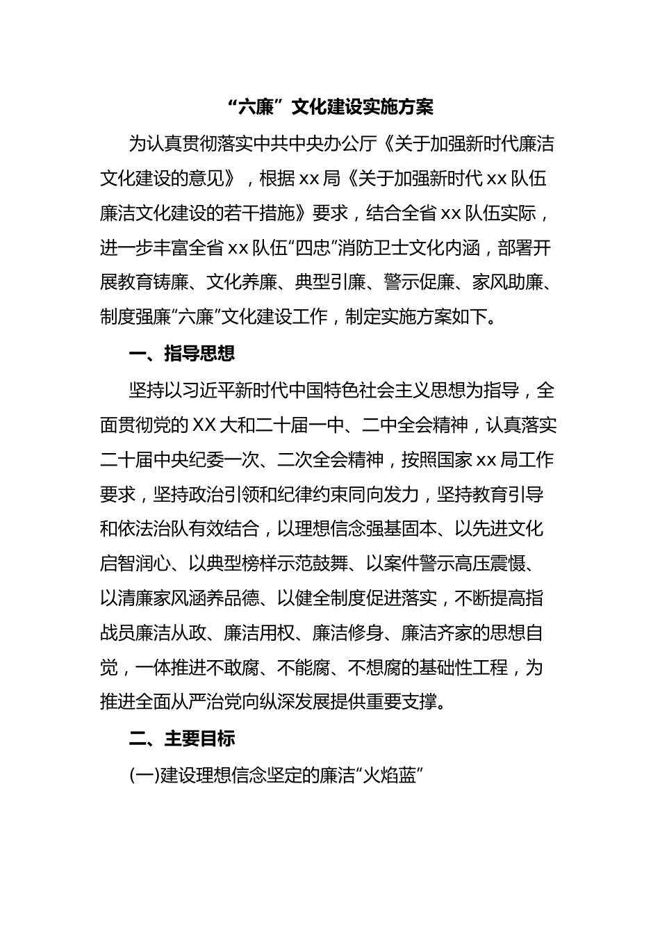 “六廉”文化建设实施方案为认真贯彻落实中共中央办公厅《关于加强新时代廉洁文化建设的意见》,根据xx局《关于加强新时代xx队伍廉洁文化建设的若干措施》要求,结合全省xx队伍实际,进一步丰富全省xx队伍“四忠”消防卫士文化内涵,部署开展教育铸廉、文化养廉、典型引廉、警示促廉、家风助廉、制度强廉“六廉”文化建设工作,制定实施方案如下。一、指导思想坚持以习近平新时代中国特色社会主义思想为指导,全面贯彻党的XX大和二十届一中、二中全会精神,认真落实二十届中央纪委一次、二次全会精神,按照国家xx局工作要求,坚持政治引领和纪律约束同向发力,坚持教育引导和依法治队有效结合,以理想信念强基固本、以先进文化启智润心、以典型榜样示范鼓舞、以案件警示高压震慑、以清廉家风涵养品德、以健全制度促进落实,不断提高指战员廉洁从政、廉洁用权、廉洁修身、廉洁齐家的思想自觉,一体推进不敢腐、不能腐、不想腐的基础性工程,为推进全面从严治党向纵深发展提供重要支撑。二、主要目标(一)建设理想信念坚定的廉洁“火焰蓝”队伍。通过组织深刻领悟习近平总书记关于党风廉政建设、廉洁文化建设的重要论述,坚持不懈用习近平总书记重要训词精神武装头脑,引导广大党员以理论上的坚定保证行动上的坚定、以思想上的清醒保证用权上的清廉,努力建设忠诚、干净、担当的三晋xx队伍。(二)形成具有山西消防特色的廉洁文化成果。通过传承弘扬以伟大建党精神为源头的精神谱系,加强廉洁文化培育和廉洁氛围营造,发掘培育一批具有山西底蕴、兼具职业特点、融入队伍特色的廉洁文化成果,在全队伍汇聚“崇德尚廉、勤廉为本、持廉守正”的廉洁共识。(三)构建勤廉从政先进典型的培树宣传机制。通过深入挖掘队伍内部崇廉尚廉感人事迹,讲述好、宣传好身边廉洁故事,发挥榜样先进的导向作用、凝聚作用、激励作用,让广大指战员学有榜样、行有示范、赶有目标。(四)凝练总结以案明纪的常态“警示”经验。通过完善警示教育制度,建立以案说德、以案说纪、以案说法、以案说责机制,挖掘警示教育资源,用好警示教育基地,强化以案为鉴,放大震慑效应,引导广大指战员知敬畏、存戒惧、守底线。(五)完善“队伍一家庭”廉洁共建共育模式。通过组织和家庭同向发力,教育引导指战员特别是党员领导干部持续注重家庭家教家风,约束社交圈、亲友圈和“八小时”外的行为举止,共同构建队伍清廉“生态闭环”(六)构建多维制度管控体系。通过健全党风廉政制度,与党性锤炼、队伍管控、思想摸排相结合,积极回应人民群众对xx队伍党风廉政建设的新期待新要求,用完善的制度体系建设保障队伍高质量发展。三、组织领导全省xx队伍“六廉”文化建设工作由总队党委统一领导,总队纪委牵头负责。总队机关党委、各支队党委和纪委负责具体落实。四、具体措施(一)教育铸廉。一是学重要论述。将学习贯彻习近平新时代中国特色社会主义思想作为长期的重大政治任务。将习近平总书记关于党风廉政建设、廉洁文化建设的重要论述和重要指示批示纳入总队、支队级党委理论学习中心组和基层党组织“第一议题”内容,列入经常性思想政治教育、指战员自主学习和集中教育培训(轮训)课程,总队、支队每年至少邀请专家学者开展1次专题辅导。坚持不懈用习近平总书记重要训词精神武装头脑、指导实践、推动工作。二是学党史队史。持续抓好党史、新中国史、改革开放史、社会主义发展史学习教育,组织开展“党史咏颂会”等活动。把不忘初心、牢记使命作为加强党的建设的永恒课题和全体党员、干部的终身课题,深入开展党的光荣传统和优良作风教育。抓好xx队伍队史学习教育,定期举办“队史分享会”和“典型榜样廉洁故事会”等学习活动,组织新入职xx人员参观队史馆(荣誉室)。三是学党纪法规。将党章党规党纪学习教育纳入各级党组织落实全面从严治党主体责任内容,纳入理论学习中心组、党支部、党小组学习的重要内容,每年开展纪法教育月、教育周等活动。四是学形势政策。严格落实“三个半小时”制度,运用看新闻、听广播、读书看报等手段,全面了解从严治党重大原则、重大任务和历史成就。创新互动教育方式,用好学习强国、xx网院等学习平台...
