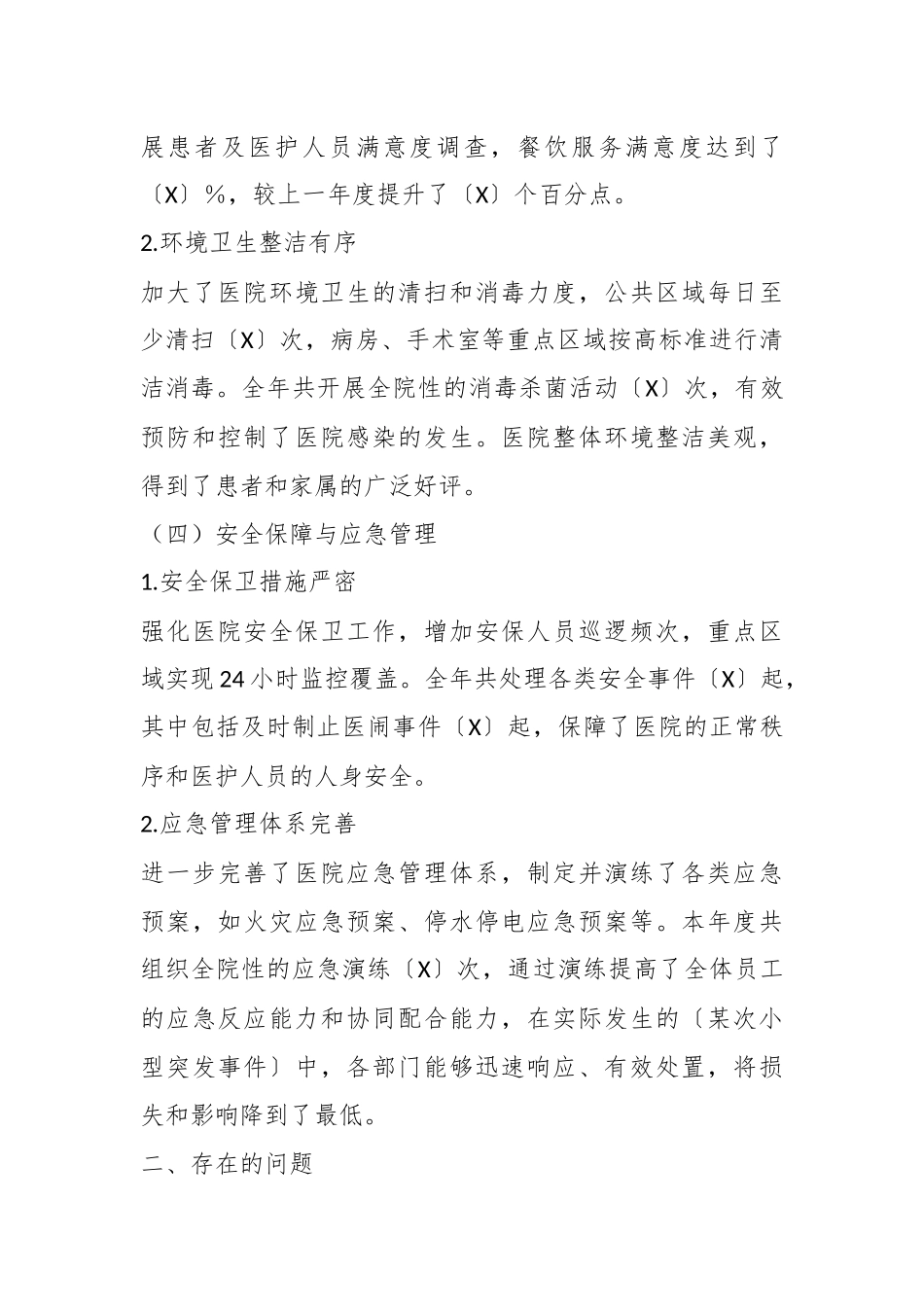 2024年度三级甲等医院后勤保障服务总结2024年,在医院领导的正确引领以及各科室的紧密协作下,我院后勤保障部门秉持着“服务临床、保障医疗、高效优质”的宗旨,全力投入到医院各项后勤保障工作中。通过不断优化管理、提升服务质量,为医院的正常运转和医疗业务的顺利开展提供了坚实有力的支持。现将本年度后勤保障服务工作情况总结如下:一、工作成果与亮点(一)设施设备维护与管理1.定期巡检制度落实到位严格执行设施设备的定期巡检计划,涵盖了医院的各类医疗设备、电梯、空调、水电系统等重要设施。全年累计完成巡检次数超过〔X〕次,通过细致的巡检及时发现并解决了诸如电梯轿厢轻微晃动、空调制冷效果不佳、部分科室水电线路老化等潜在问题共计〔X〕个,有效避免了因设备故障而可能导致的医疗业务中断情况。2.设备维修响应迅速建立了高效的设备维修响应机制,维修团队24小时待命。一旦接到设备故障报修,平均响应时间控制在〔X〕分钟以内,确保能够第一时间赶到现场进行抢修。本年度设备维修及时率达到了〔X〕%,像手术室重要医疗设备突发故障,维修人员在〔具体时长〕内成功修复,保障了手术的正常进行。(二)物资供应与管理1.物资采购精准高效依据各科室的物资需求预测及实际使用情况,科学制定物资采购计划。通过与优质供应商建立长期稳定的合作关系确保了物资的质量可靠且供应及时。全年物资采购准确率达到〔X〕%以上,医用耗材、药品等重要物资从未出现因采购环节问题而导致的短缺现象。2.库存管理优化升级引入先进的库存管理系统,实现了对物资库存的实时动态监控。通过合理设定库存预警值,及时补货和调整库存结构,既避免了库存积压占用资金,又防止了因库存不足而影响医疗工作。本年度库存周转率较上一年度提高了〔X〕%。(三)餐饮与环境卫生服务1.餐饮质量稳步提升加强对医院食堂的管理,从食材采购源头把控质量,严格筛选供应商,确保食材新鲜、安全。定期更新菜单,注重营养搭配,满足不同患者和医护人员的饮食需求。通过开展患者及医护人员满意度调查,餐饮服务满意度达到了〔X〕%,较上一年度提升了〔X〕个百分点。2.环境卫生整洁有序加大了医院环境卫生的清扫和消毒力度,公共区域每日至少清扫〔X〕次,病房、手术室等重点区域按高标准进行清洁消毒。全年共开展全院性的消毒杀菌活动〔X〕次,有效预防和控制了医院感染的发生。医院整体环境整洁美观,得到了患者和家属的广泛好评。(四)安全保障与应急管理1.安全保卫措施严密强化医院安全保卫工作,增加安保人员巡逻频次,重点区域实现24小时监控覆盖。全年共处理各类安全事件〔X〕起,其中包括及时制止医闹事件〔X〕起,保障了医院的正常秩序和医护人员的人身安全。2.应急管理体系完善进一步完善了医院应急管理体系,制定并演练了各类应急预案,如火灾应急预案、停水停电应急预案等。本年度共组织全院性的应急演练〔X〕次,通过演练提高了全体员工的应急反应能力和协同配合能力,在实际发生的〔某次小型突发事件〕中,各部门能够迅速响应、有效处置,将损失和影响降到了最低。二、存在的问题(一)部分设施设备老化尽管在设施设备维护方面做了大量工作,但仍有部分医院建院初期安装的设备,如某些楼层的中央空调主机、部分病房的卫生间设施等,存在老化严重的情况。这些老化设备不仅维修成本较高,而且故障频发,对医院的正常运转带来一定影响。(二)后勤人员专业素质有待提高随着医疗技术的不断发展和医院规模的扩大,对后勤保障人员的专业素质要求也越来越高。目前,部分后勤人员在掌握新技术、新设备的运维知识以及服务理念更新方面存在一定滞后性,例如在一些智能化医疗设备的简单故障排除上不够熟练,影响了服务效率。(三)沟通协调机制有待优化在与临床科室的沟通协作方面,有时存在信息传递不及时不准确的情况。比如在物资需求变更时,科室未能及时告知后勤部门,或者后勤部门在调整物资供应计划后没有充分反馈给科室,导致工作衔接出现漏洞,影响了医疗工作的顺畅开展。三、改进措施(一)设备更新与改造计划制定详细的设施设备更新与改造计划,根据设备的使用年限、故障频率、维修成本等...