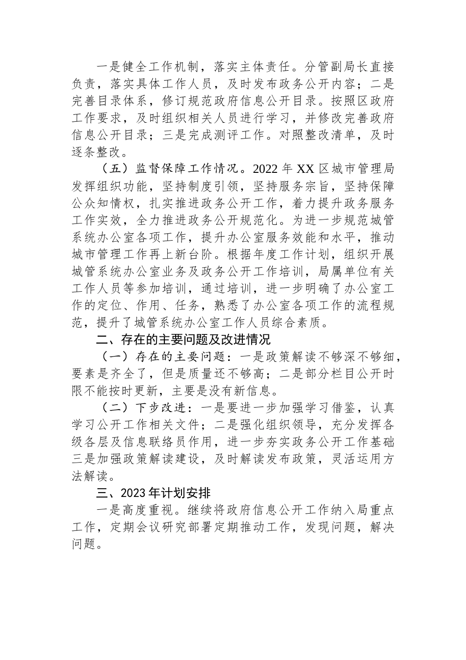 2022年度工作总结和2023年工作计划汇编(9篇)目录1.XX区城市管理局2022年度政府信息公开工作总结和2023年工作计划....................................22.XX区城市管理局2022年工作总结和2023年工作计划................................................53.XX区交通运输局2022年工作总结和2023年工作计划...............................................154.XX区卫生健康局2022年工作总结和2023年工作计划...............................................265.XX县文化旅游体育局2022年工作总结和2023年工作计划...........................................326.XX县重点工程建设管理处2022年度工作总结及2023年工作计划.......................................467.市经开区2022年工作总结和2023年工作计划....618.县司法局2022年工作总结和2023年工作计划....699.县医保局政务公开2022年度工作总结和2023年工作计划.............................................73XX区城市管理局2022年度政府信息公开工作总结和2023年工作计划一、总体情况(一)主动公开情况2022年,我局对本年度公开的政府信息进行了认真的梳理和编目,截至12月31日,新增主动公开政府信息335条,累计主动公开政府信息达5013条。其中包括:政策法规12条,重大决策预公开5条,规划计划5条,决策部署落实情况22条,建议提案办理5条,机构领导3条,机构设置7条,人事信息8条,财政资金22条,应急管理5条精准脱贫0条,权责清单和动态调整情况2条,公共服务清单和中介服务清单2条,行政权力运行135条,“双随机”一公开2条,招标采购2条,重点领域信息公开10条,新闻发布2条,政策解读9条,回应关切4条,监督保障21条。(二)依申请公开情况我局高度重视依申请公开工作,2021年我局共接到依申请公开办件1件,办结1件。(三)政府信息管理。2022年,局党委将政务公开工作纳入局重点工作,定期召开会议,定期调度。根据工作需要,召开专题会议,更加具体的明确了公开工作原则、目的、公开内容和审核程序等方面,将政务公开作为推进法治政府建设的重要抓手,对政务公开各项任务进行了分解,明确了牵头领导、责任处室,责任人,确保政务公开工作落到实处。(四)政府信息公开平台建设。一是健全工作机制,落实主体责任。分管副局长直接负责,落实具体工作人员,及时发布政务公开内容;二是完善目录体系,修订规范政府信息公开目录。按照区政府工作要求,及时组织相关人员进行学习,并修改完善政府信息公开目录;三是完成测评工作。对照整改清单,及时逐条整改。(五)监督保障工作情况。2022年XX区城市管理局发挥组织功能,坚持制度引领,坚持服务宗旨,坚持保障公众知情权,扎实推进政务公开工作,着力提升政务服务工作实效,全力推进政务公开规范化。为进一步规范城管系统办公室各项工作,提升办公室服务效能和水平,推动城市管理工作再上新台阶。根据年度工作计划,组织开展城管系统办公室业务及政务公开工作培训,局属单位有关工作人员等参加培训,通过培训,进一步明确了办公室工作的定位、作用、任务,熟悉了办公室各项工作的流程规范,提升了城管系统办公室工作人员综合素质。二、存在的主要问题及改进情况(一)存在的主要问题:一是政策解读不够深不够细,要素是齐全了,但是质量还不够高;二是部分栏目公开时限不能按时更新,主要是没有新信息。(二)下步改进:一是要进一步加强学习借鉴,认真学习公开工作相关文件;二是强化组织领导,充分发挥各级各层及信息联络员作用,进一步夯实政务公开工作基础三是加强政策解读建设,及时解读发布政策,灵活运用方法解读。三、2023年计划安排一是高度重视。继续将政府信息公开工作纳入局重点工作,定期会议研究部署定期推动工作,发现问题,解决问题。二是进一步夯实责任。由于职责划转,进一步明确各单位及局属科室责任,每一项工作都要明确到人。三是加强部门之间交流。学习好的经验,学习好的工作方法,全力推进我局政府信息公开工作。XX区城市管理局2022年工作总结和2023年工作计划一、截至目前主要工作开展情况(一)数字化城管发挥区级数字城管平台指挥调...