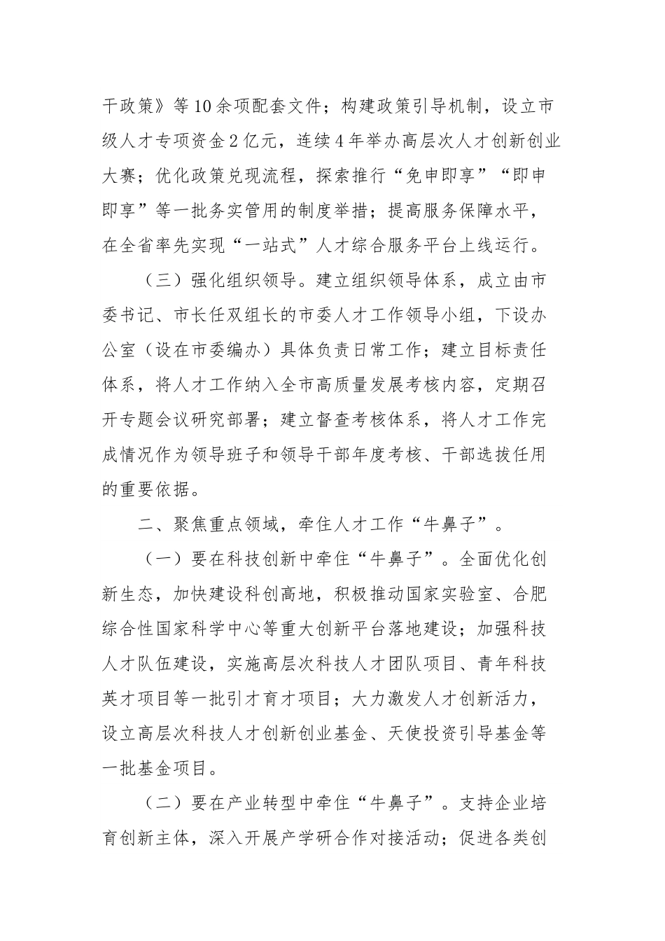 市委人才办关于人才工作的研讨发言各位青年朋友们,同志们:大家好!非常高兴参加今天的青年人才交流座谈会。今天我围绕“聚焦‘三地一区’战略定位,加强新时代人才工作”这一主题与大家进行交流探讨。习近平总书记在中央人才工作会议上强调,做好新时代人才工作必须坚持正确政治方向,不断加强和改进知识分子工作,鼓励人才深怀爱国之心、砥砺报国之志,主动担负起时代赋予的使命责任。近年来,市委、市政府深入贯彻落实习近平总书记关于做好新时代人才工作的重要思想,坚持以服务发展为导向、以人才需求为牵引、以体制机制创新为突破口,大力实施人才强市战略,持续深化人才发展体制机制改革,积极营造识才敬才用才的良好环境,全市人才队伍规模不断壮大、结构持续优化、素质明显提升。根据会议安排,现将有关工作进展情况汇报如下:一、聚焦顶层设计,抓牢人才工作“方向盘”。(一)把牢坐标定位。认真落实中央和省委人才工作会议精神,对标市第十四次党代会和市委“一改两为五做到”要求,制定我市《关于加强新时代人才工作的实施意见》,明确了今后五年的工作目标、重点任务和保障措施。(二)完善政策体系。建立人才政策集中制度,先后出台《市高层次人才培养引进办法》《市支持科技创新若干政策》等10余项配套文件;构建政策引导机制,设立市级人才专项资金2亿元,连续4年举办高层次人才创新创业大赛;优化政策兑现流程,探索推行“免申即享”“即申即享”等一批务实管用的制度举措;提高服务保障水平,在全省率先实现“一站式”人才综合服务平台上线运行。(三)强化组织领导。建立组织领导体系,成立由市委书记、市长任双组长的市委人才工作领导小组,下设办公室(设在市委编办)具体负责日常工作;建立目标责任体系,将人才工作纳入全市高质量发展考核内容,定期召开专题会议研究部署;建立督查考核体系,将人才工作完成情况作为领导班子和领导干部年度考核、干部选拔任用的重要依据。二、聚焦重点领域,牵住人才工作“牛鼻子”。(一)要在科技创新中牵住“牛鼻子”。全面优化创新生态,加快建设科创高地,积极推动国家实验室、合肥综合性国家科学中心等重大创新平台落地建设;加强科技人才队伍建设,实施高层次科技人才团队项目、青年科技英才项目等一批引才育才项目;大力激发人才创新活力,设立高层次科技人才创新创业基金、天使投资引导基金等一批基金项目。(二)要在产业转型中牵住“牛鼻子”。支持企业培育创新主体,深入开展产学研合作对接活动;促进各类创新要素向企业集聚,加快建设国家级高新区、经开区等创新载体;帮助企业解决实际困难,设立高层次人才创新创业专项扶持资金、企业技术改造专项扶持资金等一批扶持项目。(三)要在乡村振兴中牵住“牛鼻子”。全力打造新时期“三农”工作队伍,选派科技特派员到基层开展技术服务;大力培养本土人才,实施农村实用人才带头人示范培训项目、“百名乡土专家下乡”等一批本土人才培养项目;着力引进外部人才,每年遴选千名左右大学生村官和“三支一扶”人员到农村基层服务锻炼。三、聚焦改革创新,稳住人才工作“基本盘”。(一)深化人才发展体制机制改革。推进人才管理体制改革,建立健全市场化配置的人才评价体系和激励机制;完善事业单位人才管理制度,实行岗位管理制度和动态调整制度;推动企业建立健全人才培养机制、使用机制、评价机制和激励机制。(二)多元化育才引才用才机制建设。深化产学研合作模式,鼓励高校院所与企业共建研发平台、共享科研资源;加强政府、市场、社会三方协作,充分发挥企业在引才聚才中的主体作用;加快构建全方位公共人才服务体系,通过搭建线上线下相结合的招聘平台等方式为企业精准引才;健全科学合理的人才评价体系,逐步形成以创新能力、质量、贡献为导向的分类评价体系。(三)营造识才敬才用才的良好环境。持续提高宣传覆盖面和影响力,利用主流媒体、新媒体等多种方式广泛宣传优秀典型事迹;牢固树立正确用人导向,严格落实公务员职务职级并行制度和事业单位岗位管理制度改革;不断优化人才公共服务水平,提供便捷高效的一站式服务。我的发言到此结束,谢谢大家!