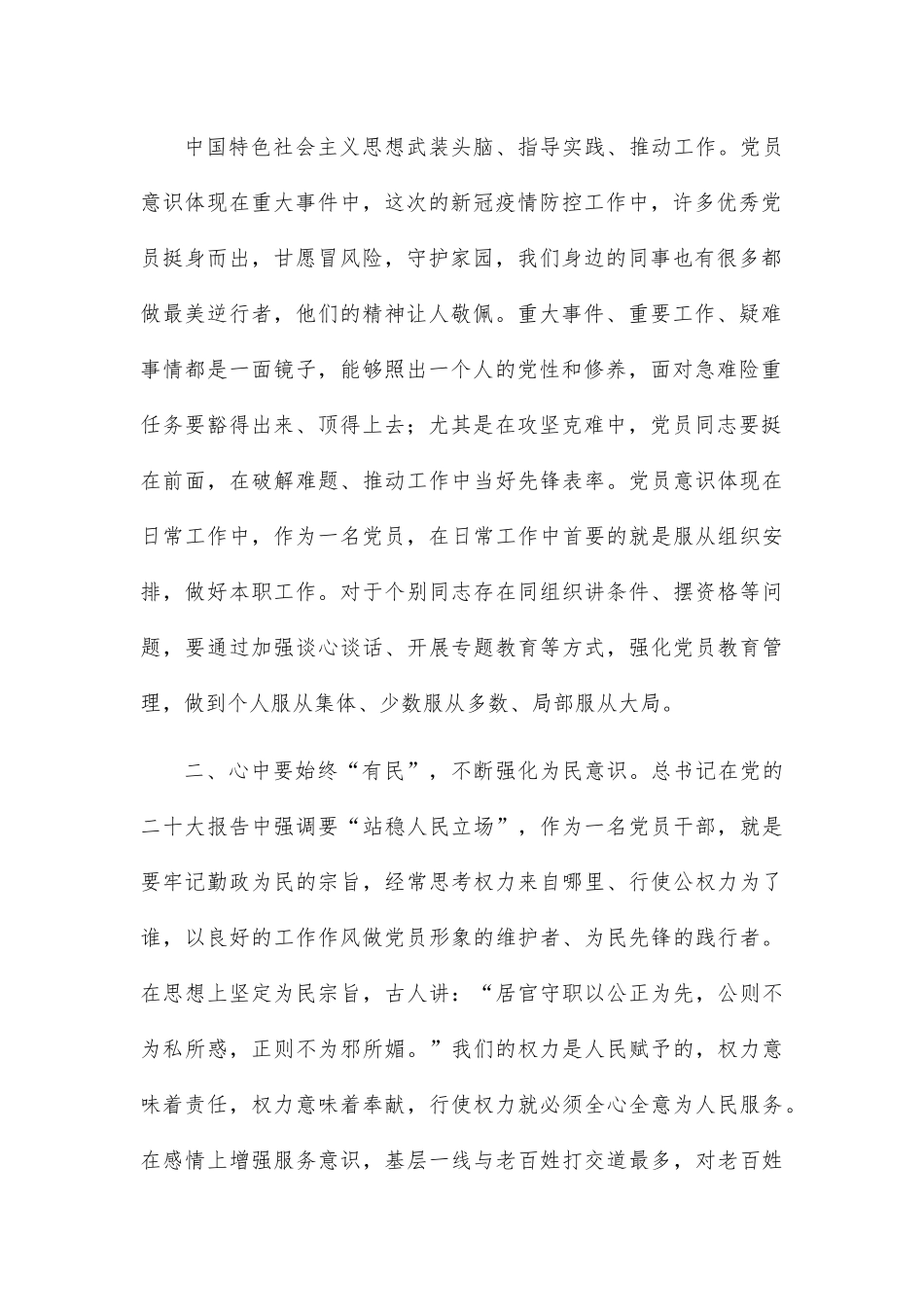 书记在中心组集中学习上的发言同志们,根据此次党委理论中心组集中学习的安排,下面我结合自己学习党的二十大报告的学习心得及本职工作中的感悟,以“四有、四强化”为主题汇报交流。党的二十大报告强调要“全面从严治党”。党的二十大后,中央、省纪委监委通报了*、*等严重违法违纪案件,这是对全体党员的再教育、再提醒,通过学习,我更加深刻认识到,作为领导干部,要按照总书记“心中有党、心中有民、心中有责、心中有戒”的要求,身正为范、做出样子,严格加强自律、努力做好表率。一、心中要始终“有党”,不断强化党员意识,。牢记自己是一名共产党员的第一身份,牢记“不忘初心、牢记使命”的第一要求,坚守“对党忠诚”的第一政治品格,不断增强党员意识。通过警示教育反面典型素材可以发现,违法违纪原因千万条,背离党员初心使命是第一条。要以反面典型为镜鉴,加强党员意识锤炼。党员意识体现在理论学习中,深入学习习近平总书记系列重要讲话精神,学习党章和党的纪律规定,不断用习近平中国特色社会主义思想武装头脑、指导实践、推动工作。党员意识体现在重大事件中,这次的新冠疫情防控工作中,许多优秀党员挺身而出,甘愿冒风险,守护家园,我们身边的同事也有很多都做最美逆行者,他们的精神让人敬佩。重大事件、重要工作、疑难事情都是一面镜子,能够照出一个人的党性和修养,面对急难险重任务要豁得出来、顶得上去;尤其是在攻坚克难中,党员同志要挺在前面,在破解难题、推动工作中当好先锋表率。党员意识体现在日常工作中,作为一名党员,在日常工作中首要的就是服从组织安排,做好本职工作。对于个别同志存在同组织讲条件、摆资格等问题,要通过加强谈心谈话、开展专题教育等方式,强化党员教育管理,做到个人服从集体、少数服从多数、局部服从大局。二、心中要始终“有民”,不断强化为民意识。总书记在党的二十大报告中强调要“站稳人民立场”,作为一名党员干部,就是要牢记勤政为民的宗旨,经常思考权力来自哪里、行使公权力为了谁,以良好的工作作风做党员形象的维护者、为民先锋的践行者。在思想上坚定为民宗旨,古人讲:“居官守职以公正为先,公则不为私所惑,正则不为邪所媚。”我们的权力是人民赋予的,权力意味着责任,权力意味着奉献,行使权力就必须全心全意为人民服务。在感情上增强服务意识,基层一线与老百姓打交道最多,对老百姓的疾苦体会的也会更深。通过警示教育反面典型素材可以发现,许多违法违纪最初的表现就是作风问题。有没有坚守初心、背离宗旨,群众的感受最直接,也最有发言权。仁者爱人、推己及人,如何平衡好事多人少的压力、群众的多样需求等的关系,考验着党员的能力、考验着党员的宗旨意识,要怀有一心为民的情怀,对老百姓多一些耐心,多换位思考、多替老百姓考虑。在行动上保持务实本色,作风上的实与虚,折射的是思想上的公与私。出于公心才会踏踏实实、群众满意。具体在抓工作过程中,就是要做实事、创实绩,以老百姓的获得感来检验我们的工作,以实实在在的工作业绩提升政府公信力。三、心中要始终“有责”,不断强化担当意识。“为官避事平生耻”。对领导干部来说,发现问题就是水平,回避矛盾就是失职,勇于担当就是态度,破解难题就是业绩。基层单位人员多、办公分散,“一岗双责”责任重大,要做到守土有责、守土尽责。在严格管理上勇于担当,要做到廉政纪律、党员教育逢会必讲,常常念念紧箍咒、常常提提醒、扯扯袖。以后要更加注重风险预防,加强对重点岗位公职人员的监督和交流;要坚持问题导向,及时发现执行、管理、安保等方面的细微问题,第一时间抓好整改;要敢抓敢管、敢于批评、敢于碰硬、敢于同不正之风作斗争。在攻坚克难上勇于担当,面对改革发展深层次矛盾问题要迎难而上、攻坚克难;面对队伍管理中长期存在的问题要着眼长效、全力解决;面对公职人员的个人困难、思想波动要及时关注、加强关爱;面对“疑难杂症、顽瘴固疾”要依法依规、全力攻克。在创先争优上勇于担当,聚焦当前工作中的问题、群众普遍关心的问题,以抓铁有痕、踏石留印的精神抓好解决,以问题的解决推动工作的创新;聚焦*、*等工作...
