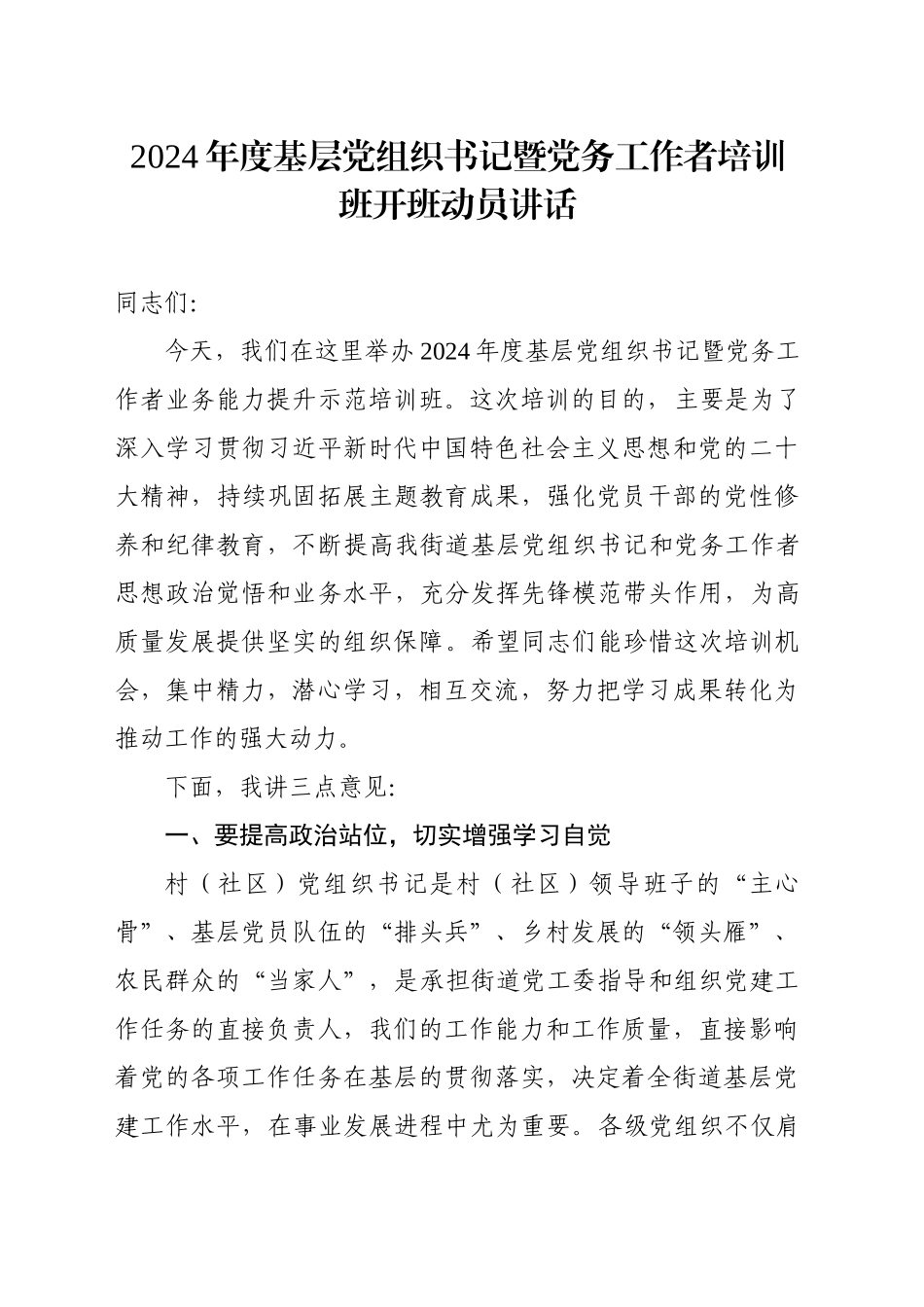 2024年度基层党组织书记暨党务工作者培训班开班动员讲话同志们:今天,我们在这里举办2024年度基层党组织书记暨党务工作者业务能力提升示范培训班。这次培训的目的,主要是为了深入学习贯彻习近平新时代中国特色社会主义思想和党的二十大精神,持续巩固拓展主题教育成果,强化党员干部的党性修养和纪律教育,不断提高我街道基层党组织书记和党务工作者思想政治觉悟和业务水平,充分发挥先锋模范带头作用,为高质量发展提供坚实的组织保障。希望同志们能珍惜这次培训机会,集中精力,潜心学习,相互交流,努力把学习成果转化为推动工作的强大动力。下面,我讲三点意见:一、要提高政治站位,切实增强学习自觉村(社区)党组织书记是村(社区)领导班子的“主心骨”、基层党员队伍的“排头兵”、乡村发展的“领头雁”、农民群众的“当家人”,是承担街道党工委指导和组织党建工作任务的直接负责人,我们的工作能力和工作质量,直接影响着党的各项工作任务在基层的贯彻落实,决定着全街道基层党建工作水平,在事业发展进程中尤为重要。各级党组织不仅肩负着加强基层组织和党员队伍建设的艰巨任务,还承担着繁重的经济社会发展建设任务,只有不断加强思想政治、政策理论和业务技能等方面内容的学习,进一步提高自身综合素质,才能更好地适应新形势下各项工作要求,更好地推动党的各项方针政策贯彻落实,保障经济社会健康持续快速发展。一要做讲政治守规矩的榜样表率。4月16日,党工委已正式启动在党员中开展党纪学习教育,大家要以此次集中培训和党纪学习教育为契机,逐章逐条逐字通学习新修订的《中国共产党纪律处分条例》,做到学纪、知纪、明纪、守纪,搞清楚党的纪律规矩是什么,弄明白能干什么、不能干什么,进一步强化纪律意识、加强自我约束、提高免疫能力,增强政治定力、纪律定力、道德定力、抵腐定力,始终做到忠诚干净担当,坚定拥护“两个确立”,坚决做到“两个维护”,切实把思想和行动统一到党中央决策部署和省委、州委、市委工作要求上来,带领党员干部听党话、跟党走。二要做抓党建工作的行家里手。要熟练掌握发展党员、收缴党费、转接组织关系、民主评议党员、开展谈心谈话等基础党务工作。要熟练掌握“三会一课”、组织生活会、党员教育培训和管理监督等党内政治生活的有关政策要求、工作流程等,按照“保证数量、提升质量、丰富内容、创新方式”的要求,促使党内政治生活真正严起来、实起来、活起来、规范起来,不断提升针对性和实效性。三要做为民服务的先锋模范。要树立正确政绩观,把抓好党建作为最大的政绩,把从严治党责任承担好、落实好,坚持党建工作和中心工作、业务工作一起谋划、一起部署、一起考核,每条战线、每个领域、每个环节都要以党建工作为引领,把中心工作、业务工作抓具体、抓深入、抓落实,实现两手抓、两促进、两加强。二、要强化知行合一,激发干事创业动力我们在学习中要紧密联系街道工作和自己的思想工作实际,力求解决一些实际问题。要把这次学习培训的过程变成对自己思想工作经历的一个回顾总结过程,变成对知识经验的一个积累深化过程,变成对今后工作实践的一个创新提高过程。希望大家以此次培训为契机,充分发挥“头雁领航”效应,带头学习提高、带头争创佳绩、带头服务群众、带头遵纪守法、带头弘扬正气,着力提升勤学善学的能力、服务全局的能力、联系群众的能力、狠抓落实的能力,真正成为懂业务的“高手”、推动发展的“能手”和干事创业的“好手”。三、要抓实培训纪律,确保培训取得实效这次集中培训,党建办制定了详细的培训方案,做了大量的准备工作。本次参加授课的老师、党政班子成员也精心准备了课程内容,希望大家珍惜这个学习的机会,严格要求,虚心学习。一要增强学习的主动性。同志们平时都很忙,把大家组织起来进行集中学习,很不容易,机会难得。参加培训的所有同志都要集中精力,认真学习,保证有所收获,有所启迪。二要勤于思考,做到学以致用。这次培训相对集中,大家要勤记录、多思考,知晓党的二十大精神,懂得如何做一名合格党员,学会怎样做好表率。三要严格要求,遵守纪律。这次培训安排时间短,内容多,...