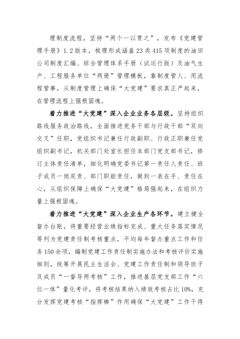 XX国企党建引领高质量发展经验做法近年来,**公司党委始终坚持“抓党建从生产出发,抓生产从党建入手”,持续巩固拓展党史学习教育成果,建立健全管党治党工作体系,采用PDCA循环管理程序,全面构建“大党建”工作格局,在完善顶层设计、弘扬石油精神、千万吨建设等方面充分发挥“大党建”优势与作用公司党委做到了勘探开发战线延伸到哪里哪里就有党旗飘扬、急难险重任务出现在哪里哪里就有共产党员的身影,积极推动党建工作与生产经营工作目标衔接、过程融合、落实同步,取得了良好成效。一、在完善顶层设计上突出“大党建”地位,把党建工作与治理体系现代化相融合,进一步推动党组织的政治领导力转化为生产力着力推进“大党建”深入企业治理全领域。清醒认识加强党的领导、加强党建工作是国有企业的独特优势、光荣传统,将党建工作总体要求纳入企业章程,深入推进治理体系和治理能力现代化,修订完善“三重一大”决策制度和党委议事规则,明确4类90项须由党委会审定的决策事项,从治理体系顶层设计上确保“大党建”格局真正建起来,在公司治理上强根固魂。着力推进“大党建”深入企业管理全链条。不断优化管理制度流程,坚持“两个一以贯之”,发布《党建管理手册》1.2版本,梳理形成涵盖23类415项制度的油田公司制度汇编、综合管理体系手册(试运行版)及油气生产、工程服务单位“两册”管理模板,靠制度管人、用流程管事,从制度管理上确保“大党建”要求真正严起来,在管理流程上强根固魂。着力推进“大党建”深入企业业务各层级。坚持组织路线服务政治路线,全面推进党务干部与行政干部“双向交叉”任职,党组织书记兼任行政副职、行政正职兼任党组织副书记,机关部门处室长担任本部门党支部书记,修订主体责任清单,细化明确党委书记第一责任人责任、班子成员一岗双责、部门职能责任,做到一表在手、责任在心,从组织保障上确保“大党建”格局强起来,在组织力量上强根固魂。着力推进“大党建”深入企业生产各环节。建立健全督办台账,将重要经营业绩指标完成、重大任务落实情况等列为党建责任制考核重点,平均每年督办重点工作和任务150余项,编制党建工作责任制实施办法和考核评价实施细则,统筹开展民主生活会、党建工作责任制和领导班子及成员“一督导两考核”工作,推进基层党支部工作“六位一体”量化考评,将考核结果纳入绩效考核占比10%,充分发挥党建考核“指挥棒”作用确保“大党建”工作干得好,在检查考核上强根固魂。二、在弘扬石油精神上彰显“大党建”优势,把党建工作与锤炼石油铁军队伍相融合,进一步推动党组织的思想引领力转化为生产力思想教育聚合力。大力弘扬石油先辈篝火旁学“两论”的刻苦作风,落实“第一议题”制度,深入学习习近平总书记在参加**代表团审议、在两次考察时的重要讲话精神,进一步增强“四个意识”,坚定“四个自信”,做到“两个维护”。聚焦“举旗帜、聚民心、育新人、兴文化、展形象”,狠抓宣传思想工作,大力弘扬石油精神、大庆精神铁人精神,凝练了“越是艰苦,越要奋斗奉献,越要创造价值”的柴达木石油精神新时代内涵,成为石油精神和新**精神的重要组成部分。大力开展“转观念、勇担当、高质量、创一流”主题教育,深化石油精神再学习再教育、形势目标任务责任主题教育,邀请老党员讲历史讲创业,员工队伍苦练本领,扎根高原做贡献,“英雄岭上石油人”成为油田形象新名片。建强堡垒聚合力。大力弘扬石油工业优良传统,坚持把支部建在连上,坚持“四同步”“四对接”。3年来400余个基层党组织按期完成换届,党员空白班组“零报告”油田党组织健全率达100%;强化党务干部队伍建设,配强配齐专兼职党务人员238人,占员工总人数的1.5%;聚焦油田改革发展目标,大力实施基层党支部达标晋级、标准化阵地建设、党员先锋创新创效“三大工程”,打造“抓攻树”“一部一品”“三合工作法”“四项工作支撑”“八抓五法”,以及党员星级评比、党员提质增效先锋队等特色党建品牌,年均开展党员攻关项目200多个创效500多万元。党带群团聚合力。大力弘扬石油系统“传帮带”优秀做法,坚持党旗所指就是团旗所向,教育引导团员青年,赓续...