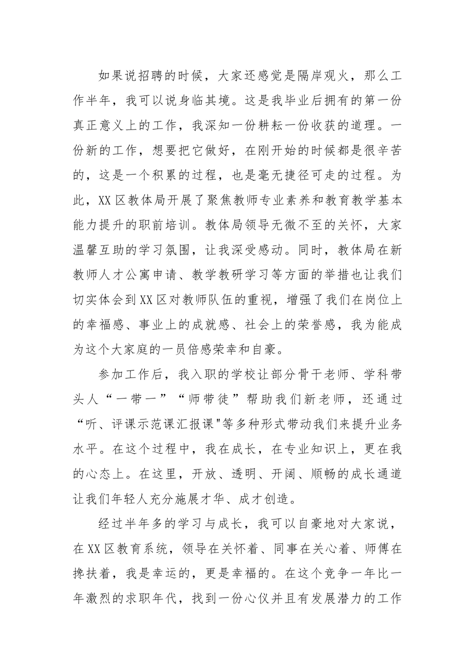校友在区教育系统2023年人才引进山师宣介会上的发言尊敬的各位领导,亲爱的学弟学妹们:大家好!我是母校2022届数学与应用数学专业本科毕业生昃瑞佳,我谨对前来参加宣讲会的各位领导和学弟学妹们表示热烈的欢迎!对给我们提供这次回校宣讲机会的XX区教体局和母校招生就业处的老师们表示衷心的感谢!今天又重新回到了美丽的山师校园,我的心中有着无限的感动。去年毕业走向社会的我通过校园招聘进入XX区教育系统,今天我在这里想跟大家聊聊我在XX区这半年多来的成长历程和最真实的感受。毕业前,我和你们中大部分人一样,很迷茫、彷徨、迫切,所以我怀着一颗懵懂的心到各市区考试,期间有过失落,有过欢喜,有过坚持,同时也有过放弃。而当时,XX区校招信息给包括我在内的需要找工作的大学生送来及时雨,以往的坎坷和艰辛瞬间都被征服。当时我感觉黄河三角洲中心城市XX是个不错的地方,她是国家卫生城市、全国科技进步先进市、中国魅力城市等等,我不再赘述,相信大家多去了解一下XX,也会喜欢上这片充满生机与活力的沃土。圣者有云:遇到某个人,打破你的思维,改变你的习惯,成就你的未来。这种人称之为:贵人。他能改变环境,提供广阔的平台,从而帮助你实现自我价值。很幸运,去年的我遇到了,这就是XX区教育和体育局。如果说招聘的时候,大家还感觉是隔岸观火,那么工作半年,我可以说身临其境。这是我毕业后拥有的第一份真正意义上的工作,我深知一份耕耘一份收获的道理。一份新的工作,想要把它做好,在刚开始的时候都是很辛苦的,这是一个积累的过程,也是毫无捷径可走的过程。为此,XX区教体局开展了聚焦教师专业素养和教育教学基本能力提升的职前培训。教体局领导无微不至的关怀,大家温馨互助的学习氛围,让我深受感动。同时,教体局在新教师人才公寓申请、教学教研学习等方面的举措也让我们切实体会到XX区对教师队伍的重视,增强了我们在岗位上的幸福感、事业上的成就感、社会上的荣誉感,我为能成为这个大家庭的一员倍感荣幸和自豪。参加工作后,我入职的学校让部分骨干老师、学科带头人“一带一”“师带徒”帮助我们新老师,还通过“听、评课示范课汇报课"等多种形式带动我们来提升业务水平。在这个过程中,我在成长,在专业知识上,更在我的心态上。在这里,开放、透明、开阔、顺畅的成长通道让我们年轻人充分施展才华、成才创造。经过半年多的学习与成长,我可以自豪地对大家说,在XX区教育系统,领导在关怀着、同事在关心着、师傅在搀扶着,我是幸运的,更是幸福的。在这个竞争一年比一年激烈的求职年代,找到一份心仪并且有发展潜力的工作很难。如果你跟我有着同样的目标,同样热爱教育事业,欢迎你加入XX区教育,加入这个大家庭,我们一起成长!我相信你会感谢你的选择!