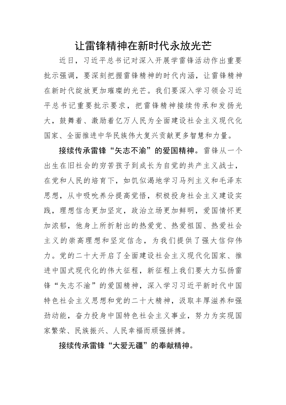 让雷锋精神在新时代永放光芒近日,习近平总书记对深入开展学雷锋活动作出重要批示强调,要深刻把握雷锋精神的时代内涵,让雷锋精神在新时代绽放更加璀璨的光芒。我们要深入学习领会习近平总书记重要批示要求,把雷锋精神接续传承和发扬光大,鼓舞着、激励着亿万人民为全面建设社会主义现代化国家、全面推进中华民族伟大复兴贡献更多智慧和力量。接续传承雷锋“矢志不渝”的爱国精神。雷锋从一个出生在旧社会的穷苦孩子到成长为自觉的共产主义战士,在党和人民的培育下,如饥似渴地学习马列主义和毛泽东思想,从中吸吮养分提高觉悟,积极投身社会主义建设实践,理想信念更加坚定,政治立场更加鲜明,爱国情怀更加浓郁,他身上所折射出的热爱党、热爱祖国、热爱社会主义的崇高理想和坚定信念,为我们提供了强大信仰伟力。党的二十大开启了全面建设社会主义现代化国家、推进中国式现代化的伟大征程,新征程上我们要大力弘扬雷锋“矢志不渝”的爱国精神,深入学习习近平新时代中国特色社会主义思想和党的二十大精神,汲取丰厚滋养和强劲动能,奋力投身中国特色社会主义事业,努力为实现国家繁荣、民族振兴、人民幸福而顽强拼搏。接续传承雷锋“大爱无疆”的奉献精神。雷锋说:“一滴水只有融进大海才不会干涸,一个人只有把有限的生命投入到无限的为人民服务之中去才能充分体现自身价值。”他以一名普通战士的实际行动践行了“全心全意为人民服务”的宗旨,他用一件件平凡的小事成就了不平凡的人生,他以“心中总是装着别人、唯独没有自己”的高尚人格魅力为国家和民族铸就了一种向上向善的道德力量,引领社会主旋律,推动时代向前行。人民利益高于天。新时代传承雷锋精神,就要矢志坚持“以人民为中心”的思想,永葆“为人民谋幸福”的初心,为让群众过上更好生活而扑下身子、甩开膀子、挥洒汗水,真真正正地解决好他们的烦心事、操心事、揪心事,用艰辛付出、无私奉献证明一切努力回报人民、服务人民。接续传承雷锋“忠于职守”的敬业精神。雷锋说:“我愿永远做一个螺丝钉”。他在每个岗位上都忠于职守、兢兢业业,干一行爱一行、专一行精一行,就像一颗“螺丝钉”一样生动展现了“挤”和“钻”的劲头。雷锋感人事迹的背后,折射出一个人无论从事什么职业、处在什么岗位,只要始终保持锲而不舍的韧劲、百折不挠的意志、持之以恒的定力,热爱本职、脚踏实地、精益求精,就一定能在平凡中创造不凡、在拼搏中收获成功。新征程上,前进的道路不会一帆风顺,需要我们付出更为艰苦的努力、更加坚定对事业的执着追求,只要我们每个人都满怀对事业的无比崇敬和热爱,努力发扬“螺丝钉”的“挤”劲和“钻”劲,也同样能在普通的岗位上干出骄人的业绩,使自己的人生更加绚丽多彩。接续传承雷锋“勇争一流”的创新精神。雷锋总是把工作作为一种无穷的动力,善学习、肯钻研、出绝活,以仅有的小学文化水平,在有限的生命中干出了一流业绩,靠的就是锐意进取、自强不息。新征程上,我们所从事的伟大事业越往前推进越需摒弃墨守成规思维,拿出“敢为天下先”的创劲、“勇往直前冲”的闯劲、“永不停步干”的拼劲,先行先试、勇于创新。新时代传承雷锋精神,就要增强“样样争第一、事事当排头”的争先意识,发扬永不懈怠、永不满足的进取精神,敢于同强的比、勇于同优的赛,自我加压、追抢赶超,唯旗必夺、唯先必争,以奋力攀登、勇争一流的执着和坚忍不拔、永不服输的毅力,推动各项工作持续领先、走在前列,努力在自身岗位上创造无愧于历史、时代和人民的辉煌业绩。接续传承雷锋“艰苦奋斗”的创业精神。雷锋有句名言:在工作上要向积极性最高的同志看齐,在生活上要向水平最低的同志看齐。雷锋不仅是这样说的,还是这样做的,他在日常一点一滴、一行一动中,以艰苦奋斗、勤俭节约的作风为我们树立起了光辉榜样。今天,处在全面建设社会主义现代化国家、推进中国式现代化的崭新起点上,我们比历史上任何时候都更需要传承雷锋精神,接过历史的接力棒,跑出新时代的“加速度”,走好我们这一代人的“新长征路”。广大党员干部要大力弘扬雷锋精神,从中汲取无尽智慧和无穷力量,带领人民群众一起“永...