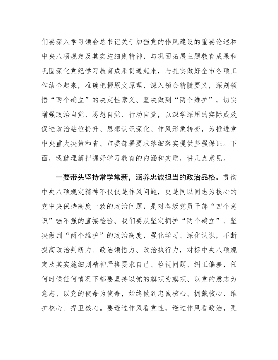 在市委作风建设学习教育读书班上的主持讲话同志们:今天,我们举行市委常委会读书班第二次集中学习,重点学习《关于加强党的作风建设论述摘编》部分内容。下面,请*同志分别领学《关于加强党的作风建设论述摘编》第一、第二、第三专题内容。......刚才,我们集体学习了第一至第三专题,会后大家要加强自学、加深理解,把学习成效转化为锤炼党性、改进作风的高度自觉,转化为增进民生福祉、推动经济社会高质量发展的生动实践。党的十八大以来,以同志为核心的党中央,全力以赴大抓党的建设,从加强党的作风建设开局,从制定和落实中央八项规定破题。在推进全面从严治党的实践中,总书记就加强党的作风建设发表一系列重要讲话、作出一系列重要指示批示,为我们深入推进作风建设指明了前进方向、提供了重要遵循。我们要深入学习领会总书记关于加强党的作风建设的重要论述和中央八项规定及其实施细则精神,与巩固拓展主题教育成果和巩固深化党纪学习教育成果贯通起来,与扎实做好全市各项工作结合起来,准确把握原文原理,深入领会精髓要义,深刻领悟“两个确立”的决定性意义、坚决做到“两个维护”,切实增强政治自觉、思想自觉、行动自觉,以深学深用的实际成效促进政治站位提升、思想认识深化、作风形象转变,为推进党中央重大决策和省、市委部署要求落细落实提供坚强保证。下面,我就理解把握好学习教育的内涵和实质,讲几点意见。一要带头坚持常学常新,涵养忠诚担当的政治品格。贯彻中央八项规定精神不仅仅是作风问题,更是同以同志为核心的党中央保持高度一致的政治问题,是对各级党员干部“四个意识”强不强的直接检验。我们要从坚定拥护“两个确立”、坚决做到“两个维护”的政治高度,强化学习、深化认识,不断提高政治判断力、政治领悟力、政治执行力,对标中央八项规定及其实施细则精神严格要求自己、检视问题、纠正偏差,任何时候任何情况下都要坚持以党的旗帜为旗帜、以党的意志为意志、以党的使命为使命,始终做到忠诚核心、拥戴核心、维护核心、捍卫核心。要透过作风看党性,透过作风看政治,更加注重以谨守作风小节来坚守政治原则、以严格作风要求来严明政治纪律和政治规矩、以防止作风问题来防范政治风险,始终在思想上政治上行动上同以同志为核心的党中央保持高度一致。二要带头坚持常修常炼,答好理想信念的终身课题。作风反映的是形象和素质,体现的是党性,起决定作用的也是党性,必须在解决作风问题的基础上解决好党性问题。我们要透过作风看党性,持之以恒加强理想信念教育,坚持不懈用新时代中国特色社会主义思想改造主观世界,不断强化党的意识、党员意识,增强坚守真理、坚守正道、坚守原则、坚守规矩的政治自觉、思想自觉、行动自觉,以党性的尺子衡量工作得失、把握行为尺度,有的放矢、对症下药,真正做到标本兼治、固本培元。要把贯彻落实中央八项规定及其实施细则精神养成习惯,把铁规矩、硬杠杠内化于心、外化于行,把改进工作作风落实到工作细节之中,见微知著,防微杜渐,析微察异,真正做到学思用贯通、知信行统一。三要带头坚持常思常悟,厚植人民至上的为民情怀。加强干部作风建设,最重要是要抓住保持同人民群众的血肉联系这个核心问题。中央出台八项规定的根本目的就是要改进工作作风、密切联系群众。我们要牢固树立造福人民的政绩观,把握新形势下群众工作的特点和规律,走好新时代党的群众路线,带头改进调查研究、精文减会、厉行勤俭节约等要求,深化整治群众身边不正之风和腐败问题,注重察民情、听民声、解民忧、化民怨,用心用情把惠民生、暖民心、顺民意的工作做实做细做到位,真正以转作风树新风的良好成效取信于民。始终把屁股端端地坐在老百姓的这一面,牢固树立造福人民的政绩观,弘扬为民之风、大兴务实之风、纠治不正之风,严查严纠整治“四风”问题,坚持问题导向,集中整治群众反映强烈的突出问题,深化整治形式主义为基层减负,持续整治群众身边不正之风和腐败问题,让人民群众见到成效、看到变化,以作风建设新成效赢得群众支持和信赖。四要带头坚持常践常行,锤炼担当实干的过硬作风。良好的作风既是凝聚力、执行力,也是...