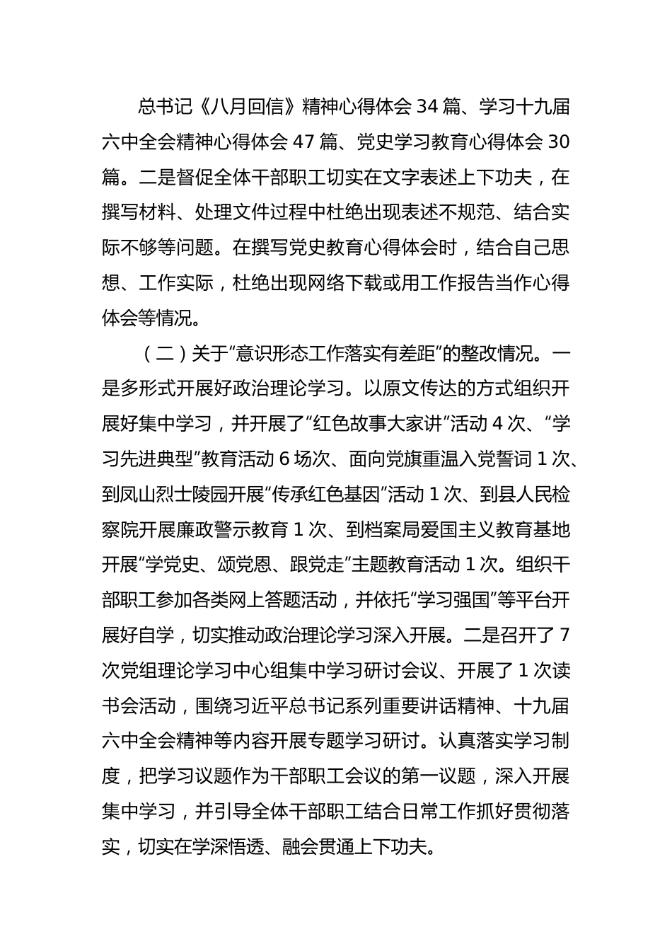 xx县人民政府办公室党组关于巡察整改情况的报告根据县委统一部署,2021年x月xx日至xx月xx日,县委第三巡察组对中共xx县人民政府办公室党组(以下简称县政府办公室党组)进行了巡察。12月9日,县委巡察组向县政府办公室党组反馈了巡察意见。根据《中国共产党党内监督条例》和《中国共产党巡视工作条例》有关规定,现将巡察整改情况予以公布。一、聚焦贯彻落实党的路线方针政策和上级党委决策部署方面(一)关于“党史学习教育不够深入”的整改情况。一是扎实开展党史学习教育,通过组织集中学习与督促开展自学相结合的方式,切实把4本必学书籍、三本简史、习近平新时代中国特色社会主义思想、习近平总书记“八月回信”精神、十九届六中全会精神、习近平总书记在庆祝中国共产党成立100周年大会上的讲话精神等内容学深学透。自党史学习教育开展以来,县政府办开展党组理论中心组学习7场次、读书班(会)1期、干部职工会集中学习15次、“三会一课”集中学习16次、主要领导宣讲2场次,发放4本必学书籍、三本简史52套,为党员、干部提供学习材料,并对学习情况进行抽查检查,推进党史学习走深走实。在学深悟透的基础上,督促党员、干部联系实际工作撰写好心得体会,全体干部职工共撰写习近平总书记在庆祝中国共产党成立100周年大会上的讲话精神撰写心得体会28篇,学习习近平总书记《八月回信》精神心得体会34篇、学习十九届六中全会精神心得体会47篇、党史学习教育心得体会30篇。二是督促全体干部职工切实在文字表述上下功夫,在撰写材料、处理文件过程中杜绝出现表述不规范、结合实际不够等问题。在撰写党史教育心得体会时,结合自己思想、工作实际,杜绝出现网络下载或用工作报告当作心得体会等情况。(二)关于“意识形态工作落实有差距”的整改情况。一是多形式开展好政治理论学习。以原文传达的方式组织开展好集中学习,并开展了“红色故事大家讲”活动4次、“学习先进典型”教育活动6场次、面向党旗重温入党誓词1次、到凤山烈士陵园开展“传承红色基因”活动1次、到县人民检察院开展廉政警示教育1次、到档案局爱国主义教育基地开展“学党史、颂党恩、跟党走”主题教育活动1次。组织干部职工参加各类网上答题活动,并依托“学习强国”等平台开展好自学,切实推动政治理论学习深入开展。二是召开了7次党组理论学习中心组集中学习研讨会议、开展了1次读书会活动,围绕习近平总书记系列重要讲话精神、十九届六中全会精神等内容开展专题学习研讨。认真落实学习制度,把学习议题作为干部职工会议的第一议题,深入开展集中学习,并引导全体干部职工结合日常工作抓好贯彻落实,切实在学深悟透、融会贯通上下功夫。(三)关于“履行职能职责有差距”的整改情况。根据xx县人民政府关于xxx等十三名同志任免职的通知》,xxx同志任xx县人民政府办公室督查专员,免去xx县人民政府研究室副主任职务;xxx同志任xx县信访局局长。2022年1月24日,县政府办印发了《关于调整xx县人民政府办公室领导工作分工的通知》,办公室党组书记、主任、信访局局长xxx,主持县政府办公室及信访局全面工作;xxx职务调整为办公室督查专员,不再出现政府研究室副主任职务。(四)关于“抓班子带队伍推动工作有差距”的整改情况一是认真落实集体讨论决策制度,班子成员进一步提高参政议政能力,充分发挥好参谋助手作用。对相关事项进行讨论时,班子成员充分发表意见、提出工作主张和建议,积极为政府办各项工作开展建言献策。二是认真履行督查督办工作职能,2021年以来,政府督查室对全县重点工作、重点指标、重大项目开展了专项督查4次,开展政府工作报告落实情况专项督查2次、农村厕所问题摸排整改情况专项督查1次、政府主要领导批示件专项督查1次,对111件政协委员提案、人大代表建议进行交办、督办,办复率100%。2022年,对迎春河水环境整治情况、复工复产情况、一季度投资“开门红”工作推进情况、2022年20大工程项目推进情况开展了督查检查,有效推动各项重点工作推进和落实。强化跟踪问效,各联系副主任及秘书股室加强对联系部门工作落实情况的跟踪督办,确保政府重点工作落实到位。适时对办公室各股室工作开展...