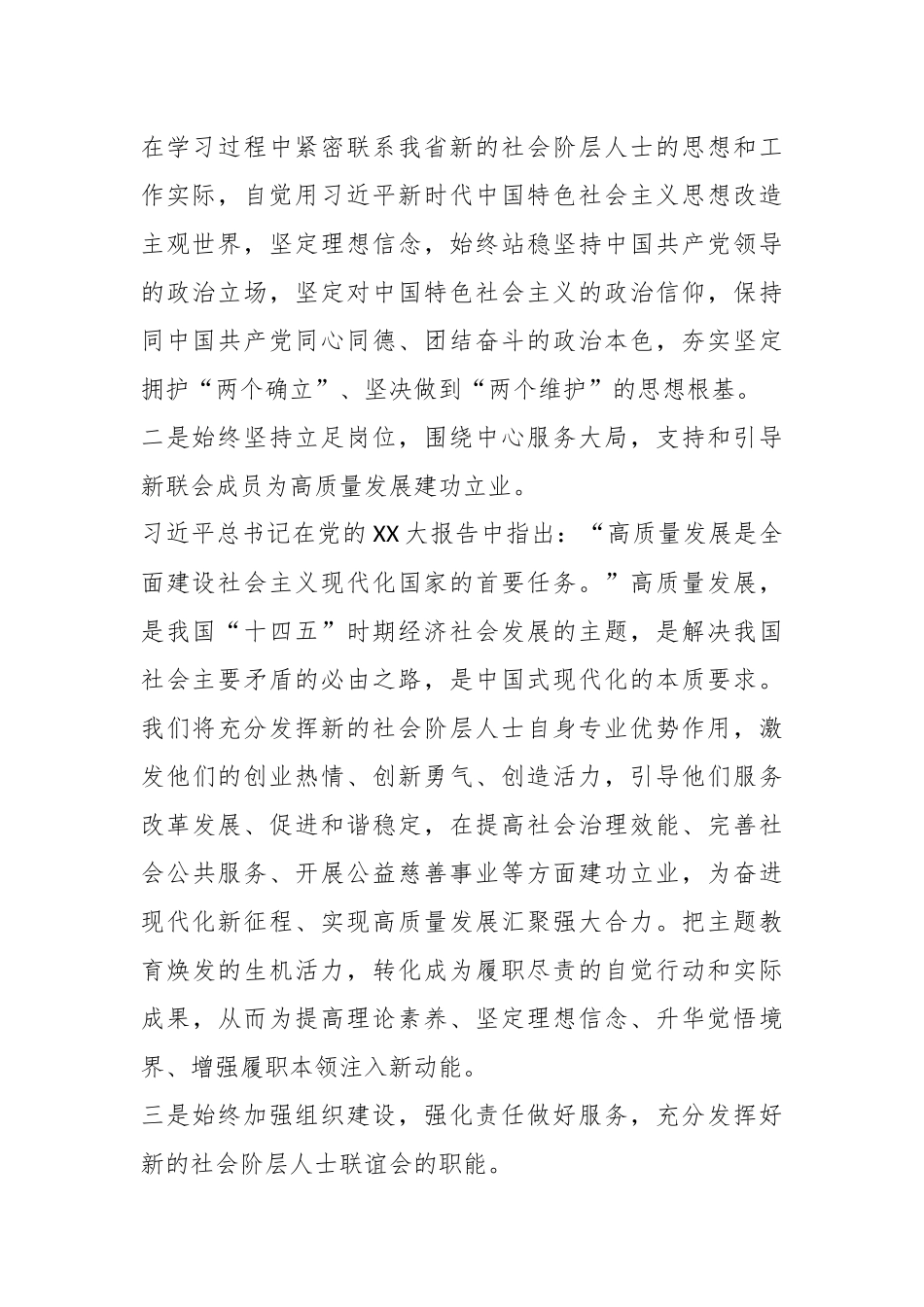 XX在“凝心铸魂强根基,团结奋进新征程”主题活动动员会上的表态发言今天,省委统战部在这里召开各民主党派、无党派人士和党外知识分子、新的社会阶层人士“凝心铸魂强根基、团结奋进新征程”主题教育活动大会,充分体现了省委对新的社会阶层人士的重视和关心。这对引领全省XXX万新的社会阶层人士用习近平新时代中国特色社会主义思想凝心铸魂,为强国建设、民族复兴集智聚力,具有十分重要的意义。对于新阶层人士来说,本次教育活动是一次深刻的思想洗礼,也是一场全面的精神升华,省新联会将带动全省各级新阶层联谊组织立即行动,广泛动员、精心组织,深刻认识开展主题教育的重要意义,准确把握目标任务要求,推动主题教育走深走实。我们决心努力做到以下几个方面:一是始终站稳坚持中国共产党领导的政治立场,坚定对中国特色社会主义的政治信仰,不断增强做好新联会工作的责任感和使命感。习近平总书记在中共XX大报告中指出:“做好新的社会阶层人士工作,强化共同奋斗的政治引领。”坚持党的领导是新联会的政治立场和基本原则,也是新联会做好工作的根本保证。省新联会要充分发挥好统战团体功能,团结带领全省新的社会阶层人士,深化学习党的基本理论和路线方针政策,在学习过程中紧密联系我省新的社会阶层人士的思想和工作实际,自觉用习近平新时代中国特色社会主义思想改造主观世界,坚定理想信念,始终站稳坚持中国共产党领导的政治立场,坚定对中国特色社会主义的政治信仰,保持同中国共产党同心同德、团结奋斗的政治本色,夯实坚定拥护“两个确立”、坚决做到“两个维护”的思想根基。二是始终坚持立足岗位,围绕中心服务大局,支持和引导新联会成员为高质量发展建功立业。习近平总书记在党的XX大报告中指出:“高质量发展是全面建设社会主义现代化国家的首要任务。”高质量发展,是我国“十四五”时期经济社会发展的主题,是解决我国社会主要矛盾的必由之路,是中国式现代化的本质要求。我们将充分发挥新的社会阶层人士自身专业优势作用,激发他们的创业热情、创新勇气、创造活力,引导他们服务改革发展、促进和谐稳定,在提高社会治理效能、完善社会公共服务、开展公益慈善事业等方面建功立业,为奋进现代化新征程、实现高质量发展汇聚强大合力。把主题教育焕发的生机活力,转化成为履职尽责的自觉行动和实际成果,从而为提高理论素养、坚定理想信念、升华觉悟境界、增强履职本领注入新动能。三是始终加强组织建设,强化责任做好服务,充分发挥好新的社会阶层人士联谊会的职能。新联会是党和政府联系新的社会阶层人士的桥梁纽带,是开展新的社会阶层人士统战工作的重要载体,在强化思想引领、培养代表人士、推进政治参与、服务社会民生、加强联谊交流等方面要发挥重要作用。省新联会要主动将推进主题教育与加强联谊组织制度化科学化规范化建设紧紧结合起来,在省委统战部的指导下,进一步适应新时代、新任务的要求,切实加强组织建设,创新工作方式,提高社会化水平。按照《章程》规定,建立健全规章制度,以制度规范行动,保证联谊会工作健康有序开展;定期组织开展形式多样、内容广泛的学习活动;竭尽所能,为会员工作生活学习排忧解难,维护好会员的合法权益;积极沟通,努力为新的社会阶层人士施展才华搭建更广平台,推动政治坚定、素质优良、群众认同的高素质优秀人才不断涌现;结合实际,分层分类打造一大批各具特色的实践创新基地,吸引更多新阶层人士参与进来。总之,省新联会将以本次动员为契机,团结引领全省新阶层人士,坚决贯彻省委统战部的工作部署,通过理论学习调查研究、助力发展、检视整改,确保主题教育落到实处见到实效。我们坚信,通过本次主题教育活动,全省广大新的新的社会阶层人士必将进一步坚定正确政治方向,必将进一步强化使命担当,必将进一步提升能力素质。同时我们坚信,通过本次主题教育活动,我省新的社会阶层人士统战工作也必将继续走在全国前列,呈现出生机勃勃、蒸蒸日上的崭新局面!