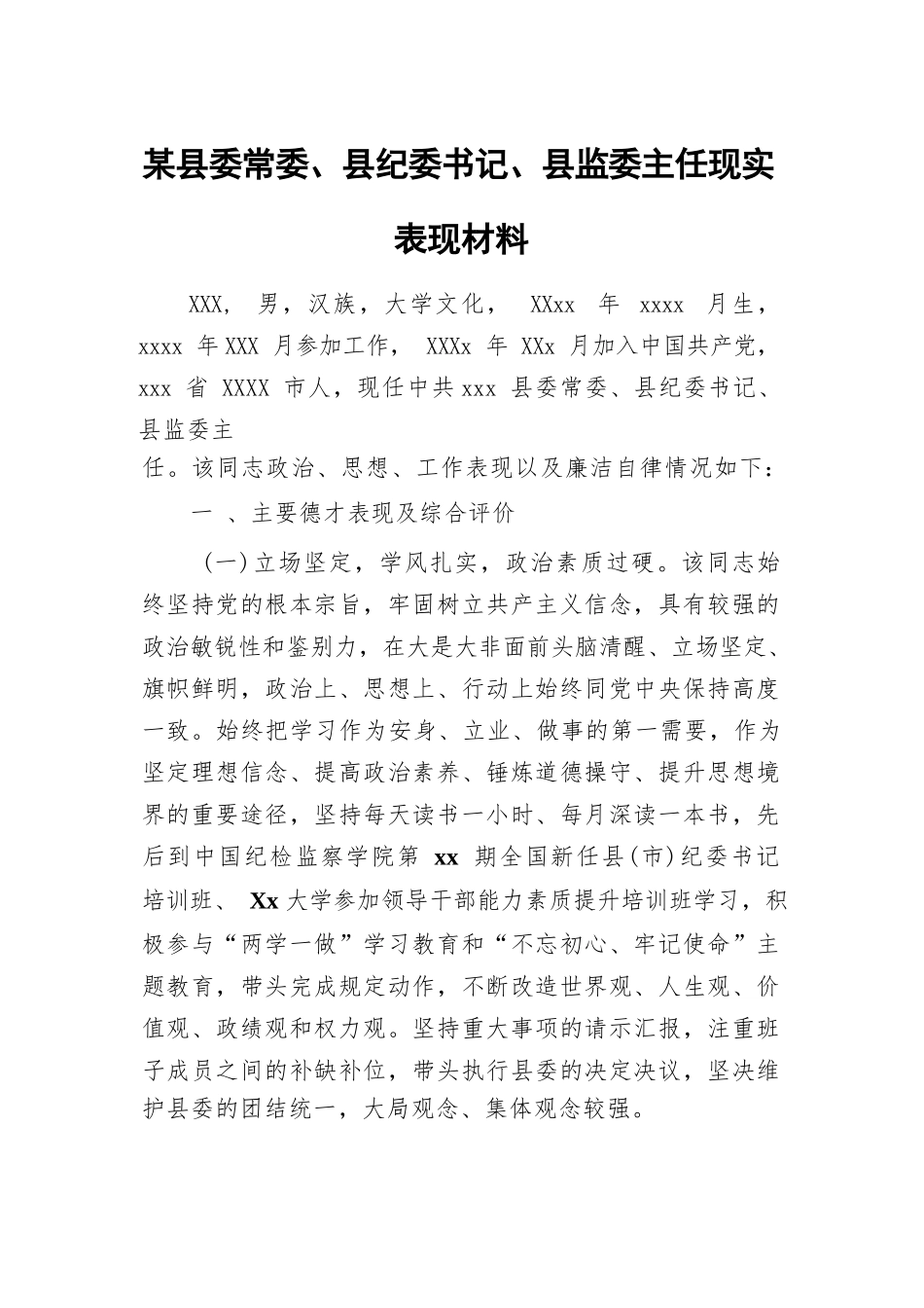 某县委常委、县纪委书记、县监委主任现实表现材料XXX,男,汉族,大学文化,XXxx年xxxx月生,xxxx年XXX月参加工作,XXXx年XXx月加入中国共产党,xxx省XXXX市人,现任中共xxx县委常委、县纪委书记、县监委主任。该同志政治、思想、工作表现以及廉洁自律情况如下:一、主要德才表现及综合评价(一)立场坚定,学风扎实,政治素质过硬。该同志始终坚持党的根本宗旨,牢固树立共产主义信念,具有较强的政治敏锐性和鉴别力,在大是大非面前头脑清醒、立场坚定、旗帜鲜明,政治上、思想上、行动上始终同党中央保持高度一致。始终把学习作为安身、立业、做事的第一需要,作为坚定理想信念、提高政治素养、锤炼道德操守、提升思想境界的重要途径,坚持每天读书一小时、每月深读一本书,先后到中国纪检监察学院第xx期全国新任县(市)纪委书记培训班、Xx大学参加领导干部能力素质提升培训班学习,积极参与“两学一做”学习教育和“不忘初心、牢记使命”主题教育,带头完成规定动作,不断改造世界观、人生观、价值观、政绩观和权力观。坚持重大事项的请示汇报,注重班子成员之间的补缺补位,带头执行县委的决定决议,坚决维护县委的团结统一,大局观念、集体观念较强。(二)思路清晰,真抓实干,工作成效明显。该同志自参加工作以来,先后担任xx县纪委案审室主任、纪检监察室主任、xx县纪委副书记和xx市纪委党风政风监督室副主任、主任,政研室主任(副处级),XXxx年调任xx县委常委、纪委书记县监委主任,一直从事纪检监察工作,业务熟练,思路清晰,作风踏实,取得了一定成绩。积极协助县委落实党风廉政建设主体责任,建立健全了党委主体责任专题研讨。(二)扎实组织开展了纪委机关保持共产党员先进性教育活动。按照上级统一部署和要求,立足纪检监察机关实际,以“标准更高、措施更实、成效更好”为指针,有组织、有领导、有成效地开展了先进性教育活动各个阶段的工作,进一步把纪委党建工作提高到了新水平。(三)以创新统领纪检监察工作,实现了纪检监察工作的提质、提速、提效。一是创造性地开展了领导干部廉洁自律工作。认真实行了廉政谈话、诫勉谈话、述职述廉和廉政鉴定制度,扎实开展了廉政档案构建工作,有重点地对假公济私现象进行了专项检查,使领导干部廉洁自律的自觉性进一步增强。二是进一步加大了查办案件力度。今年以来,共受理信访举报X件次,其中涉及信访案件x起,已结案x起、结案率x%。共初核各类违纪违法线索x起,转立案x起,其中查处大要案两起、实行“两规”一次,在社会上产生了良好的警示效果。三是狠抓了纠风工作。新出台了将党风廉政建设和机关效能建设考核“合二为一”的《党风廉政建设责任制和机关效能建设考核工作实施意见》,强化了对教育收费、医药购销和治理商业贿赂的执法检查,对影响经济发展的“二为、四乱、四难”问题实施了集中整治,从整体上提高了党风政风行风建设质量。四是扎实推进了源头治腐工作。按照“人民群众关注、事关人财物治理、执法权力相对集中”的原则,在广泛征求意见的基础上,在重点岗位开展源头治腐试点工作,进一步探索建立了反腐倡廉长效机制。五是有效加强了反腐倡廉宣传教育工作。以廉政文化建设“六进”活动为主线,主题鲜明地开展了反腐倡廉宣传教育工作,并通过创办“廉政在线”站和《纪检监察信息》简报,加强了反腐倡廉宣传阵地建设,调动了全社会反腐倡廉的积极性。(四)坚持“执纪先正己”,大力加强了纪检监察机关自身建设和干部队伍建设。在纪委、监察局开展了以"内强素质,外树形象,干好工作,做新时期合格的纪检监察干部"为主题的机关建设年活动,在机关内形成了"风正、气顺、心齐,想干、会干、干好”的浓厚氛围。在全县纪检监察干部中深入开展了“做党的忠诚卫士、当群众的贴心人”主题实践活动,提高了纪检监察队伍的整体素质和执纪能力,确保了纪检监察工作顺利开展。二、工作作风和党风廉政情况一是讲大局。坚持把自己定位在甘当配角、积极参政上,充分发挥参谋助手作用,全力配合好“一把手”开展工作,碰到问题及时请示汇报,积极维护集体意志和决策,以自己的一言一行维护好班子团结和班子形象。二是讲作为。在工作中坚持...
