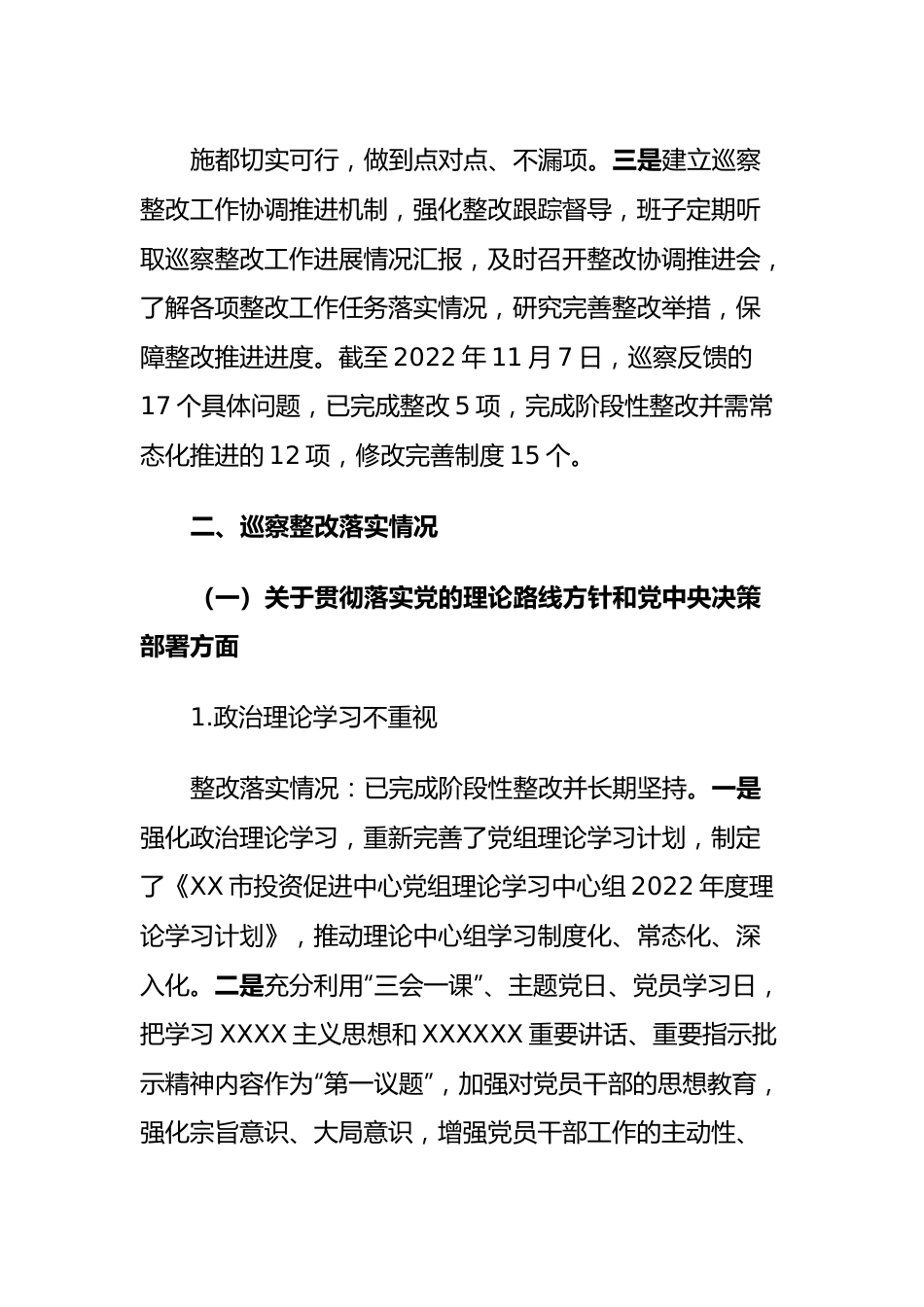XX市投资促进中心关于五届市委第二轮巡察整改进展情况的报告根据市委统一部署,2022年X月22日至2022年X月22日,市委第一巡察组对我中心开展了常规巡察。X月9日,市委巡察组向市投资促进中心党组反馈了巡察意见。按照巡察工作有关要求,现将巡察整改进展情况报告如下。一、巡察整改落实总体情况中心党组坚持把巡察整改作为重大政治任务来抓,切实从增强“四个意识”、坚定“四个自信”、做到“两个维护”的高度,将思想和行动统一到市委的部署要求上来,以高度的思想自觉正视问题,以强烈的紧迫意识改正问题,切实做好整改工作。一是成立整改工作领导小组,由党组书记任组长,其他班子成员任副组长,科室负责人为成员,扎实推进巡察整改工作。班子成员明确分工,党组书记负总责,其他班子成员按照工作分工负责具体整改落实工作,从严从紧从实,逐条逐项抓好落实。二是及时召开巡察整改专题民主生活会,党组班子成员进行深刻剖析、对照检查,开展批评和自我批评,主动认领责任。聚焦市委巡察一组提出的三个方面17个问题,逐项研究制定整改措施,明确具体责任人、责任领导和整改时限,制定整改落实方案,建立整改落实台账,确保每条反馈意见都有针对性的整改措施,每条整改措施都切实可行,做到点对点、不漏项。三是建立巡察整改工作协调推进机制,强化整改跟踪督导,班子定期听取巡察整改工作进展情况汇报,及时召开整改协调推进会,了解各项整改工作任务落实情况,研究完善整改举措,保障整改推进进度。截至2022年11月7日,巡察反馈的17个具体问题,已完成整改5项,完成阶段性整改并需常态化推进的12项,修改完善制度15个。二、巡察整改落实情况(一)关于贯彻落实党的理论路线方针和党中央决策部署方面1.政治理论学习不重视整改落实情况:已完成阶段性整改并长期坚持。一是强化政治理论学习,重新完善了党组理论学习计划,制定了《XX市投资促进中心党组理论学习中心组2022年度理论学习计划》,推动理论中心组学习制度化、常态化、深入化。二是充分利用“三会一课”、主题党日、党员学习日,把学习XXXX主义思想和XXXXXX重要讲话、重要指示批示精神内容作为“第一议题”,加强对党员干部的思想教育,强化宗旨意识、大局意识,增强党员干部工作的主动性、自觉性、系统性和创造性。截止目前,共组织集中学习31次,专题研讨4次,“一把手”讲党课3次,知识测试9次。三是强化监督检查力度。将党员日常学习“学习强国”、参加机关工委组织的线上学习情况纳入年度考核范围,以不定期通报的形式,督促落实。四是实施党员干部职工学习研讨材料由分管领导审签指导制度。2.落实意识形态工作责任制不严格整改落实情况:已完成阶段性整改并长期坚持。一是强化理论武装,凝聚思想共识。把深学细悟XXXXXX关于意识形态重要论述作为一项重要政治任务,不间断地开展学习。截止目前,我中心围绕意识形态、铸牢中华民族共同体意识开展学习2次,研讨1次。二是夯实主体责任,强化制度落实。结合实际,制定了《XX市投资促进中心意识形态工作责任制实施细则》《XX市投资促进中心意识形态阵地管理制度》,截至目前,中心党组专题研究、部署意识形态工作1次。三是6月底,我中心对网站、AAA公众号等意识形态阵地以及意识形态领域相关工作开展了自查,形成了半年分析研判报告。建立了每月对意识形态阵地开展自查自评制度,先后审查公众号文章150余篇,并填写自查自评情况表,目前暂未发现问题。四是健全网站信息审查机制,设置专人负责网站的更新运营工作,编订信息发布审查表及信息发布审核流程图,规范信息发布流程。于12月底对下半年意识形态领域进行分析研判并形成报告。3.招商引资工作谋篇布局不到位整改落实情况:已完成阶段性整改并长期坚持。一是聚焦“两个基地”“四个产业集群”发展定位,围绕全市12条重点产业链,针对产业基础及资源优势,修改完善了《XX市2022年重点项目储备库》。2022年8月4日,召开全市招商引资调度会议,收集各旗县区招商引资项目库822项并梳理归纳,为策划制定2023年重点项目储备库做好准备工作。二是紧紧围绕政府工作报告确定的“全年引进国内到位资金170亿元以上”的任务,1-...