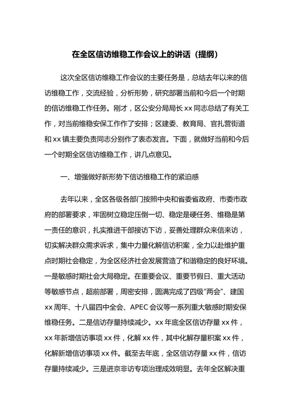 在全区信访维稳工作会议上的讲话(提纲)这次全区信访维稳工作会议的主要任务是,总结去年以来的信访维稳工作,交流经验,分析形势,研究部署当前和今后一个时期的信访维稳工作任务。刚才,区公安分局局长xx同志总结了有关工作,对当前维稳安保工作作了安排;区建委、教育局、官扎营街道和xx镇主要负责同志分别作了表态发言。下面,就做好当前和今后一个时期全区信访维稳工作,讲几点意见。一、增强做好新形势下信访维稳工作的紧迫感去年以来,全区各级各部门按照中央和省委省政府、市委市政府的部署要求,牢固树立稳定压倒一切、稳定是硬任务、维稳是第一责任的意识,扎实推进干部接访下访,妥善处理群众来信来访,切实解决群众需求诉求,集中力量化解信访积案,全力以赴维护重点时期社会稳定,为全区经济社会发展营造了和谐稳定的良好环境。一是敏感时期社会大局稳定。在重要会议、重要节假日、重大活动等敏感节点,超前部署,周密安排,圆满完成了四级“两会”、建国xx周年、十八届四中全会、APEC会议等一系列重大敏感时期安保维稳任务。二是信访存量持续减少。xx年底全区信访存量xx件,xx年新增信访事项xx件,化解xx件,其中化解存量积案xx件,化解新增信访事项xx件。截至去年底,全区信访存量xx件,信访存量持续减少。三是进京非访专项治理成效明显。去年全区解决重点进京非访事项xx件,在全市进京非访化解工作中排名靠前。公安机关对缠访、闹访、进京非访人员果断采取措施,起到了良好警示作用。四是群体性事件处置及时有效。去年共发送各类预警信息xx条,预警短信x.x万条,出动警力xx余人次,妥善处置各类群体性事件xx起、群体访xx起、敏感事件xx余起,各类事件都得到及时有效处置。五是基层工作机制和方法不断创新。各街镇立足实际,建立健全信访维稳工作机制,为维护社会稳定奠定了坚实基础。北园街道、xx街道积极推行前置风险评估工作,对村居换届和xx、xx、徐李片区拆迁等重大事项提前排查评估,发现问题及时解决,有力保障了“两委”换届平稳实施,拆迁工作有序推进。制锦市街道、北坦街道着力加强基层网络建设,建立网格化服务平台,实现了信访维稳工作动态化管理。纬北路街道、南村街道、大桥镇利用救助、疏导、法律援助、信访代理、人民调解等多种方式,妥善化解了一批信访积案难案。xx镇建立群体性突发性事件应急预案,指派专人全程跟踪处理、化解矛盾,集体访得到及时有效处置。堤口路街道依托“暖心工程”平台,发挥感情维稳优势,有效减少了信访案件。药山街道运用法治思维解决信访案件,用法律法规引导群众、疏导情绪,解决了大量初信初访。官扎营街道、宝华街街道妥善解决拆迁遗留问题,千方百计做好稳控工作,信访形势不断好转。天桥东街街道、无影山街道花费大量人力物力财力,积极做好“三跨三分离”重点人员的稳控和接劝返工作。北村街道面对长期缠访闹访的重点人员,盯上靠上做好疏导和稳控工作,确保了辖区和谐稳定。这些成绩的取得,是信访维稳部门和各街镇履职尽责、齐抓共管的结果,信访维稳战线的广大干部职工为此付出了艰辛努力,做了大量卓有成效的工作。在此,我代表区委区政府,向大家表示衷心的感谢和诚挚的问候!在肯定成绩的同时,要清醒地看到,随着改革进入攻坚阶段、发展进入关键时期,世情、国情、社情都在发生深刻而复杂的变化,社会矛盾多样多发、相互交织,信访维稳工作面临的任务仍然艰巨繁重。一是从经济发展新常态看,经济增长速度放缓,带来一些新的矛盾和问题,如部分行业、企业生产经营困难,劳资、债务纠纷增加,非法集资、金融诈骗等涉众型经济犯罪增多,如果处置不当、不及时,很容易传导到社会领域,引发大规模的聚集上访或群体性事件。二是从社会发展的新趋势看,随着新型工业化、信息化、城镇化、农业现代化的发展,社会利益格局发生深刻变化,人们的思想观念、价值取向日益多元化,社会竞争加剧,流动性、开放性增强,由发展差距、收入差距等造成的心理失衡增多,容易引发各种社会问题甚至个人极端事件。三是从市民群众的新期待看,其民主意识、法治意识、权利意识、公正意识、主人翁意识不断增强,不仅盼富裕,也盼安...